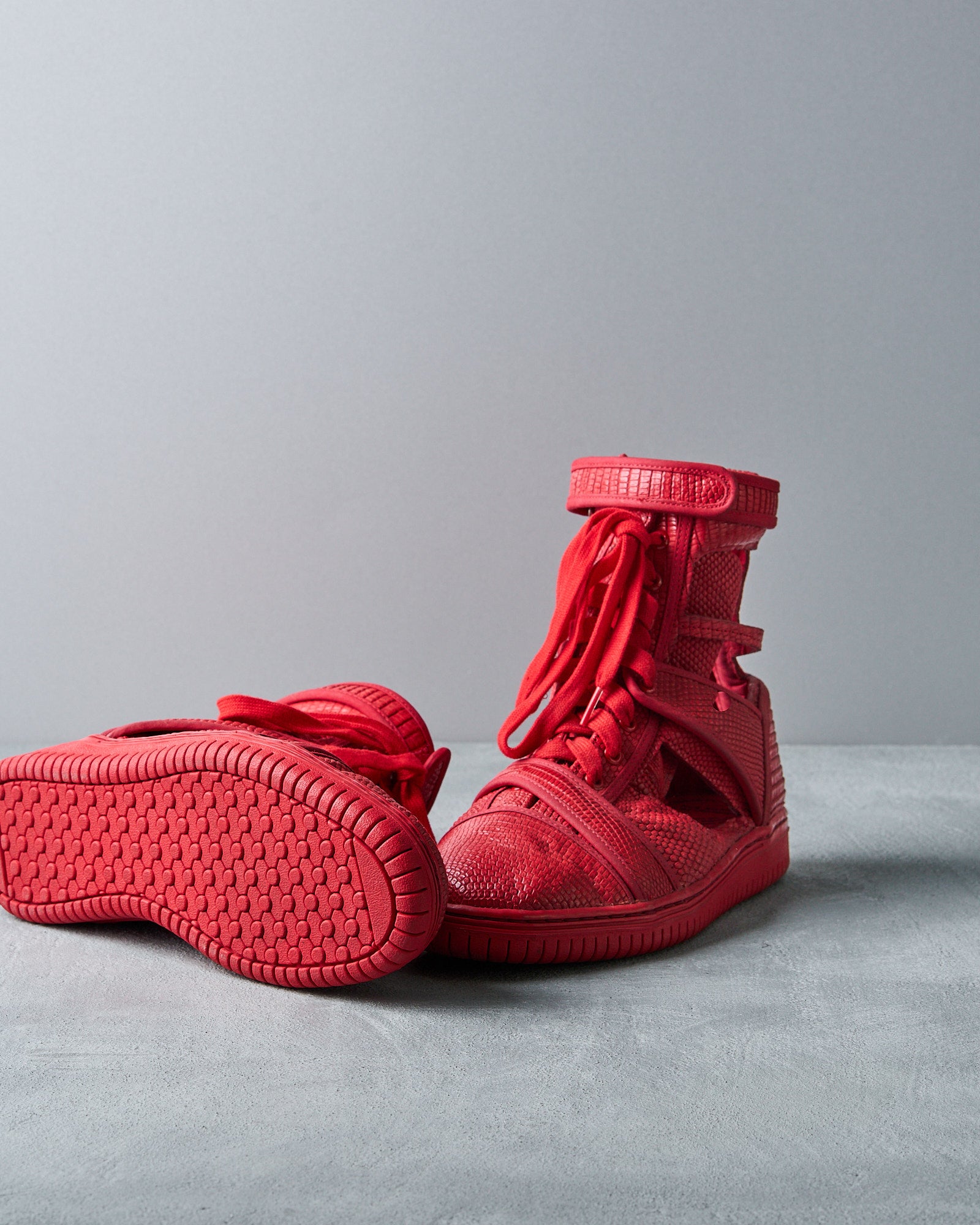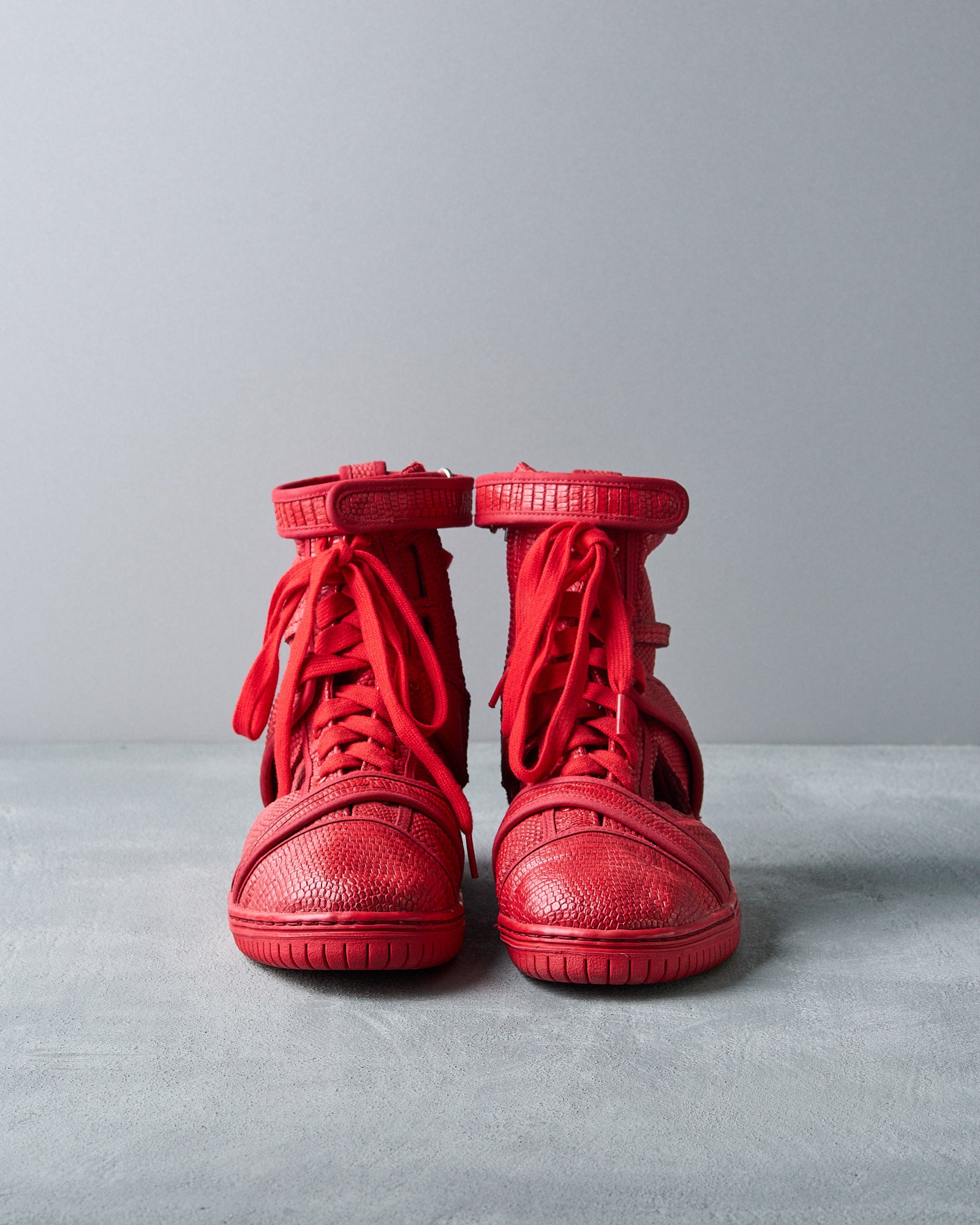 Hi-top lace-up sneakers in vibrant scaled lizard skin. Features velcro ankle strap, padded inner, rubber sole. Meticulous tonal construction throughout. Includes original dustbag.