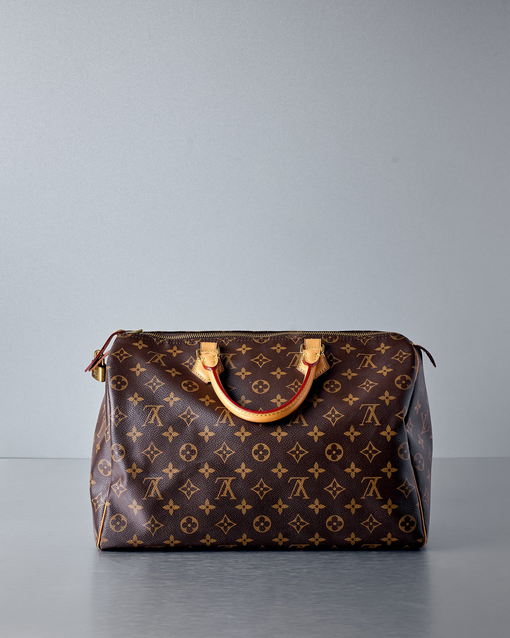 Speedy top-handle bag in brown coated canvas with tan leather detailing. The top zip opens to reveal a spacious internal compartment with sturdy canvas lining. Features an internal zip pocket, external security padlock, gold hardware throughout. Includes both original padlock keys. Room for all your day-to-night needs.