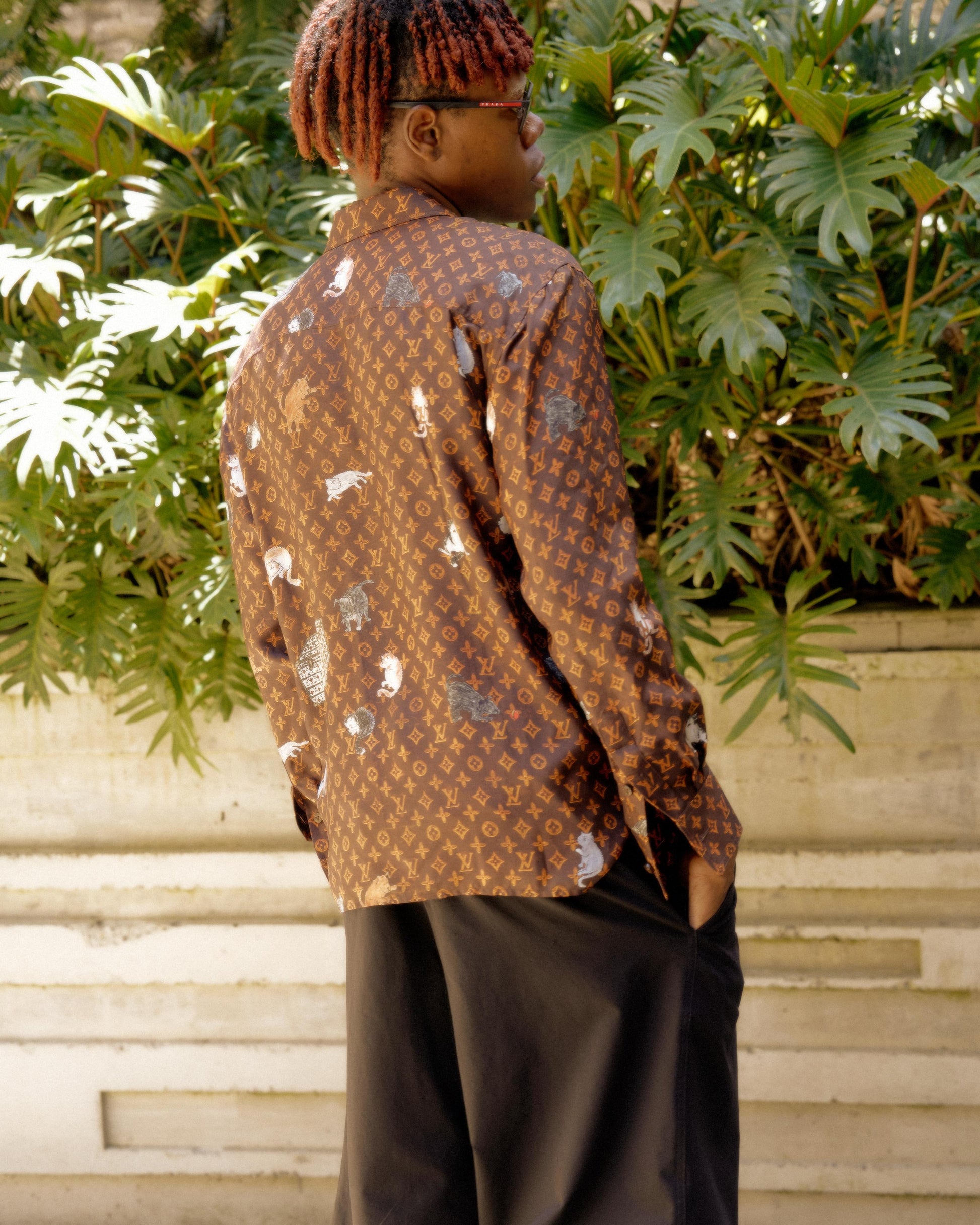 Flowing button-up pyjama style shirt in lightweight silk twill. The shirt's construction has a straight drop and flat hem, providing a more casual silhouette. Features Damier leather buttons, breast pocket, and an all-over print of Coddington's hand-drawn monograms with feline illustrations throughout. Specialist dry clean only.