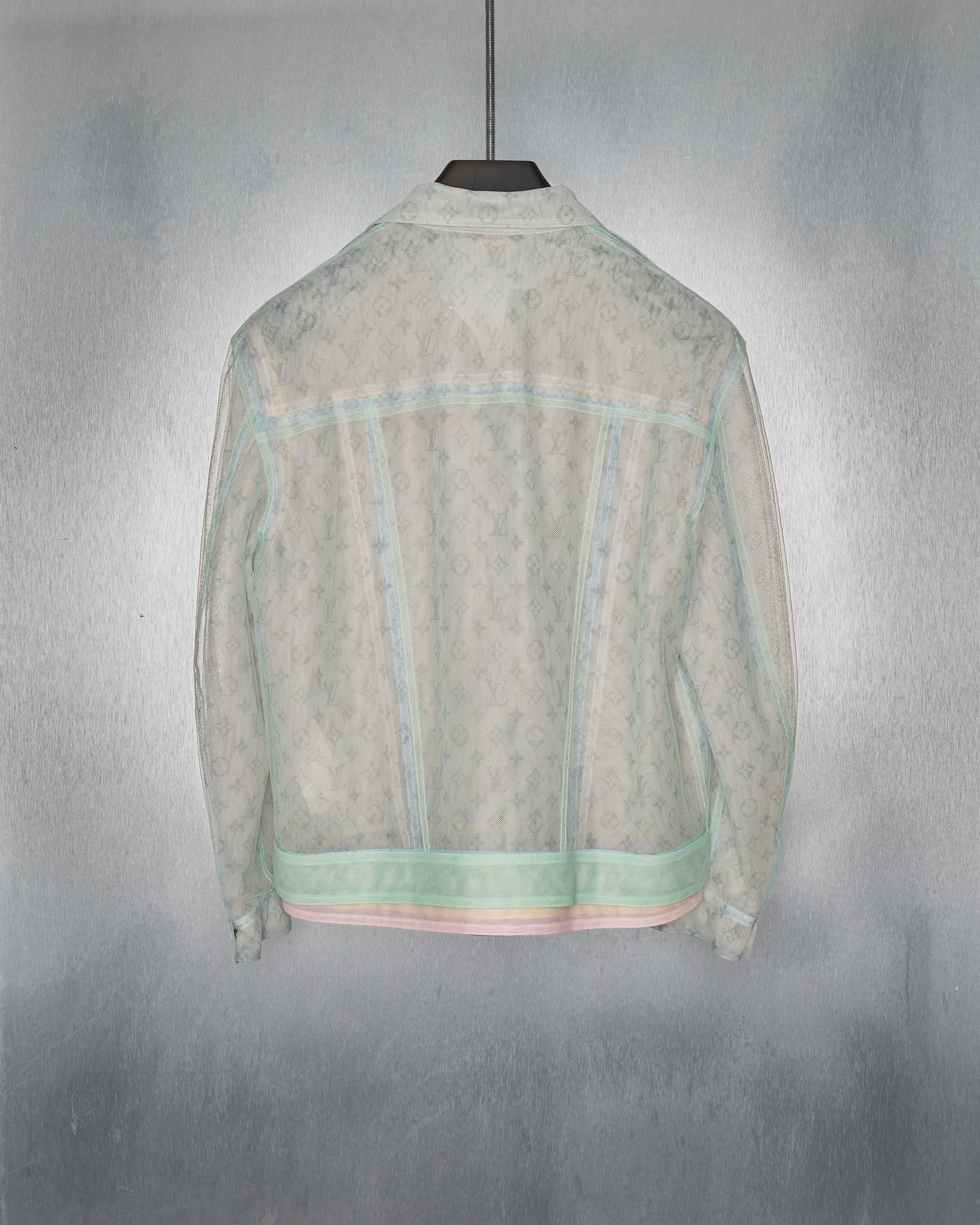 Classic-fit trucker jacket comprised of multiple layers of pastel polyamide monogrammed mesh. Features two breast pockets, wax seal snap button closure, sculptural geometric collar. Dry clean only.
