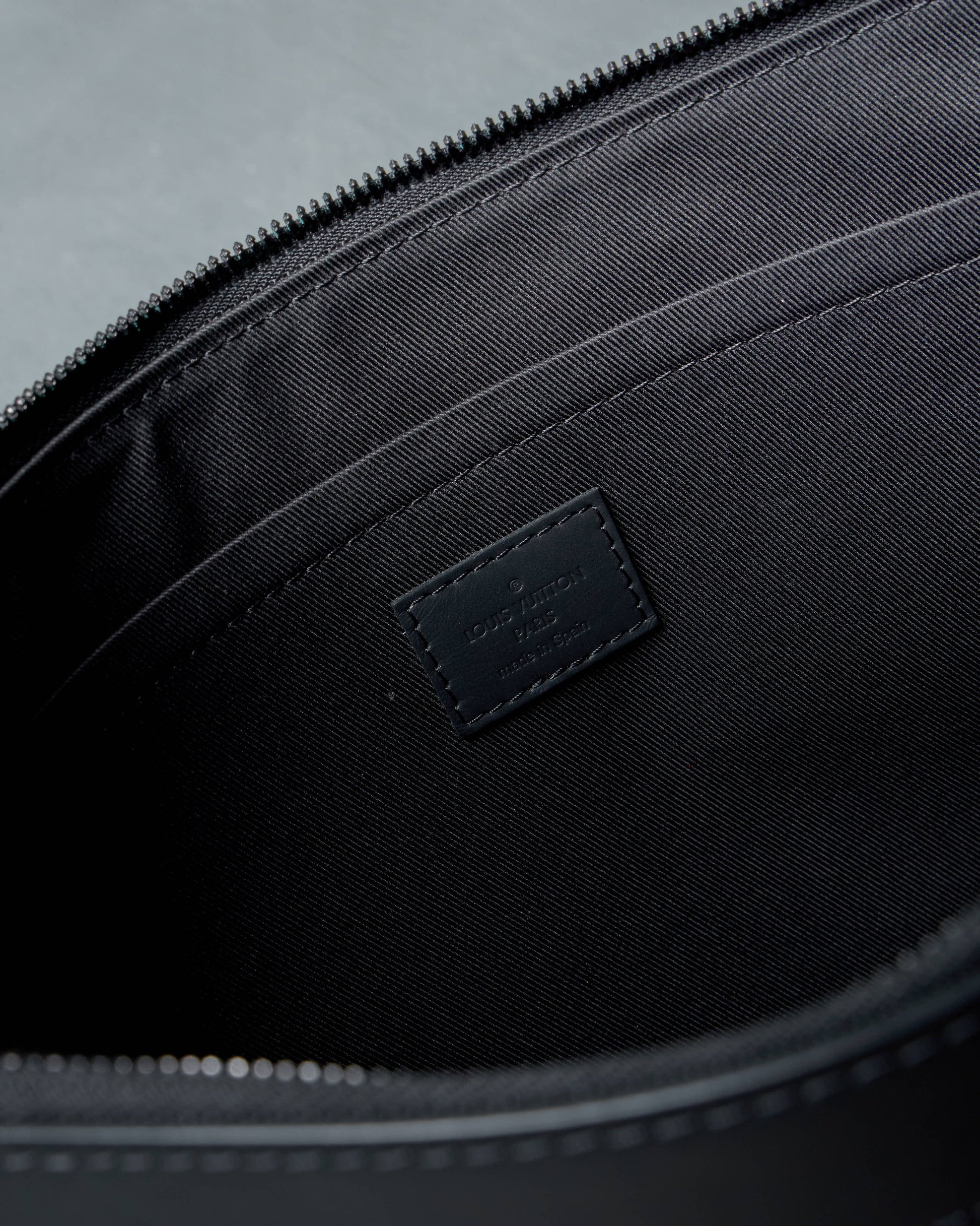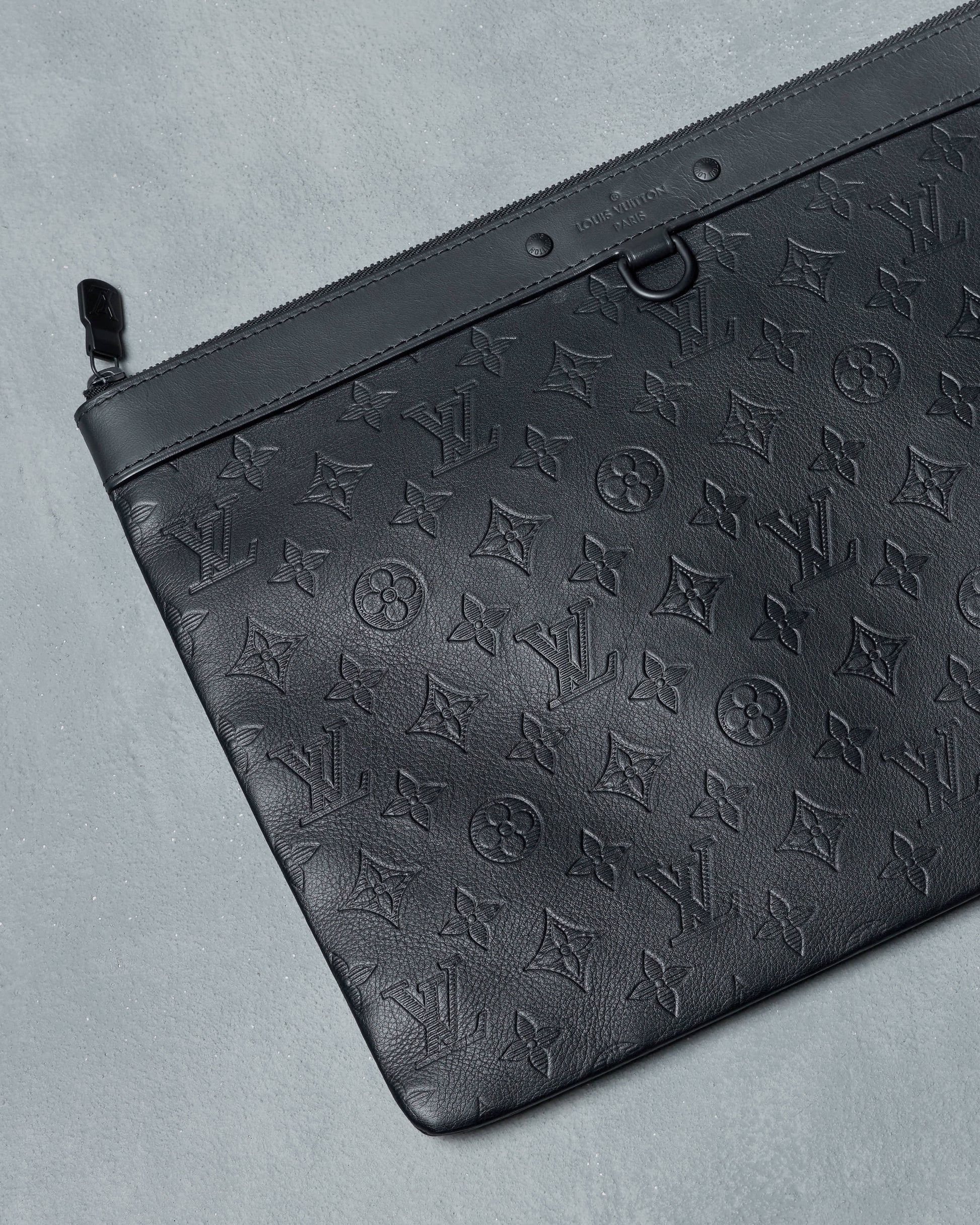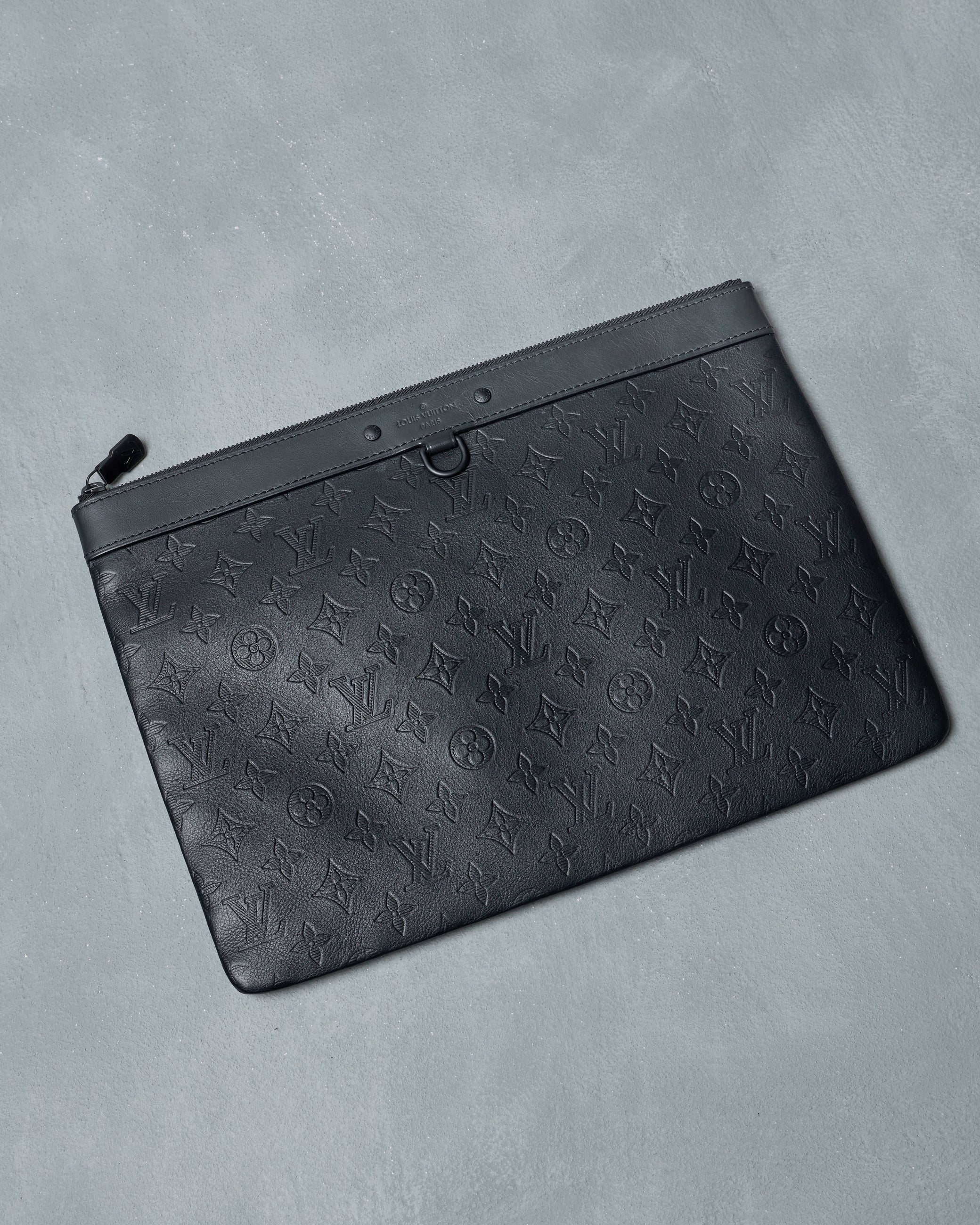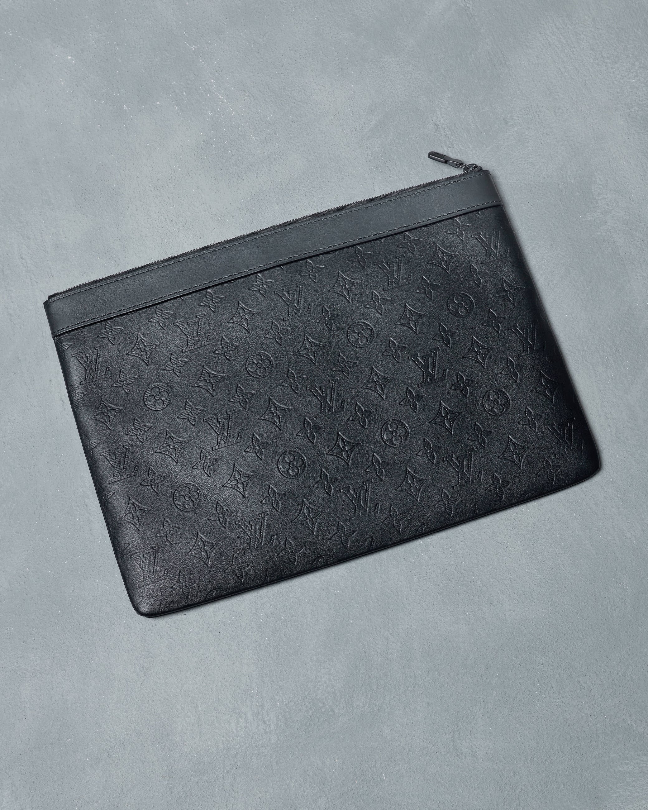 Discovery pochette from Louis Vuitton’s 2020 Monogram Shadow collection in black leather. Features a top zip closure and an interior slip pocket, offering a sleek and practical design for everyday essentials.