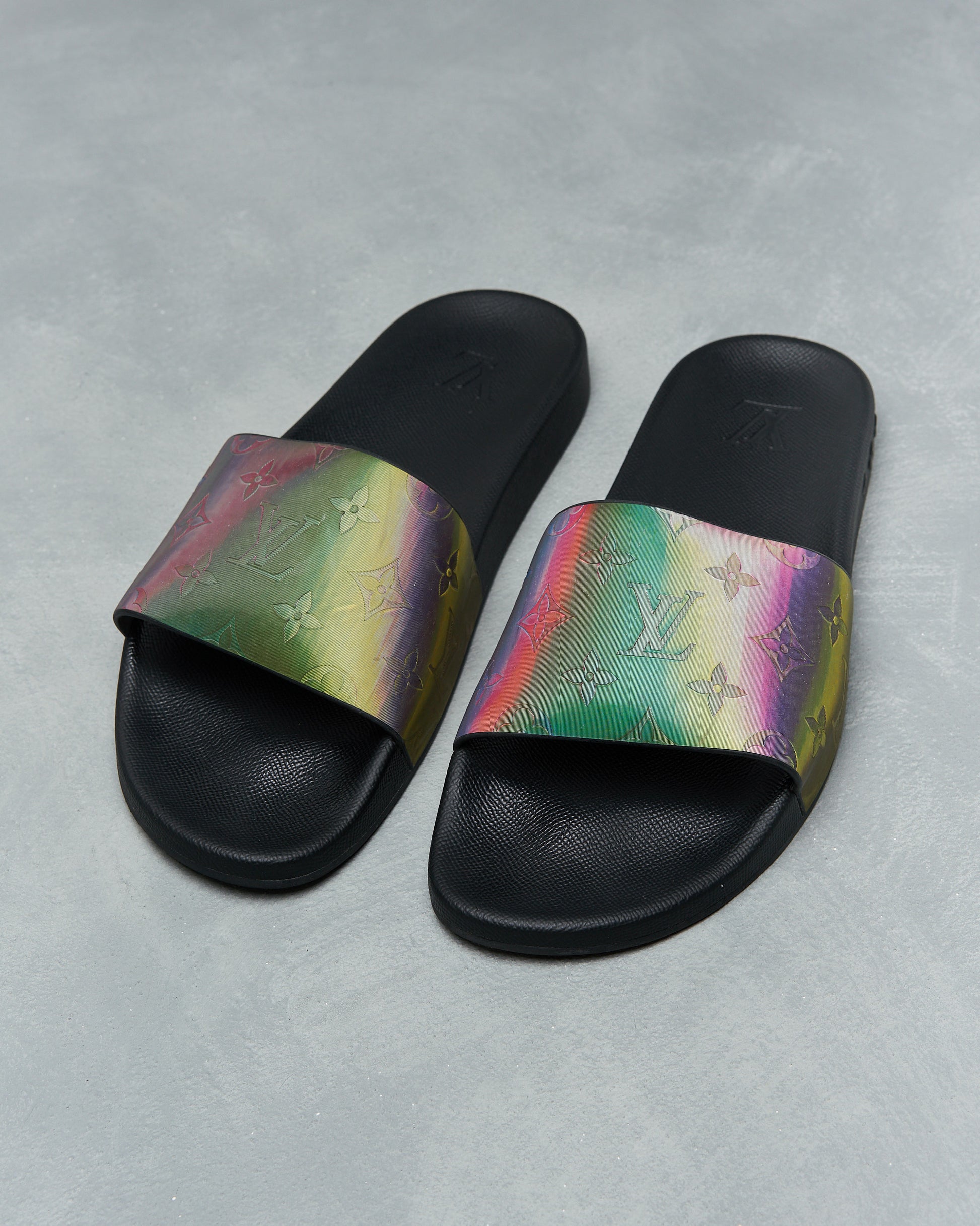 Strap slide in smooth rubber. Features irridescent lenticular straps, debossed monogram on heel, textured grips. 3cm platform.