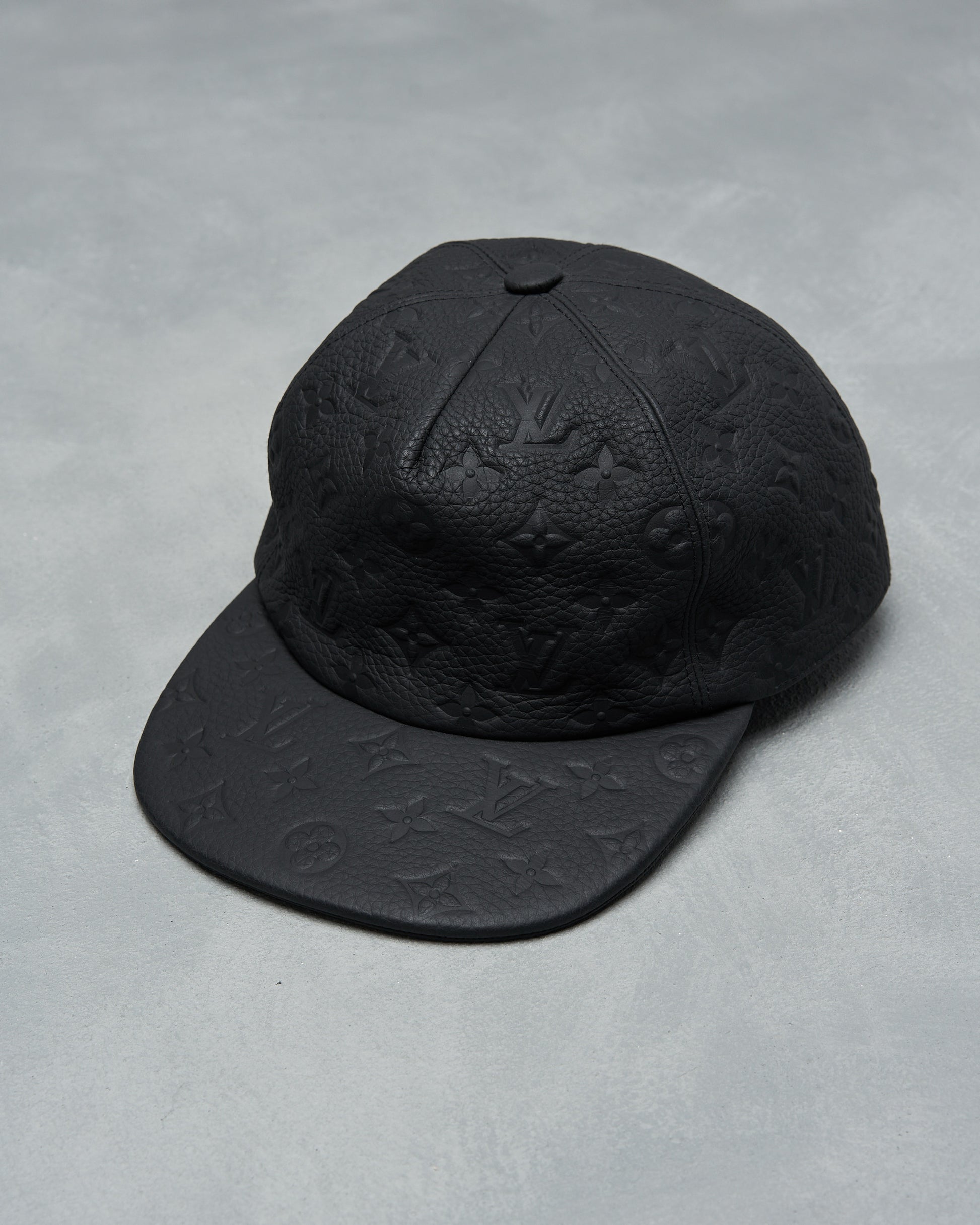 Luxurious in grained leather with Louis Vuitton's iconic monogram embossed throughout. The firm leather provides a structured silhouette and the hat features a flat brim. Powder coated press stud adjustor on back in a vibrant matte orange.