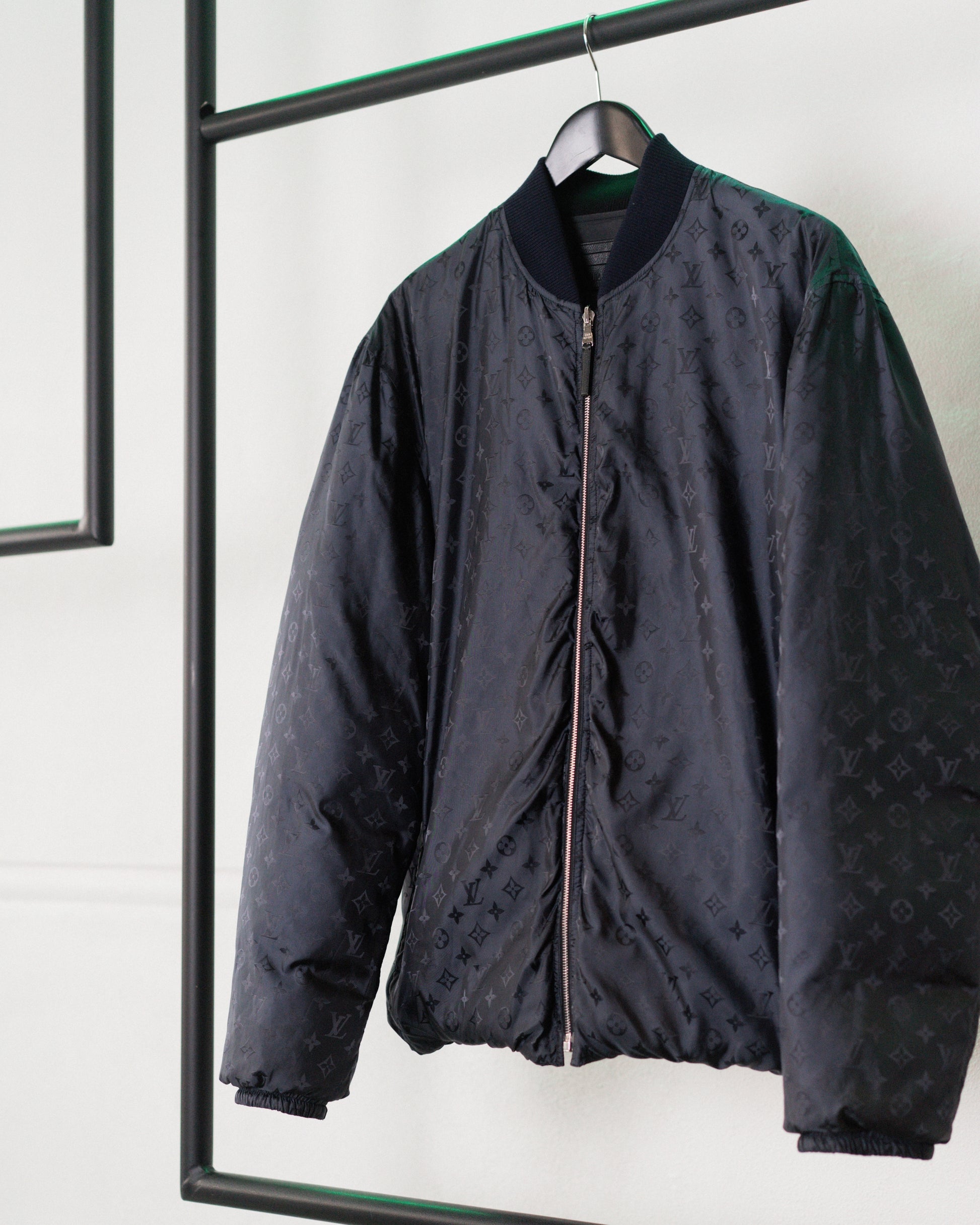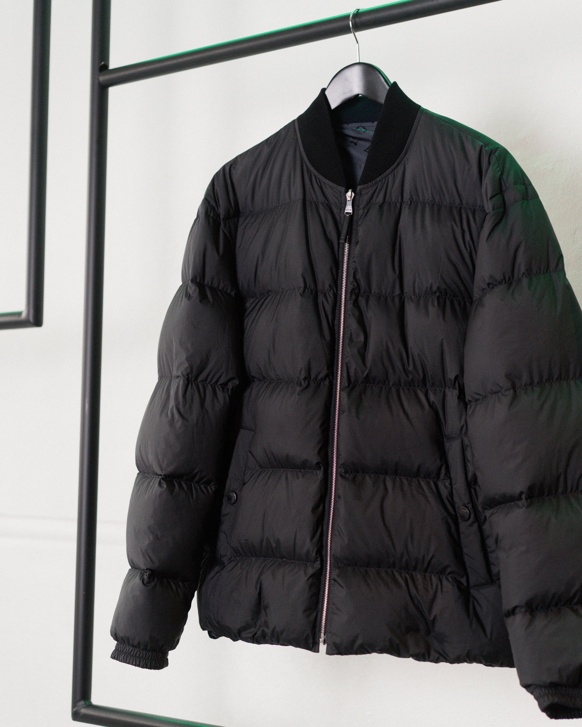Down-filled jacket with an oversized bomber silhouette, ribbed collar, and front zip closure with leather pull. This piece is reversible: a contemporary style with subtle satin monogramming contrasts with the classic exposed baffles which ridge the opposite side. Each side features two external pockets. Super cosy and versatile piece.
