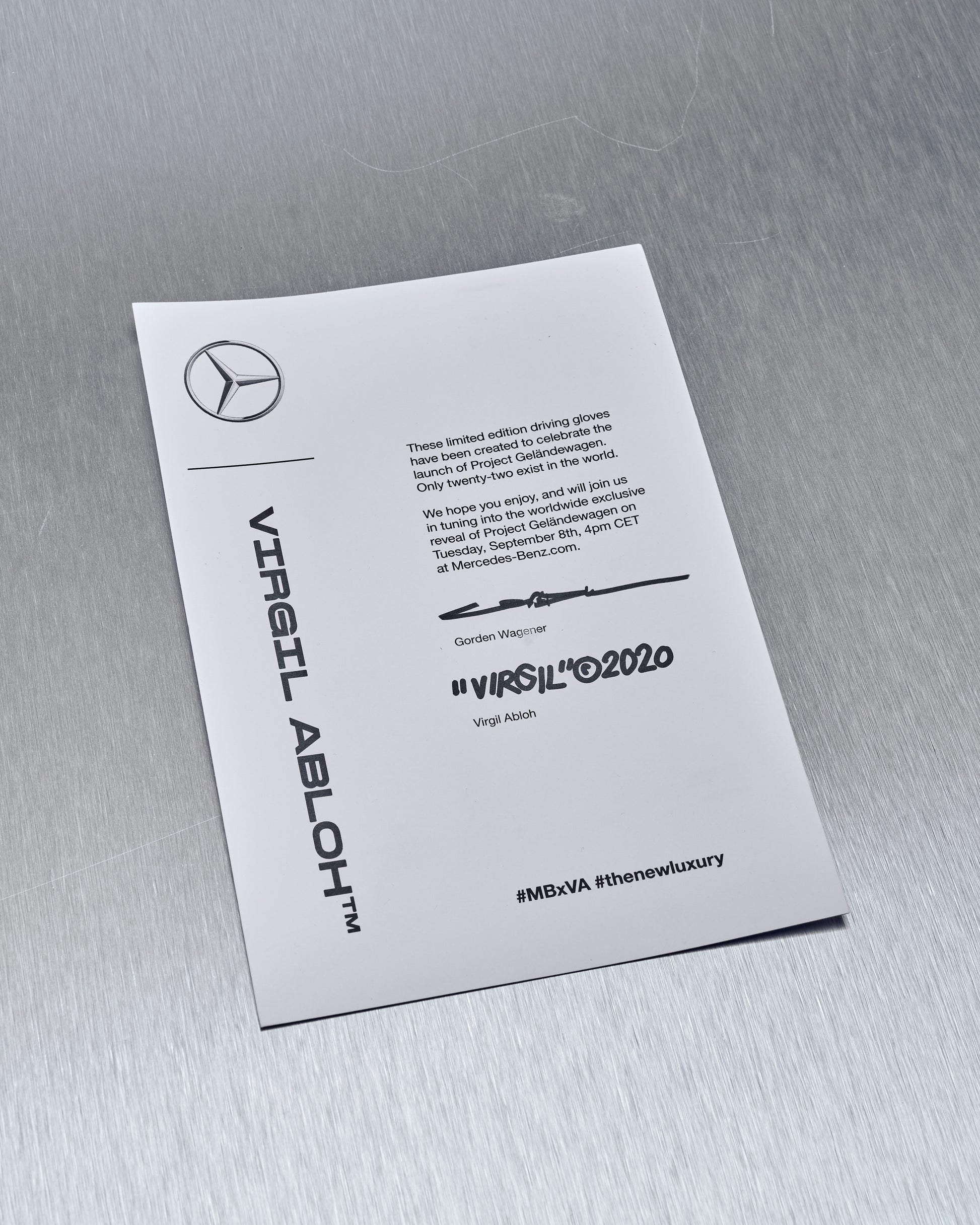 These limited edition driving gloves have been created to celebrate the launch of Project Gelandewagen. Conceptualised by Virgil Abloh and Gorden Wagener, head of design for Mercedes Benz, only 22 pairs were produced and were not available for sale; gifted only to a close friend group of car enthusiasts and design lovers... including designer Don C, singer Ian Isaiah, London DJ Skinny Macho, A$AP Nast and Zack Bia.