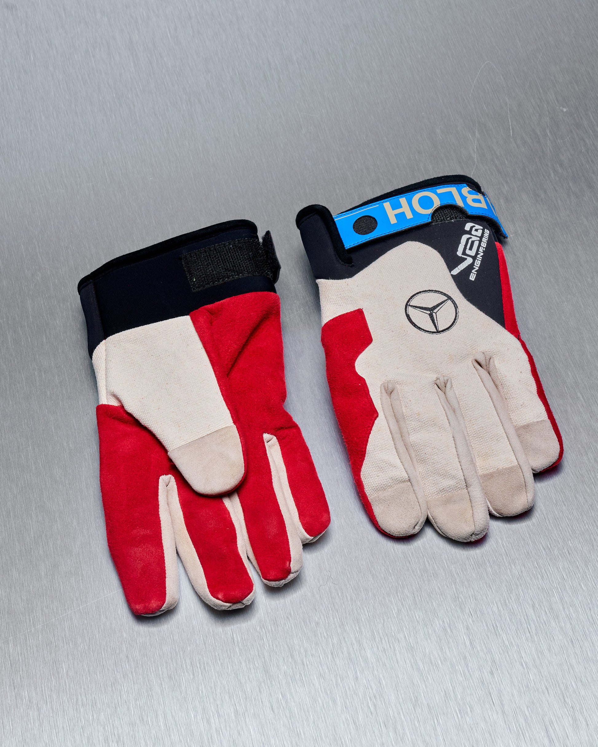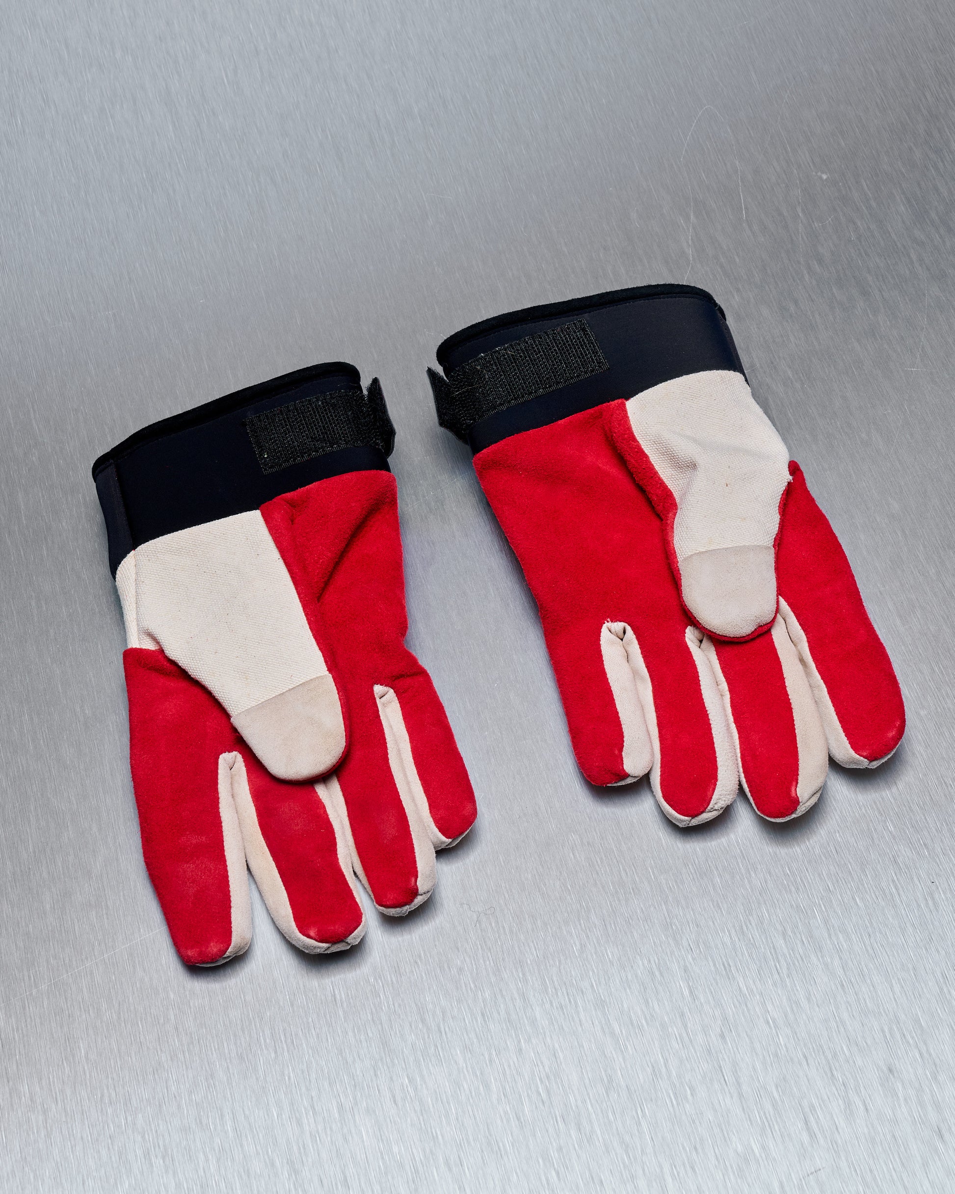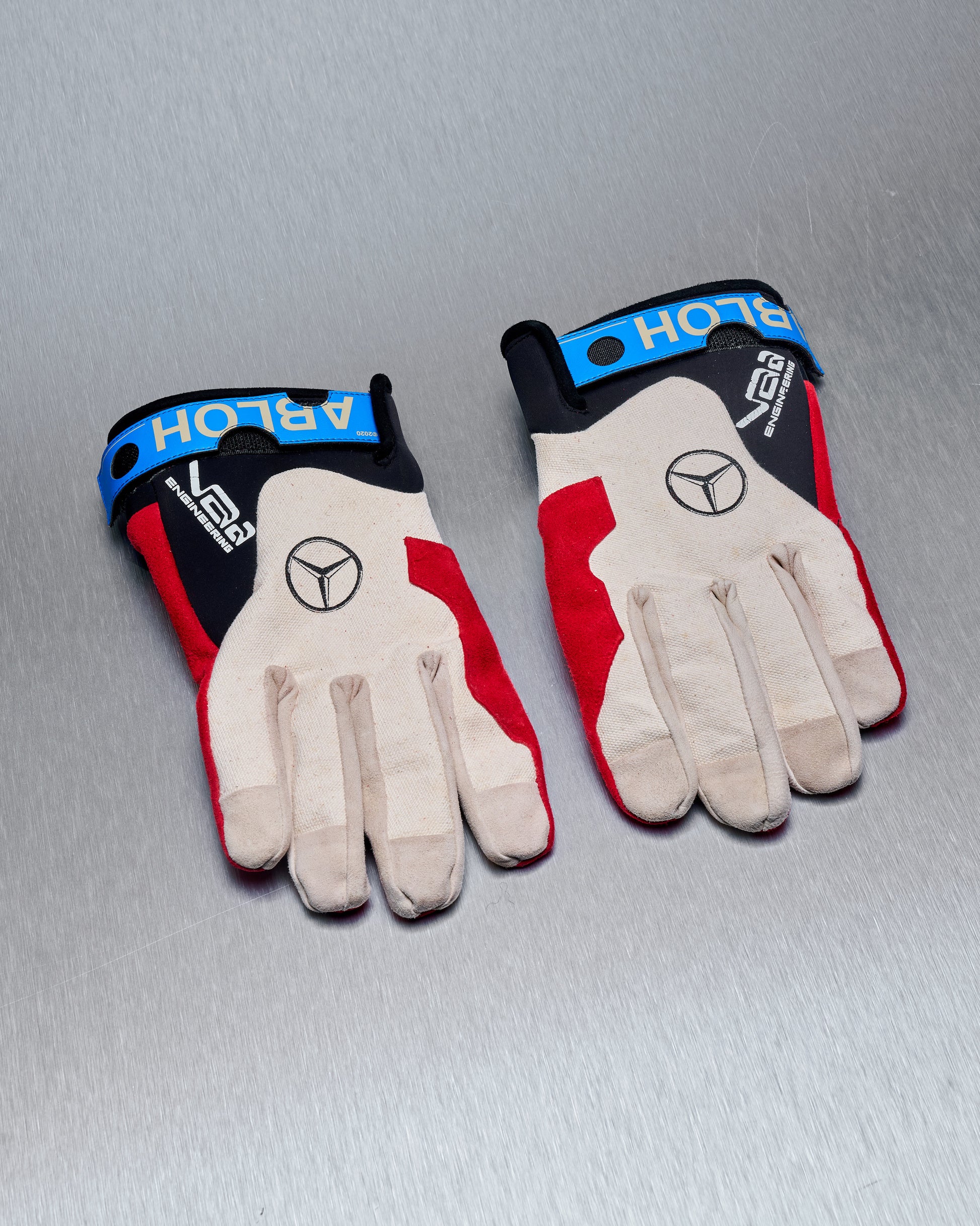 Driving gloves in canvas and leather. These gloves were never released to the general public: they were personal gifts from Virgil Abloh and Gorden Wagener to celebrate their 2020 collaboration for Mercedes Benz. Features soft suede leather palms, cotton canvas backs, neoprene wrists panels with artisanal branded velcro straps. One of twenty-two pairs that exist worldwide.