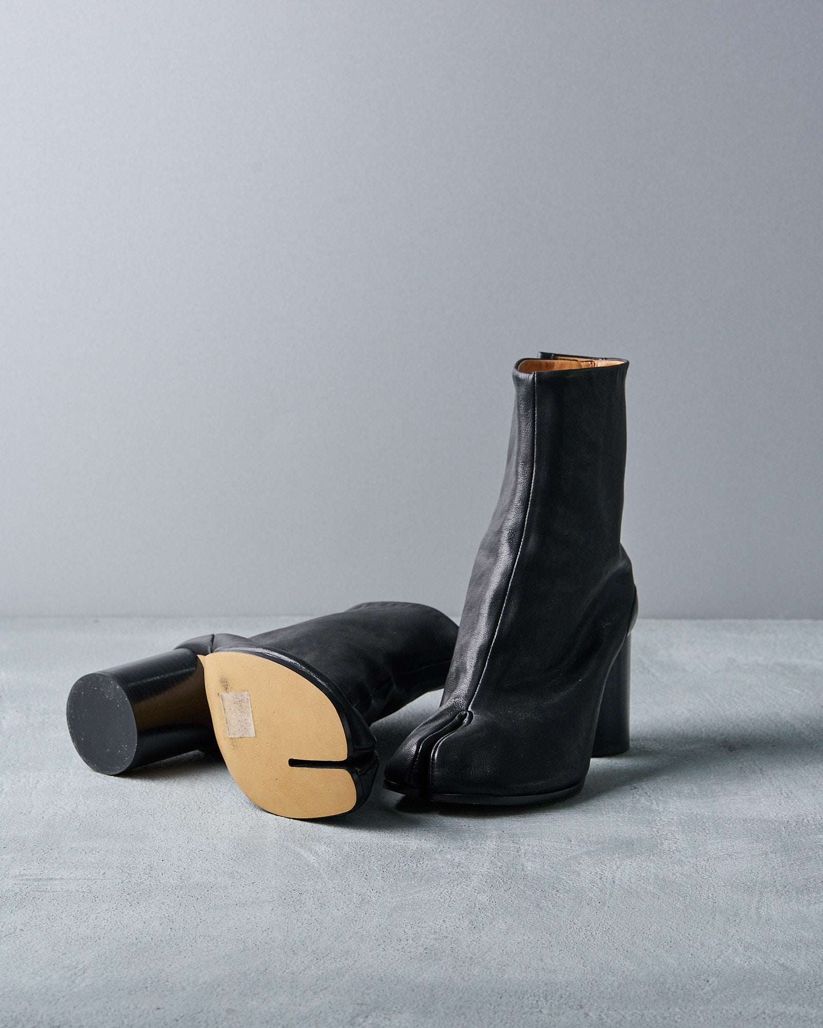 Ankle-height tabi boot in smooth leather with a sanded finish. Features side hook closures, leather sole.