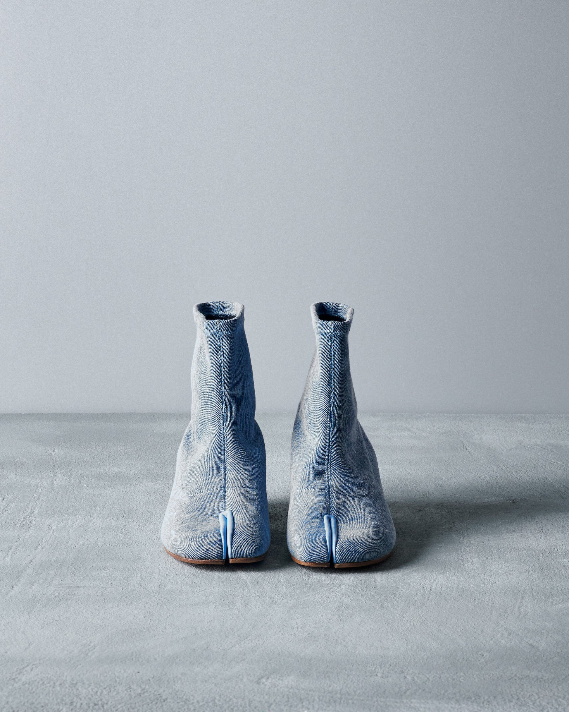Ankle-height tabi boot in acid-washed denim. Features side hook closures, leather sole, tonal fabric-wrapped heel.