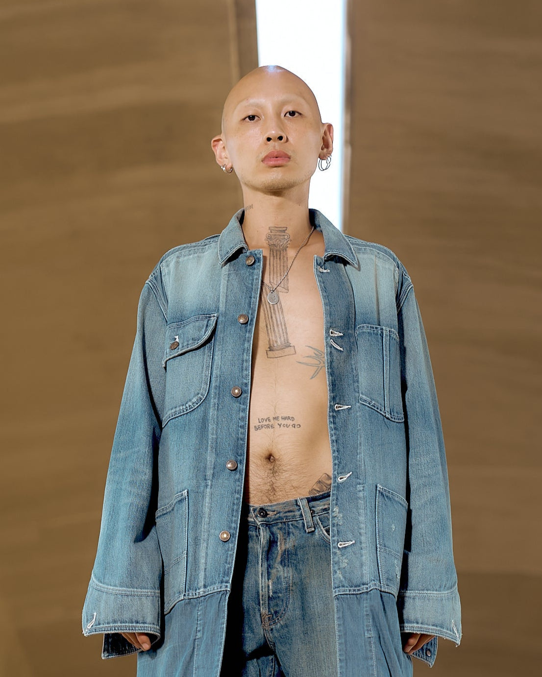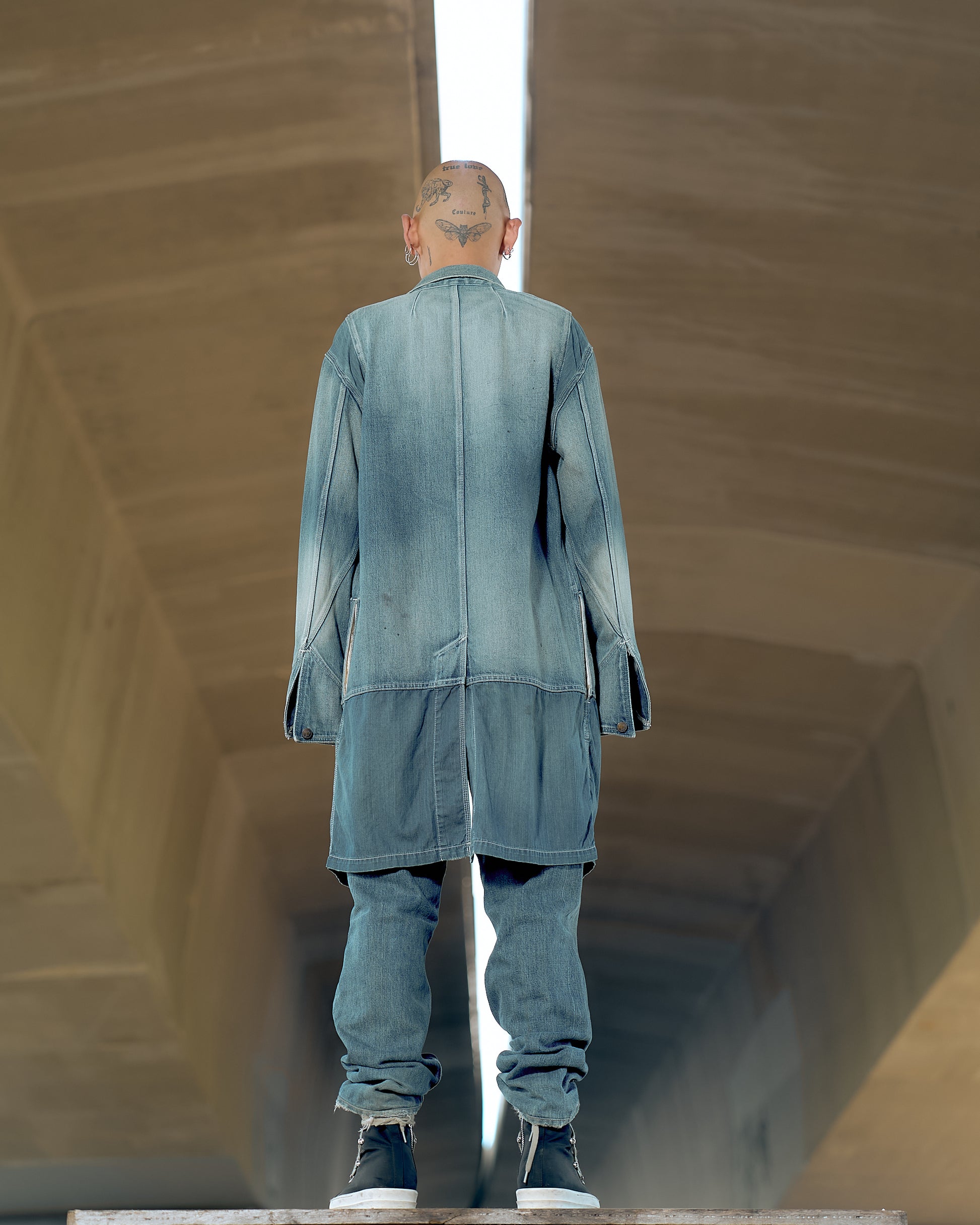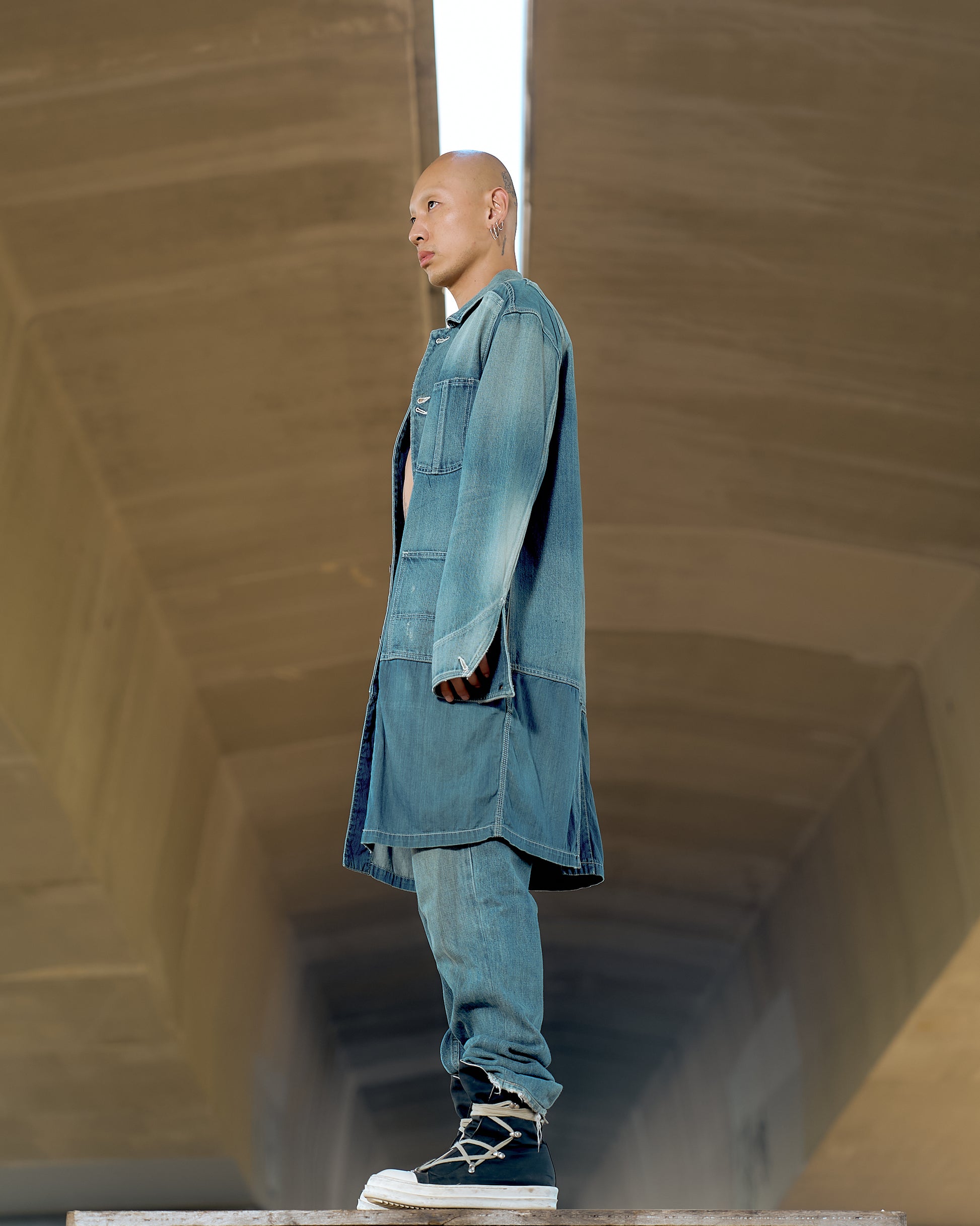 Longline chore jacket in soft denim with chambray panelling. Features a five-button front, Four external pockets, two internal pockets, hip pockets, back vent, burnished brass hardware throughout. Cold delicate wash