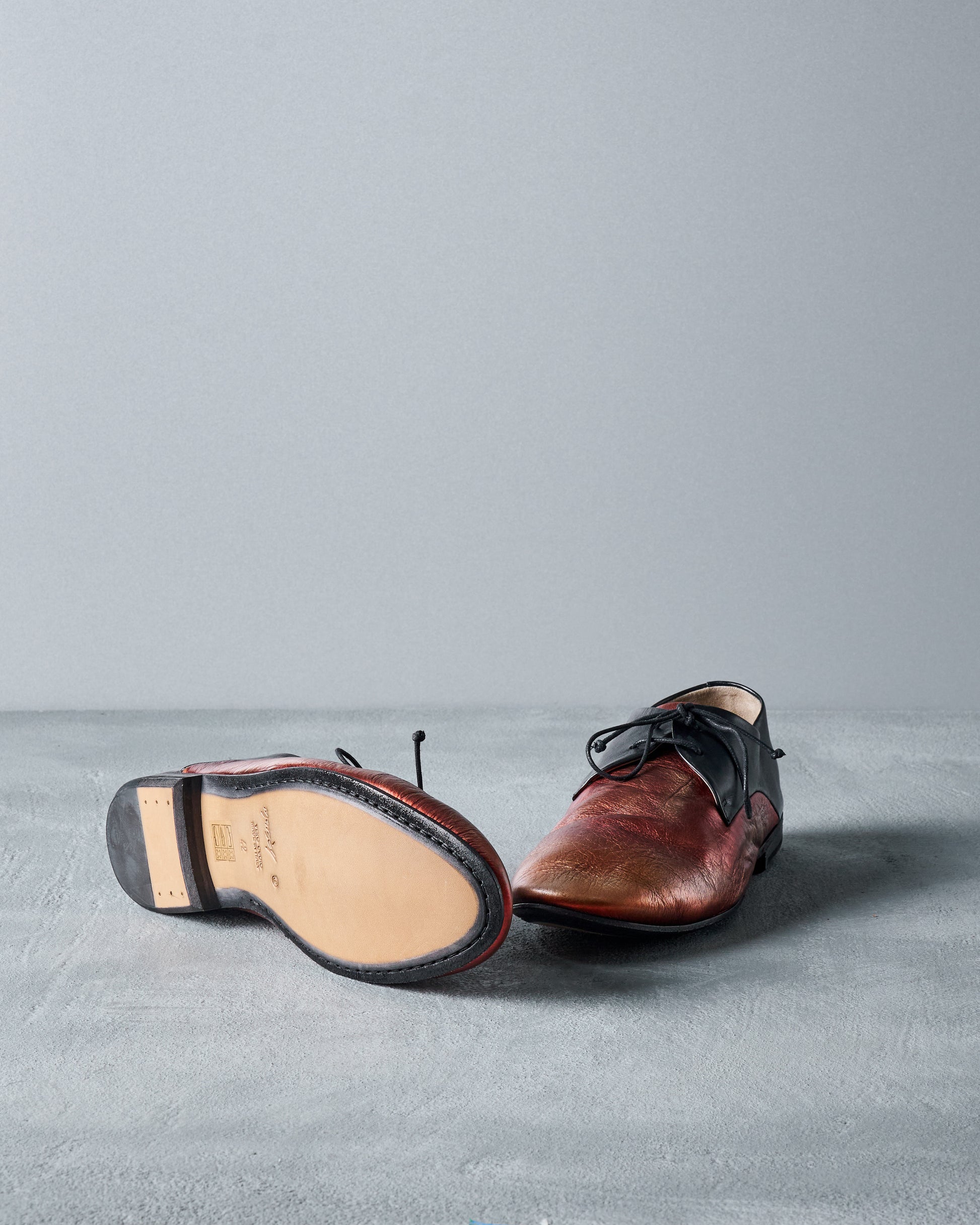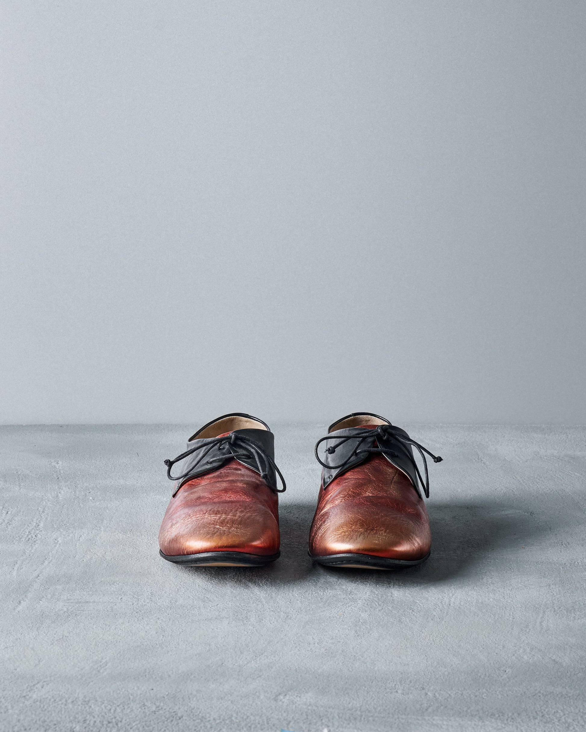 Lace-up brogue in soft wrinkled leather. The body of the shoe is covered with rose-gold gilt, contrasting with the satin black heel. Features leather laces, low leather sole.