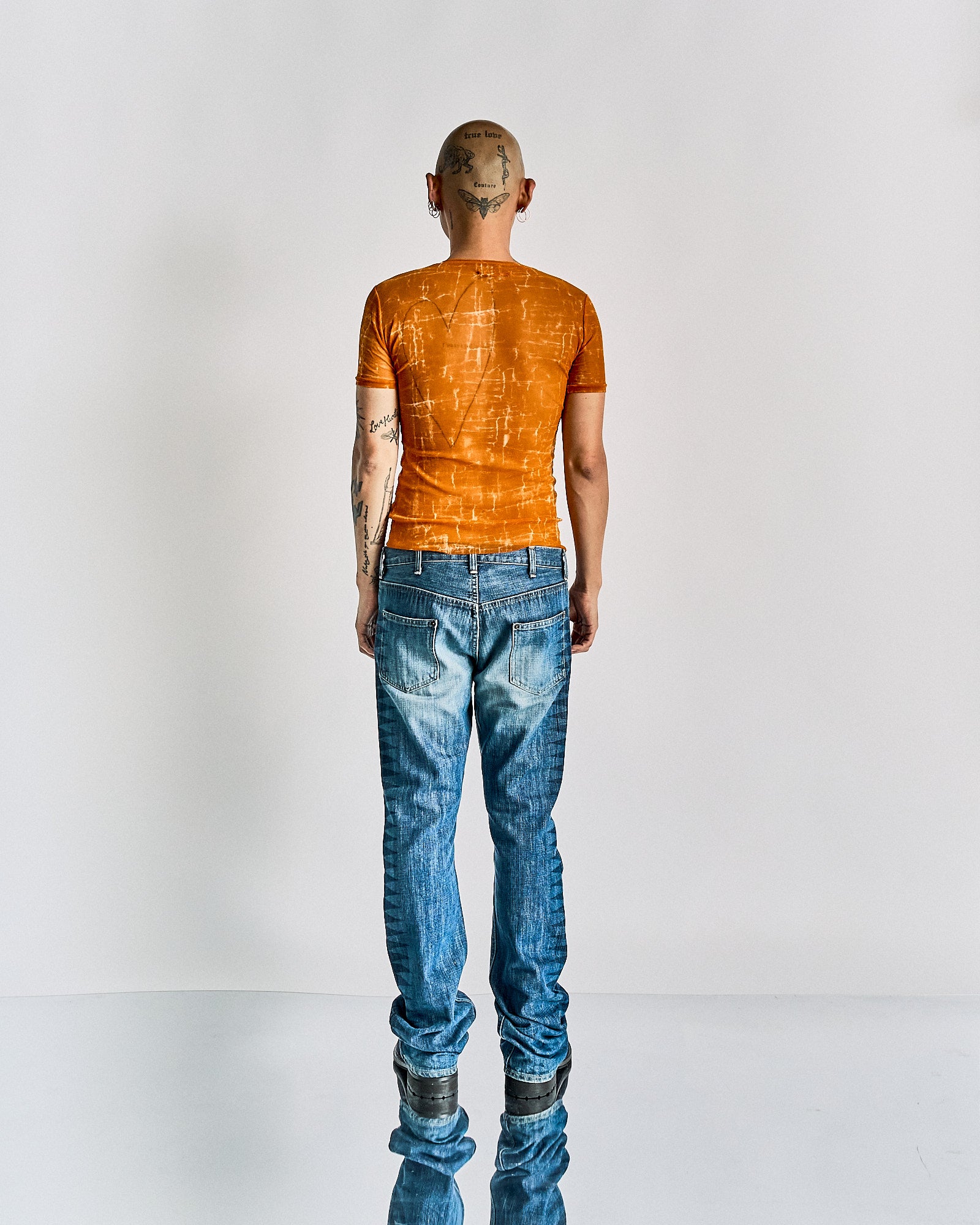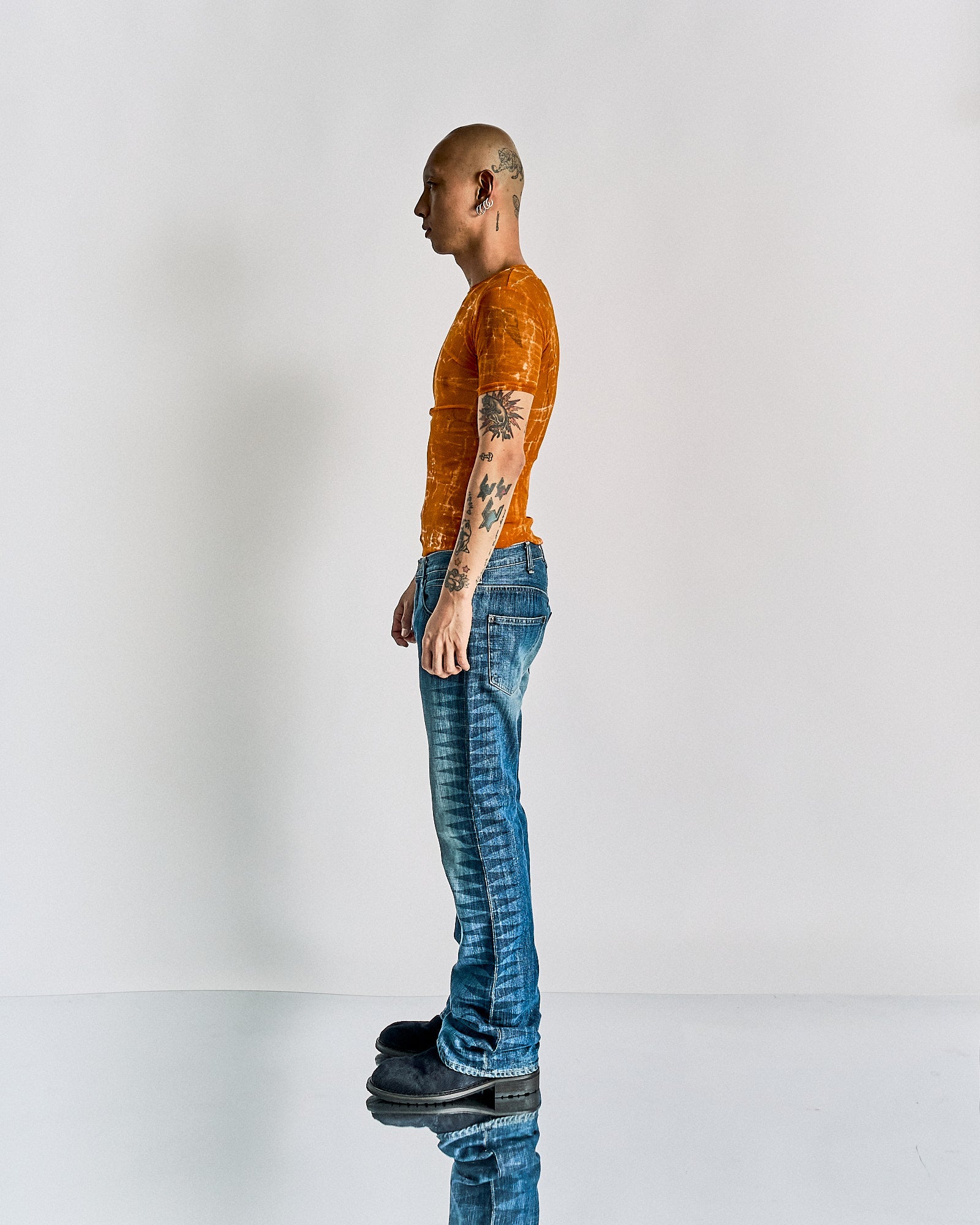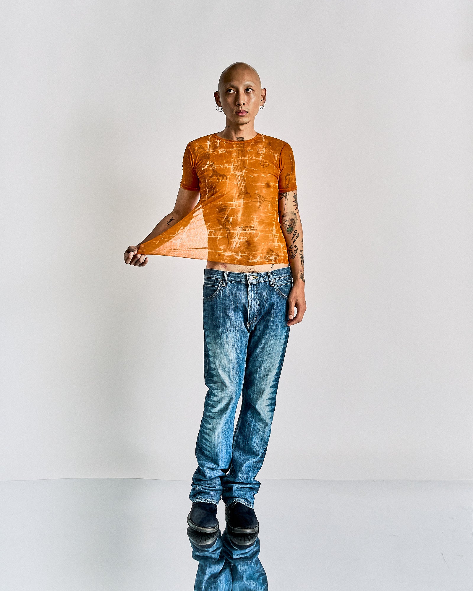 Slim-fit mesh t-shirt in sheer stretch gauze. The durable fabric allows for a skin-tight fit. Features an all-over tie-dyed print. Delicate hand wash only.