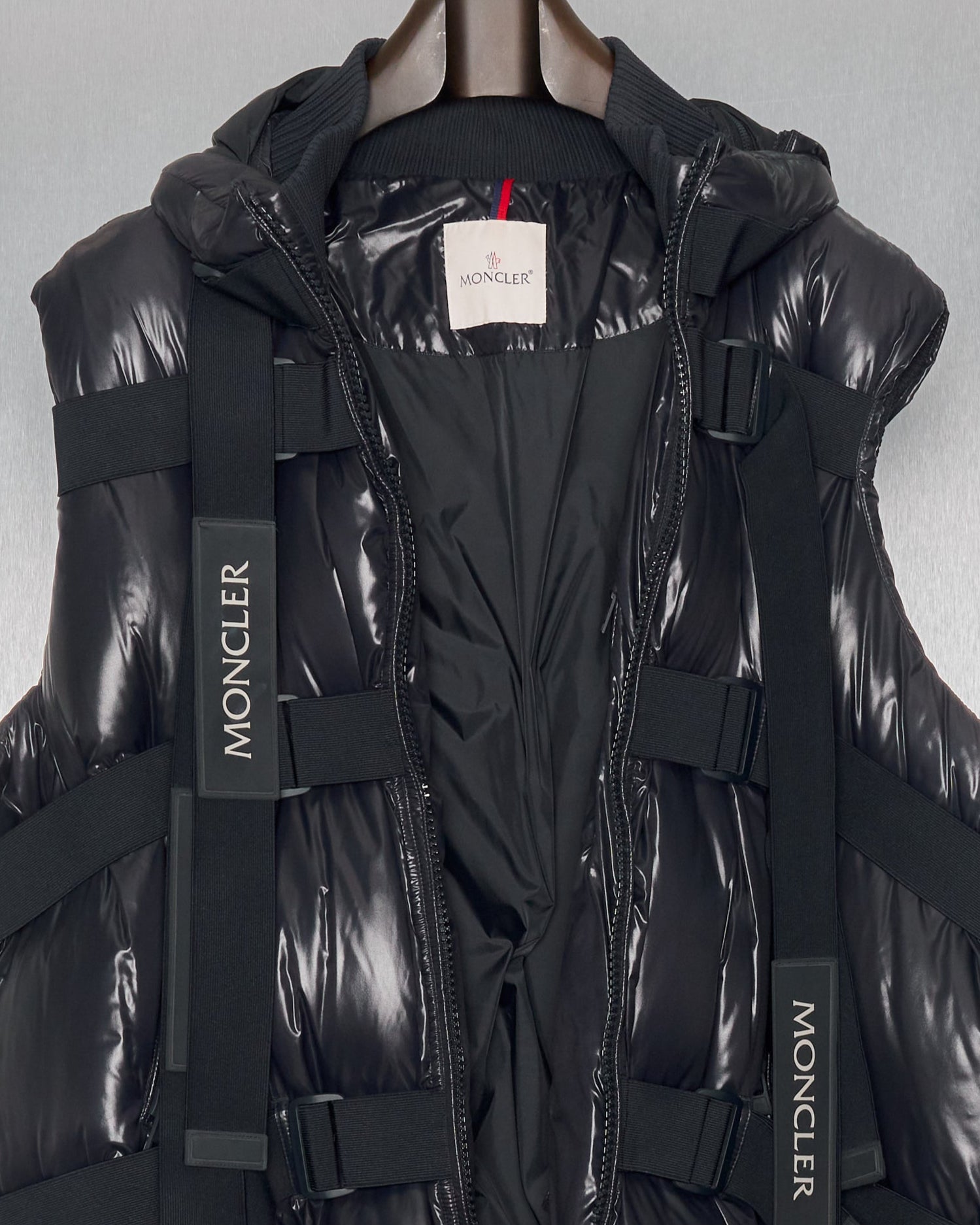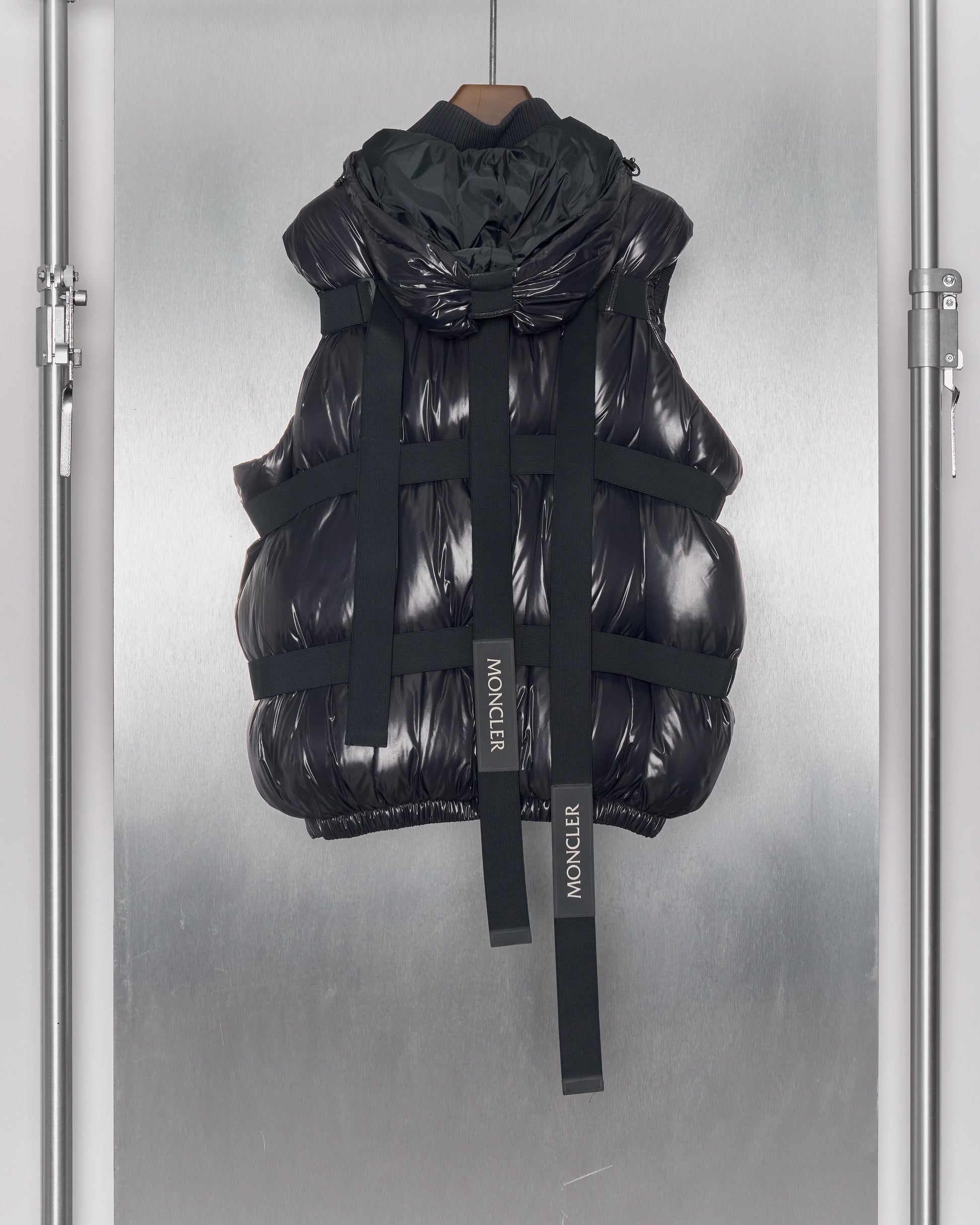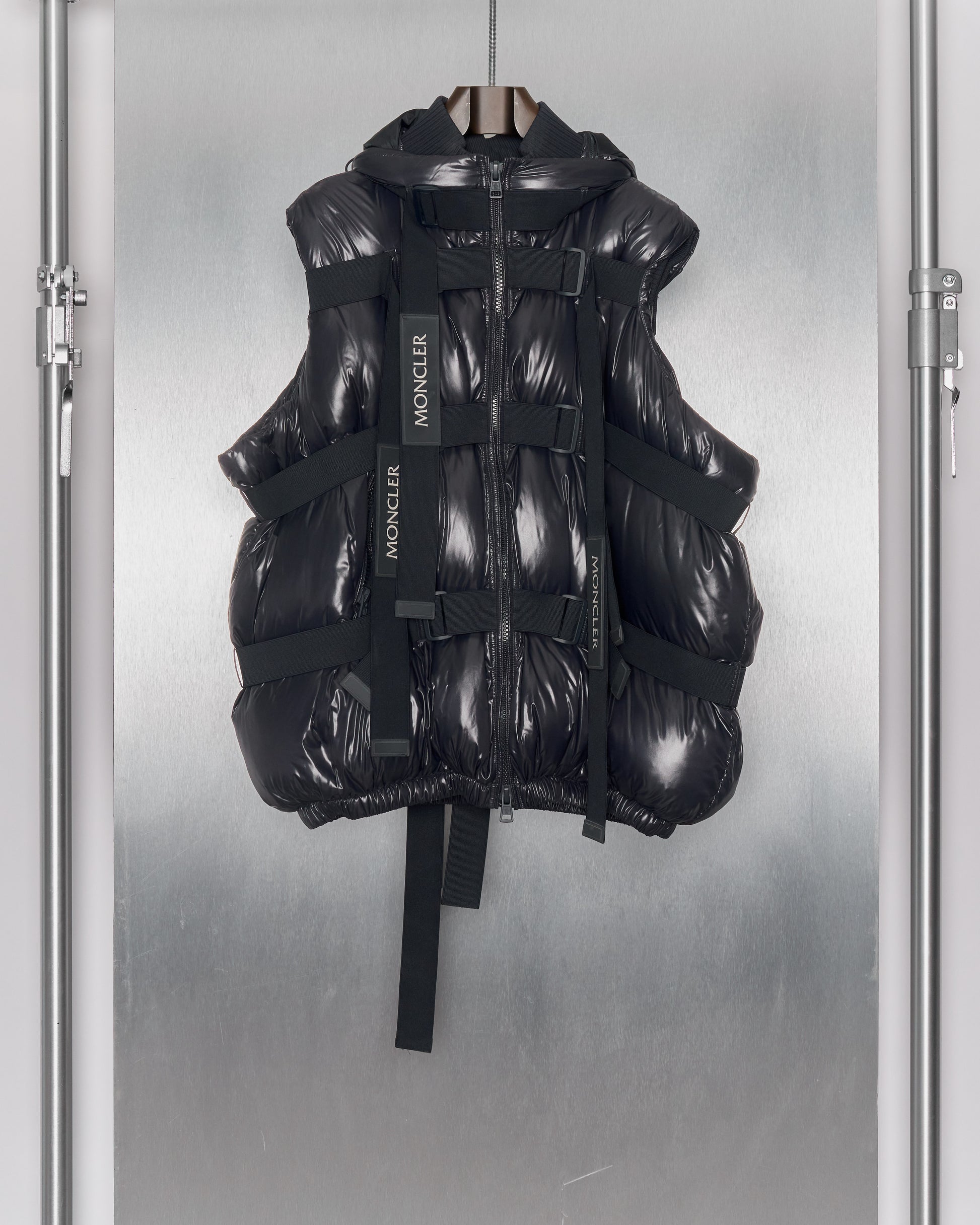 Voluminous puffer gilet in fine lightweight polyamide with warm goose down filling. A series of elasticised straps can be tightened around the form, ruching and distorting the wearer's silhouette. Features a chunky double-zip front, two external pockets, three internal pockets, removable hood with toggle pulls, ribbed collar and base. Dry clean only