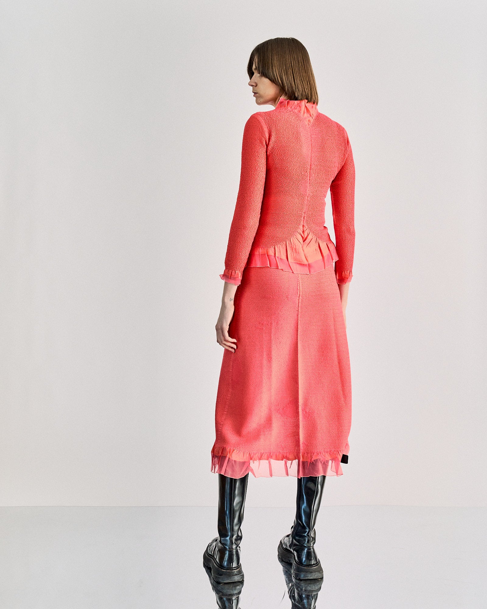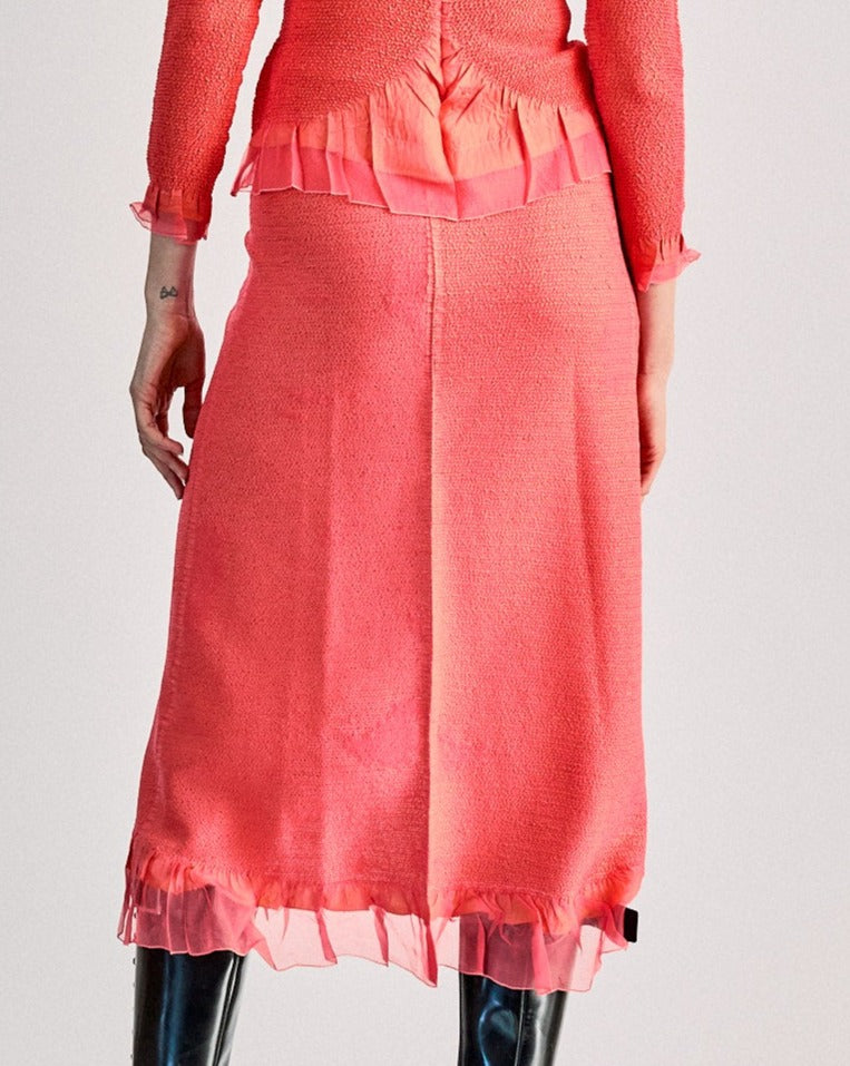 Fitted midi skirt constructed from stretch cauliflower pleat fabric with sheer ruffle trims. Features an elastic waist, internal orange lining, and an curved wraparound front. Delicate cold wash, dry flat