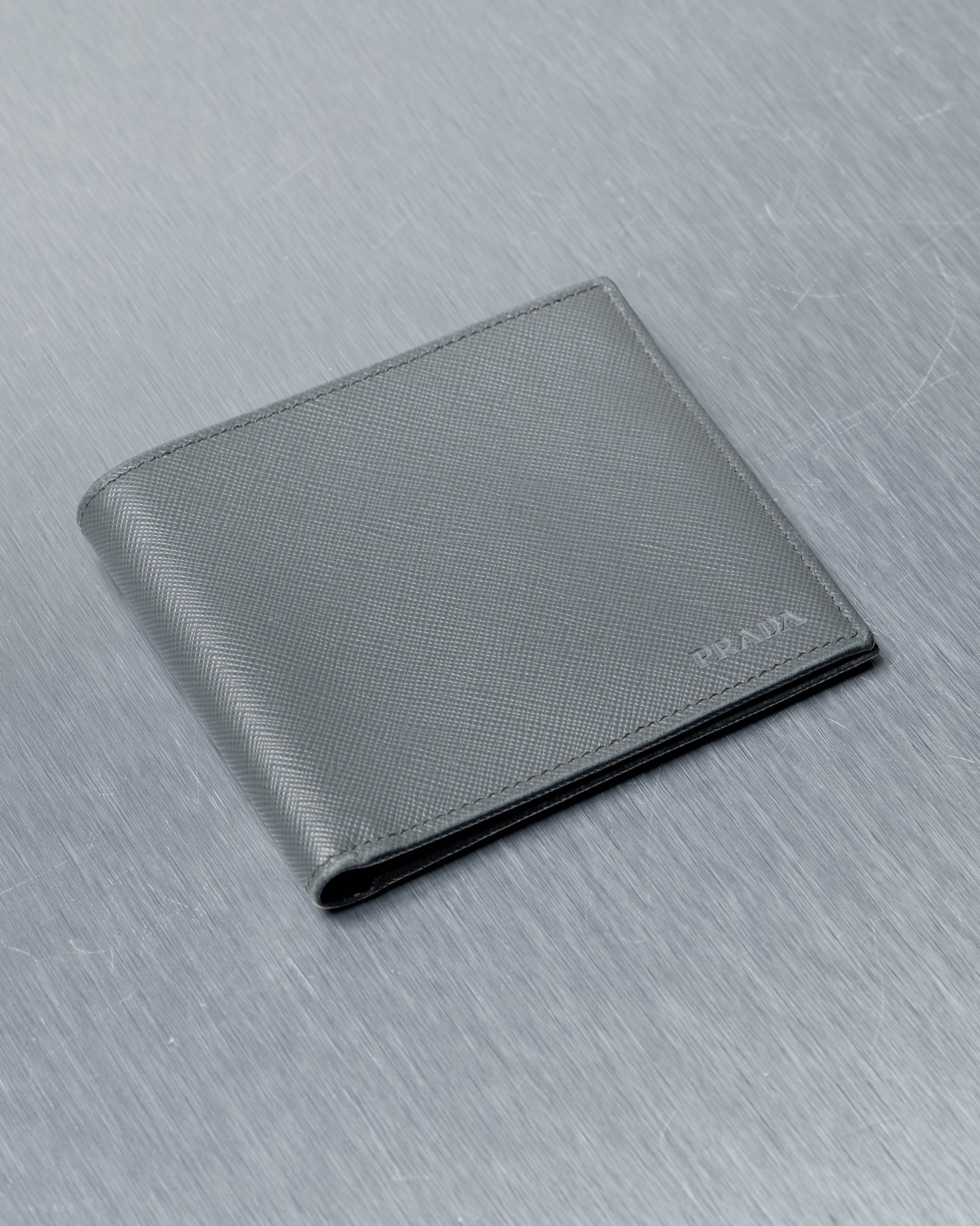 Prada saffiano leather bi-fold wallet in grey with a contrasting dark blue leather interior. Features eight card slots and two internal bill compartments lined in moiré fabric, finished with a small embossed logo at the front. A sleek, timeless piece designed for everyday organisation.