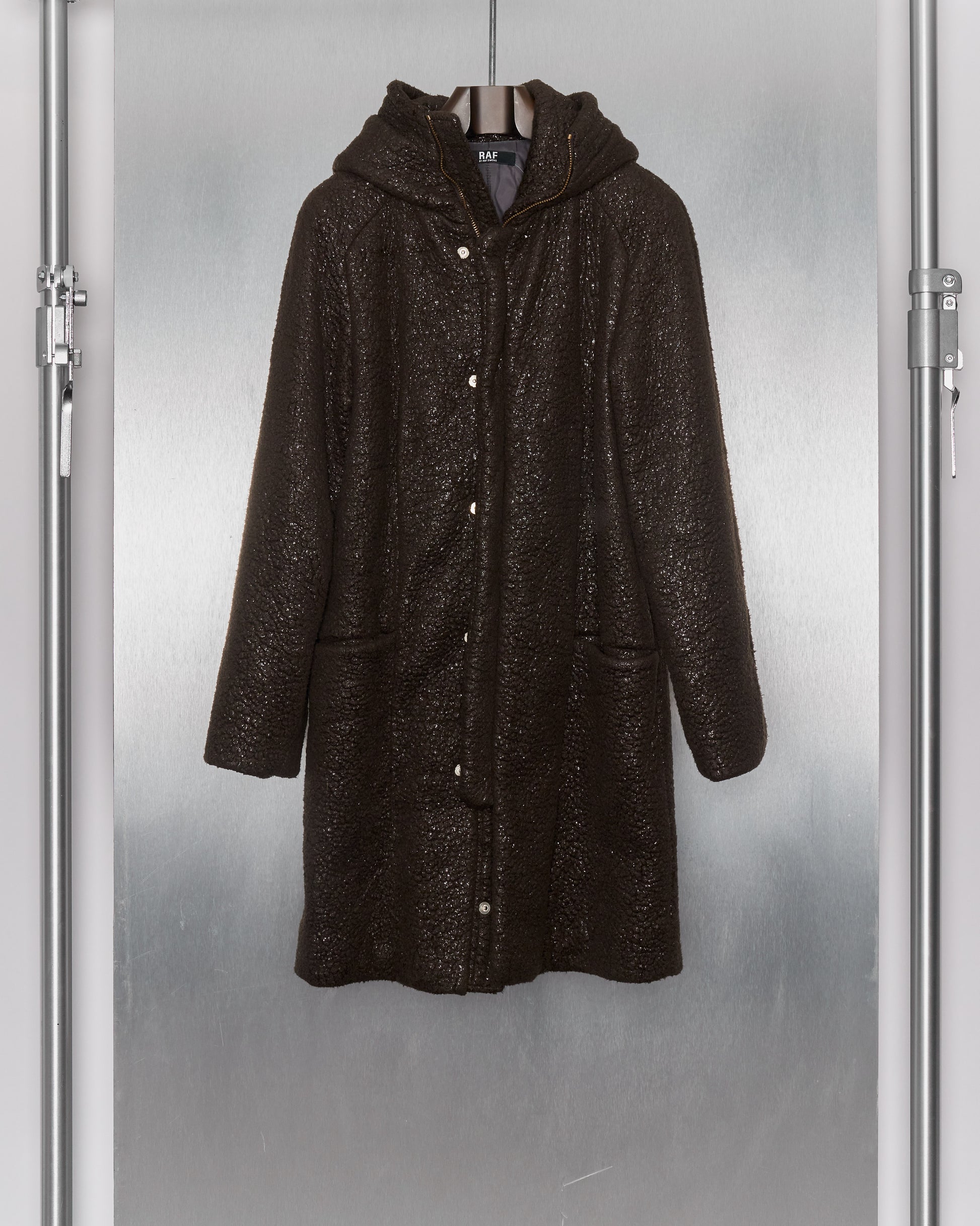 Hooded raglan coat in warm piled acrylic. The textural surface is laminated in metallic flecks, creating a glistening surface recalling light rain before a storm. Features a front zip opening with press stud cover, D-ring fasteners on hood, two external pockets and one internal pocket, padding and lining throughout. Dry clean only