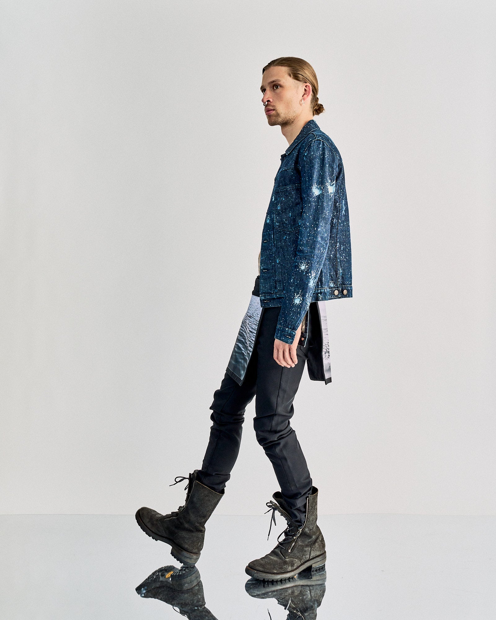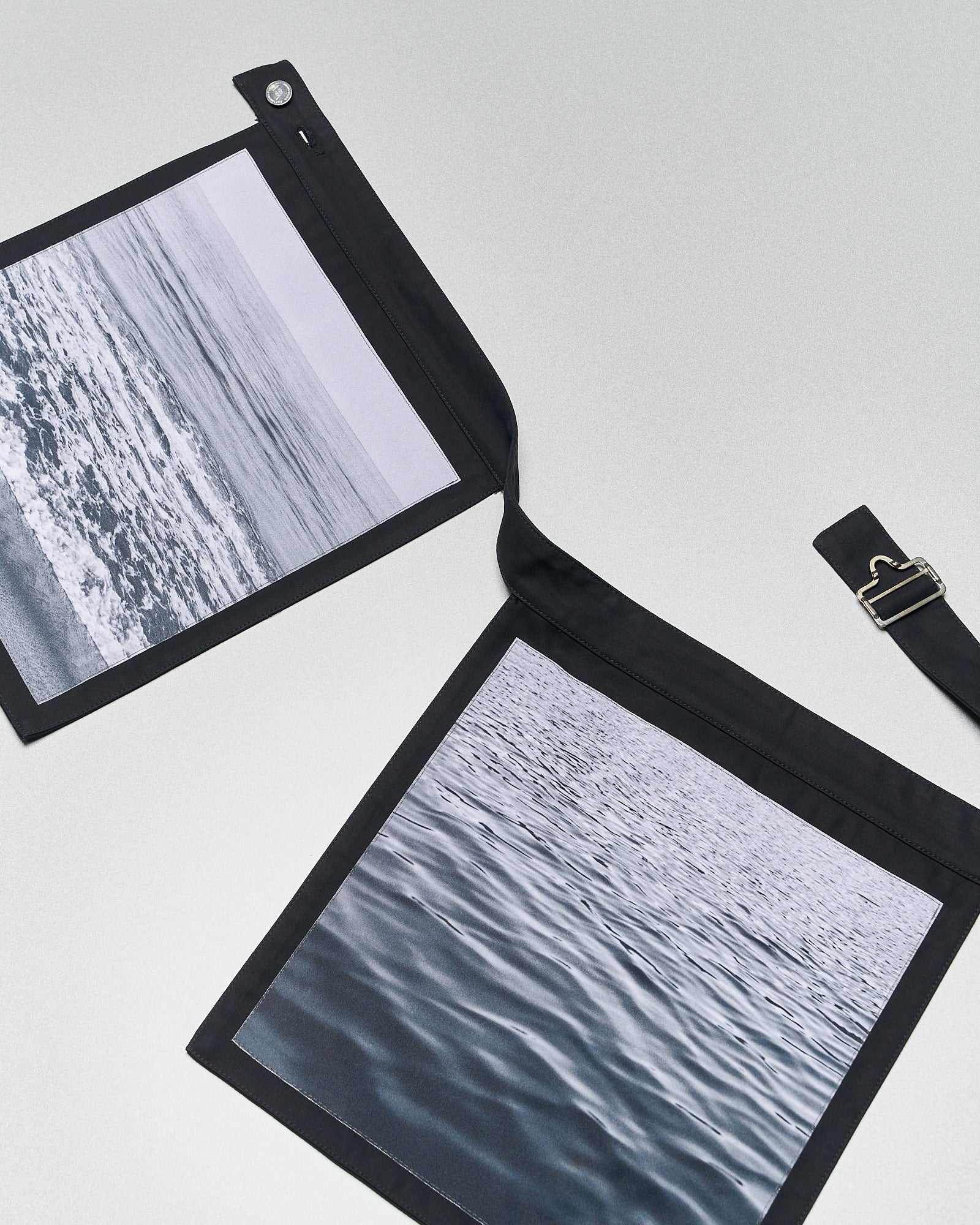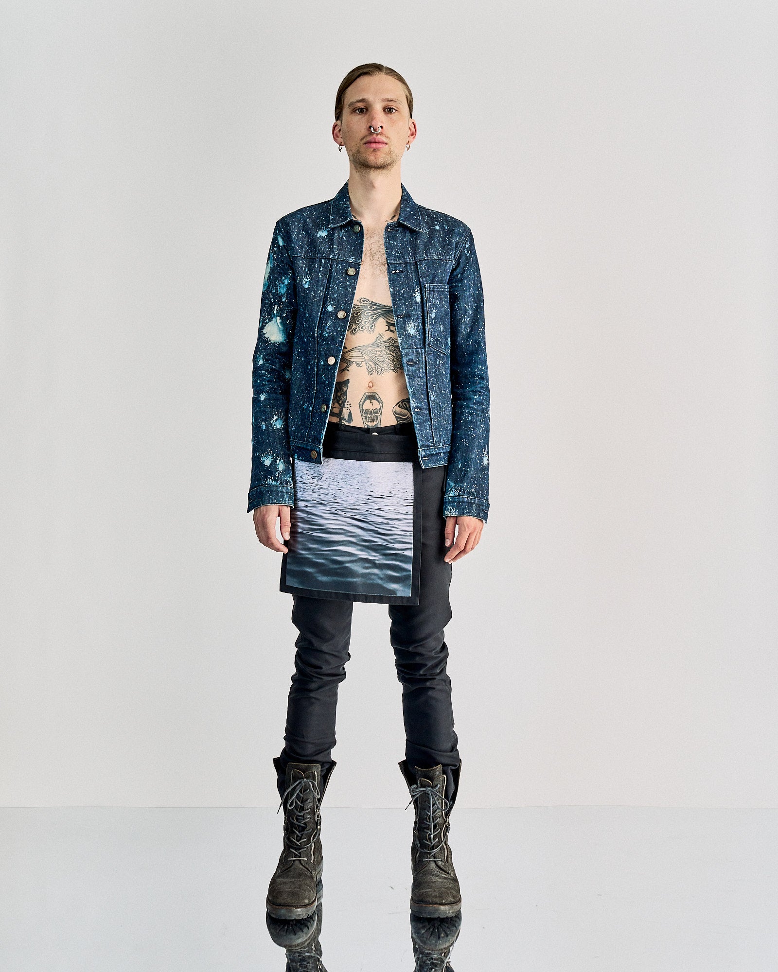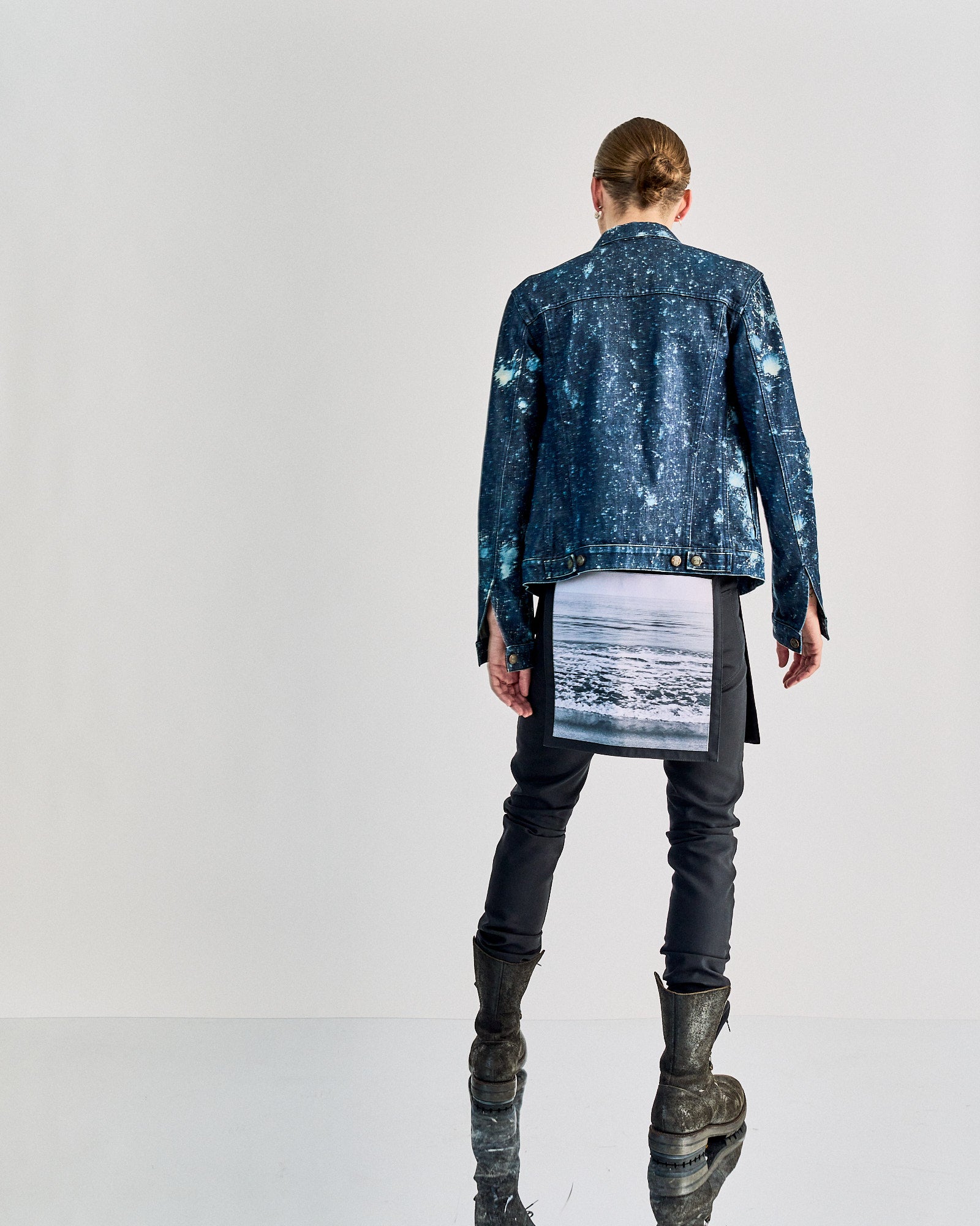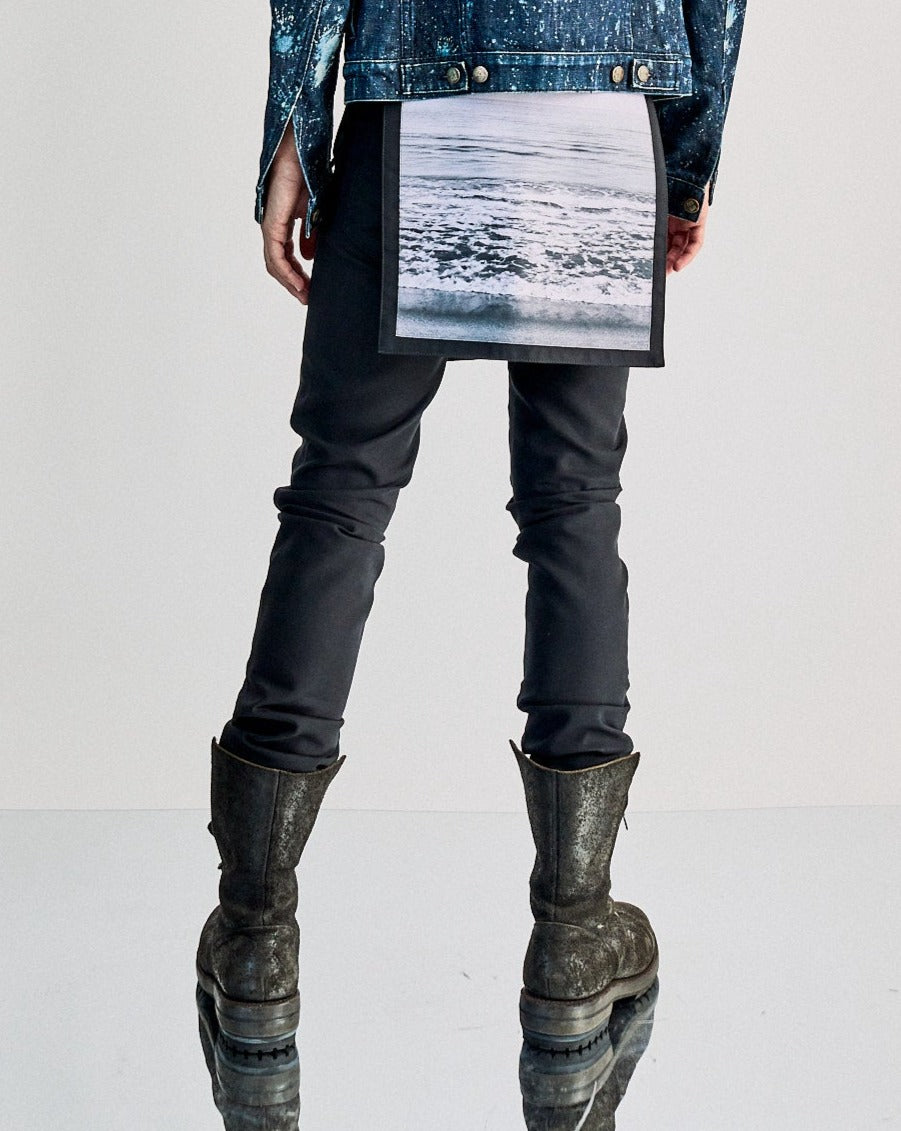 Slim five-pocket pant with slight taper constructed from stiff cotton twill. Tonal stitching, leather tag on seat with embossed branding. Features a two-panel apron featuring Mappelthorpe's landscape photography. This can be worn through the belt loops, or as a separate piece. Laser-etched metal hardware throughout. Dry clean only