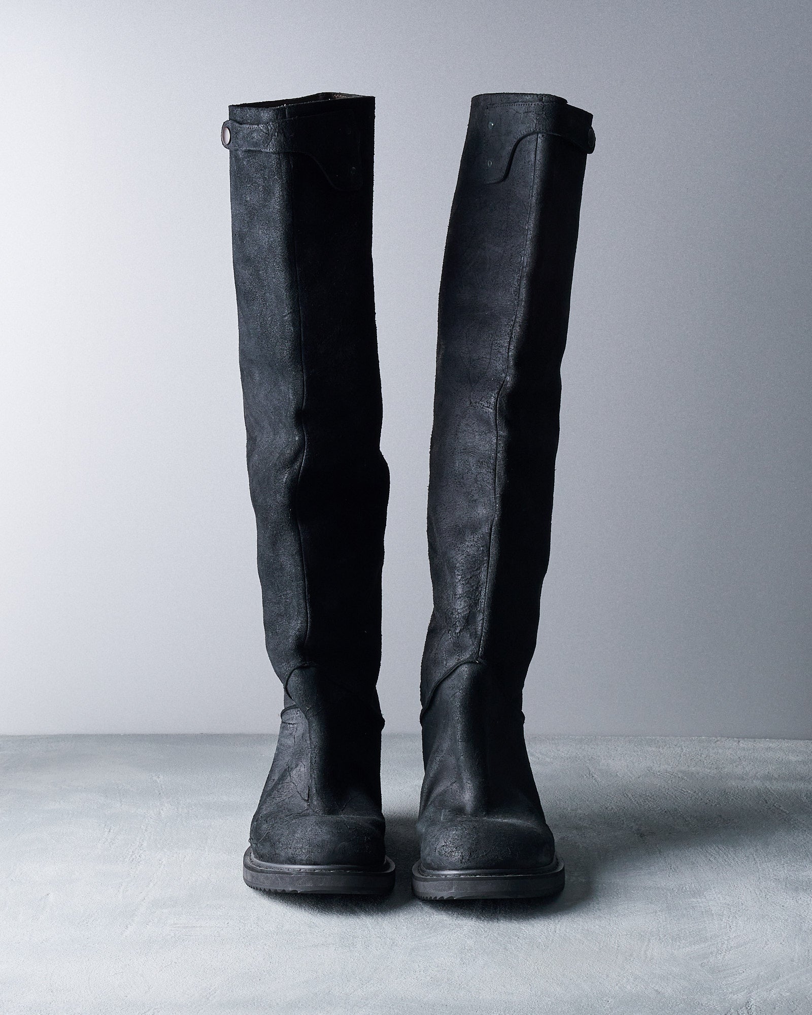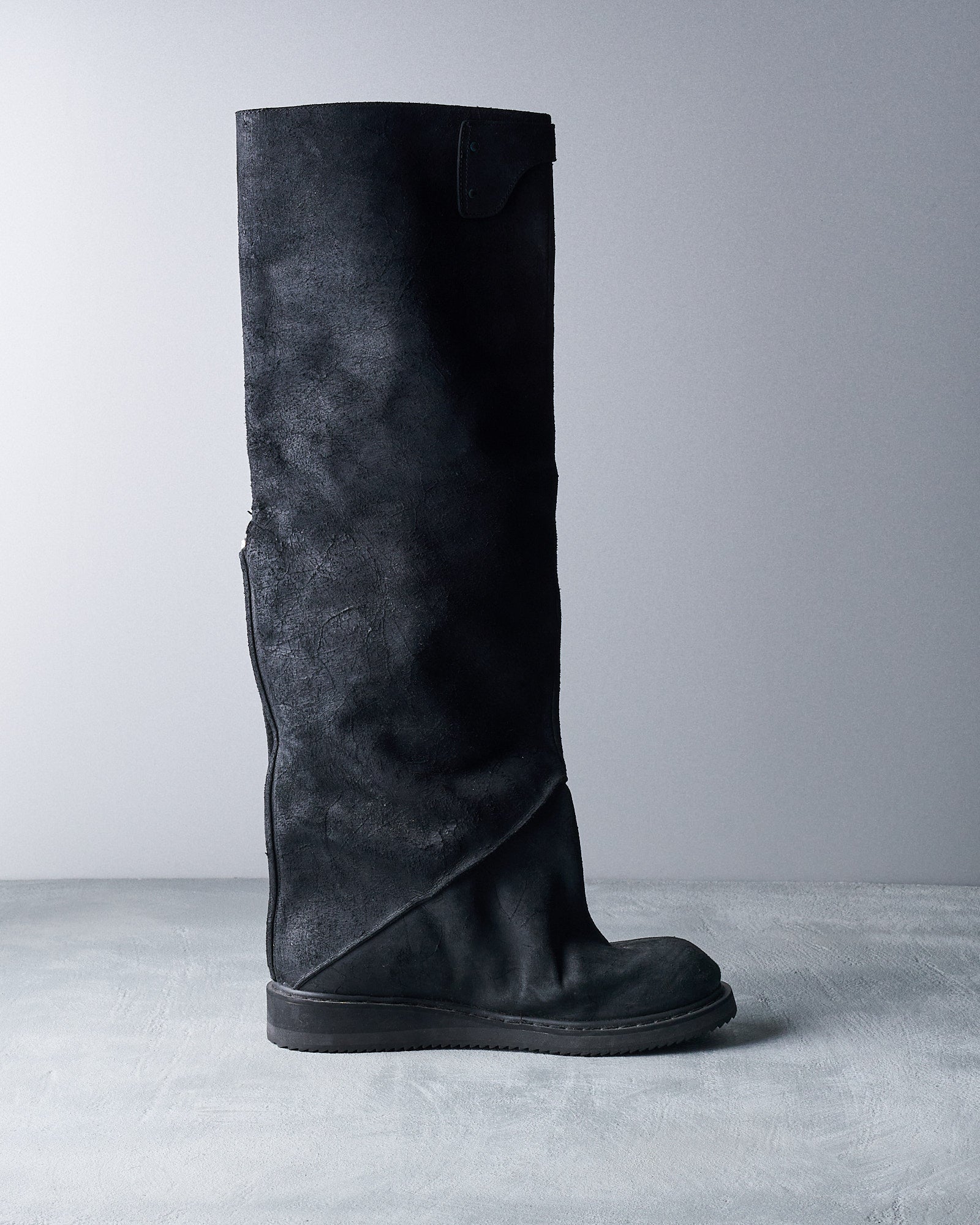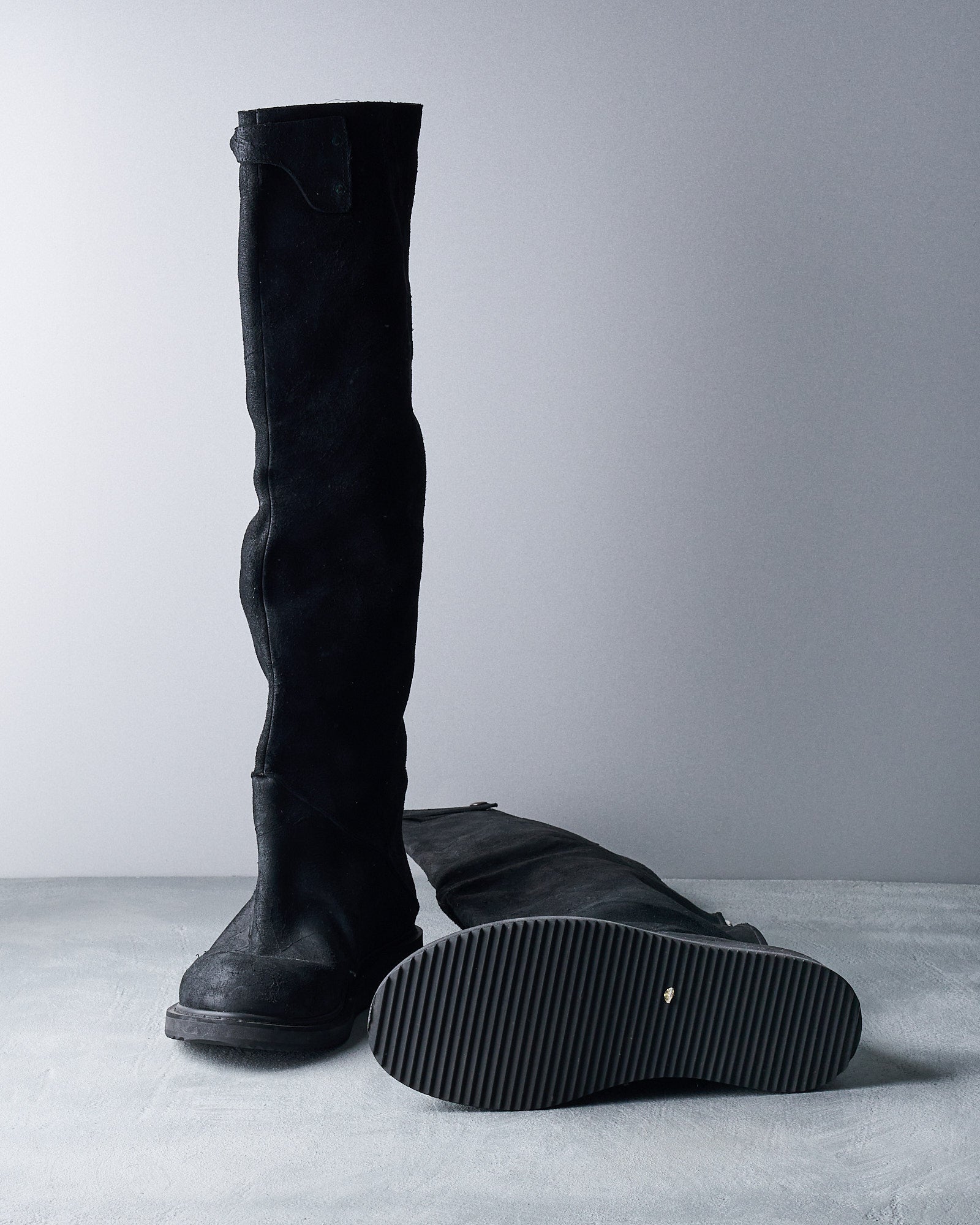 Knee-high boot in panelled leather suede construction with zip at counter heel. The long shaft falls into a sculptural vamp, gathering like a pressed trouser. Features an open collar and press stud adjuster on front, subtle toe spring, creeper sole.