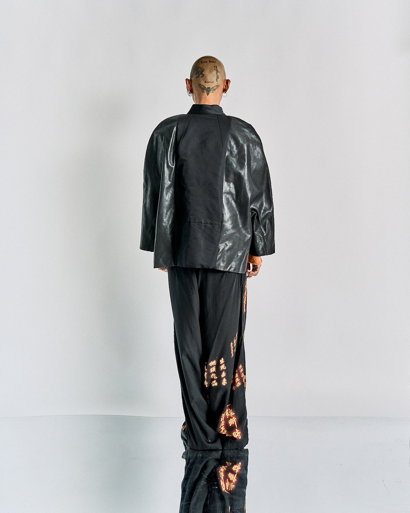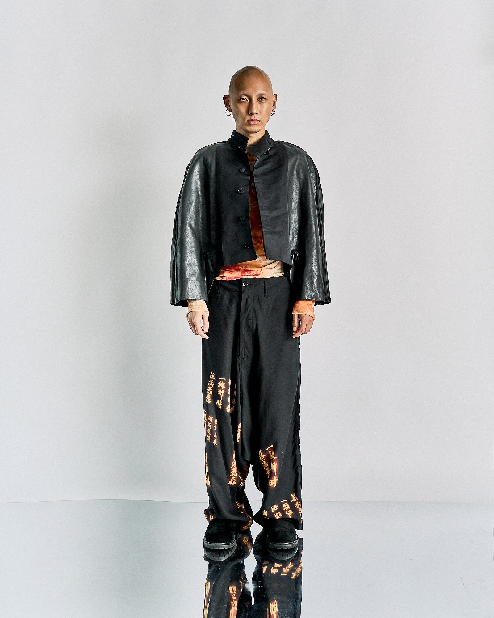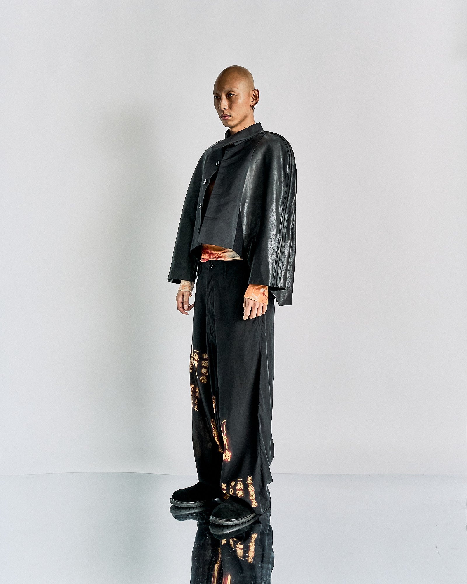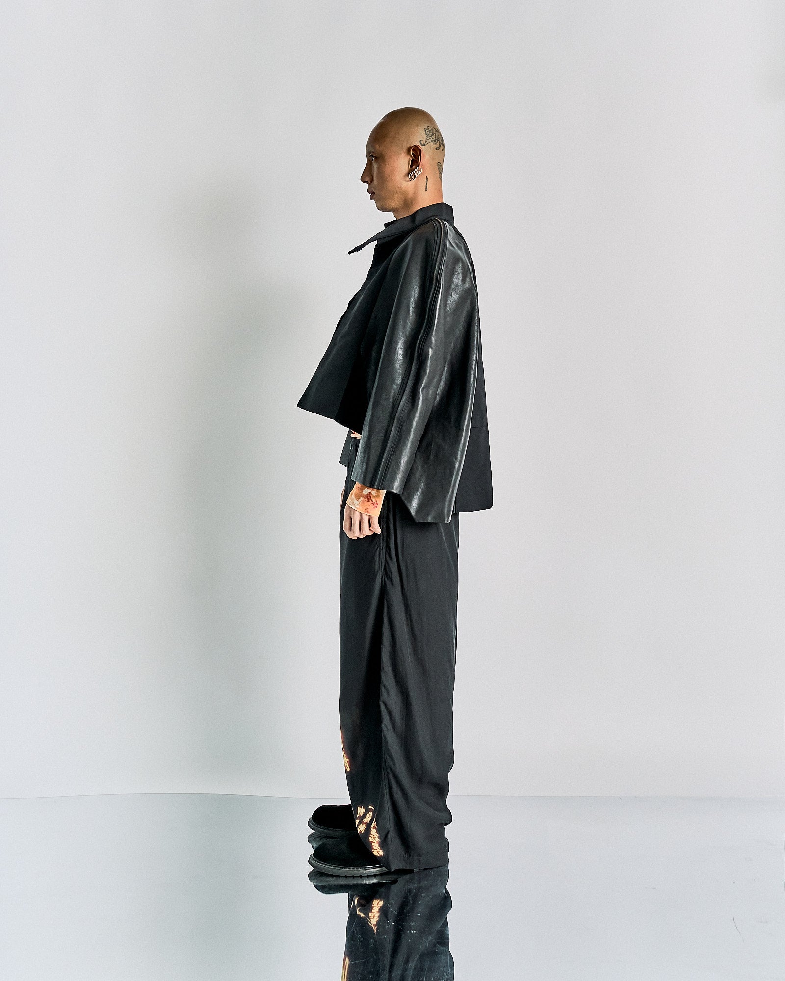Geoshield button-up jacket in horse leather with satin panelling and collar. Exaggerated round shoulders, a dropped chest and cropped front-rise sculpt the wearer into a streamlined monolithic form. Features internal lining, raised leather stripe panelling down sleeves, high-low silhouette at back. Dry clean only