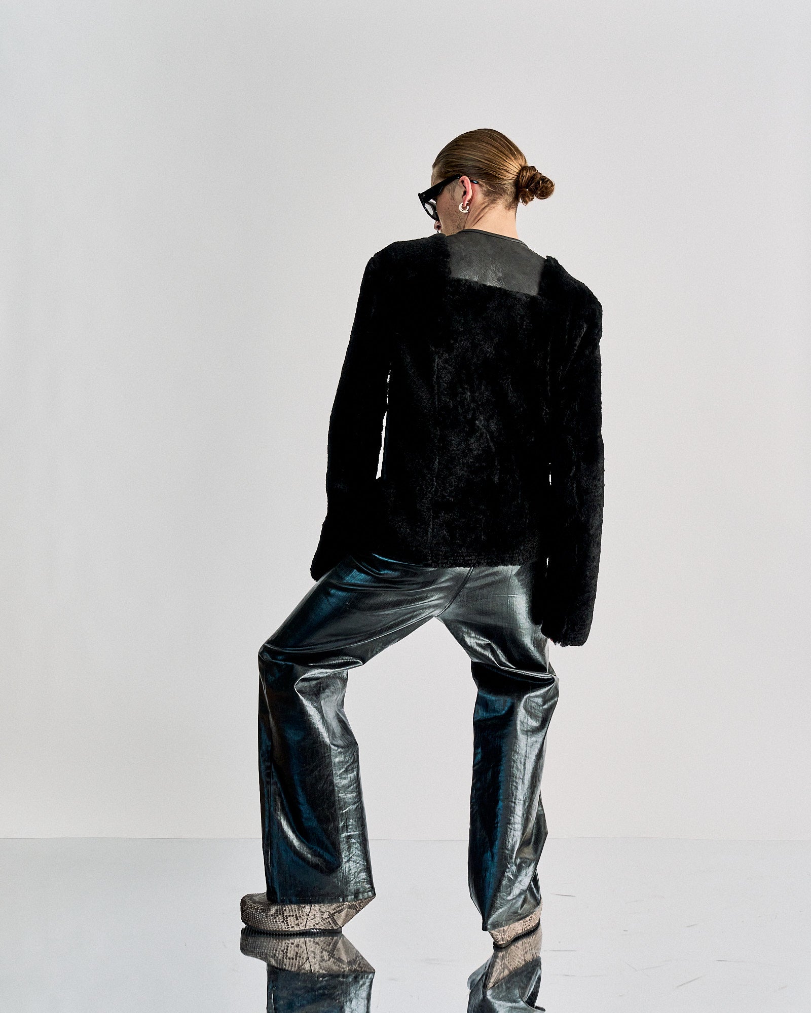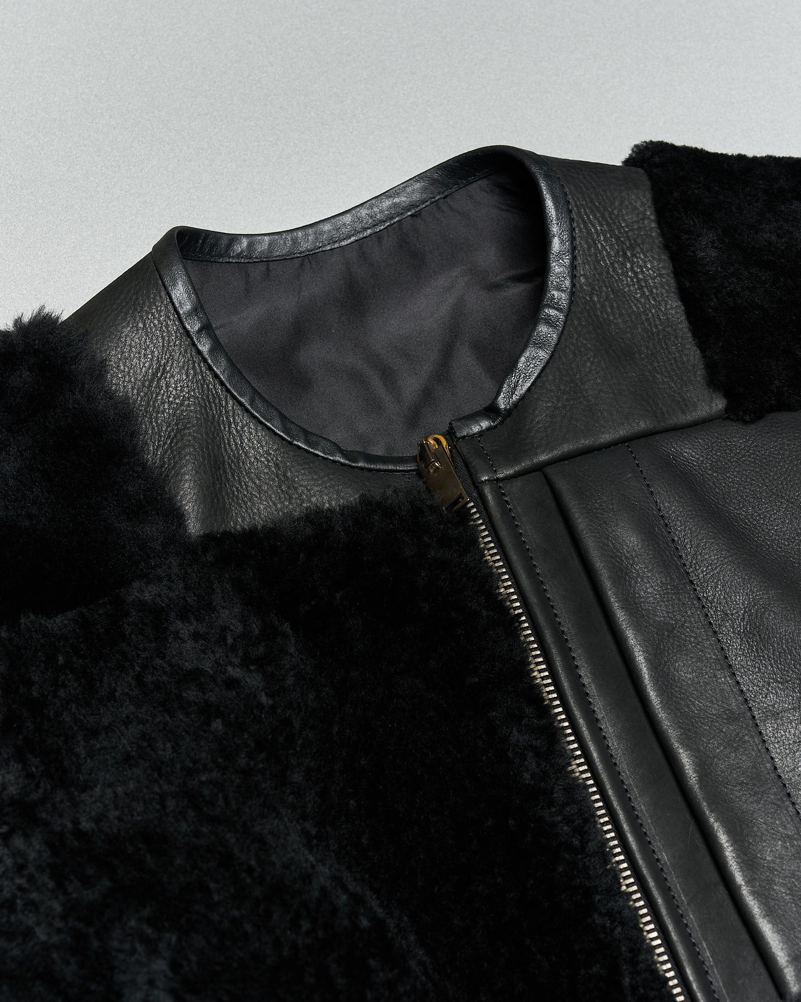 Avant garde crewneck jacket with front zip closure constructed from lustrous fur and soft grained leather panels. Three front pockets are integrated into its geometric design. Mid-rise with elongated sleeves. Specialist clean only