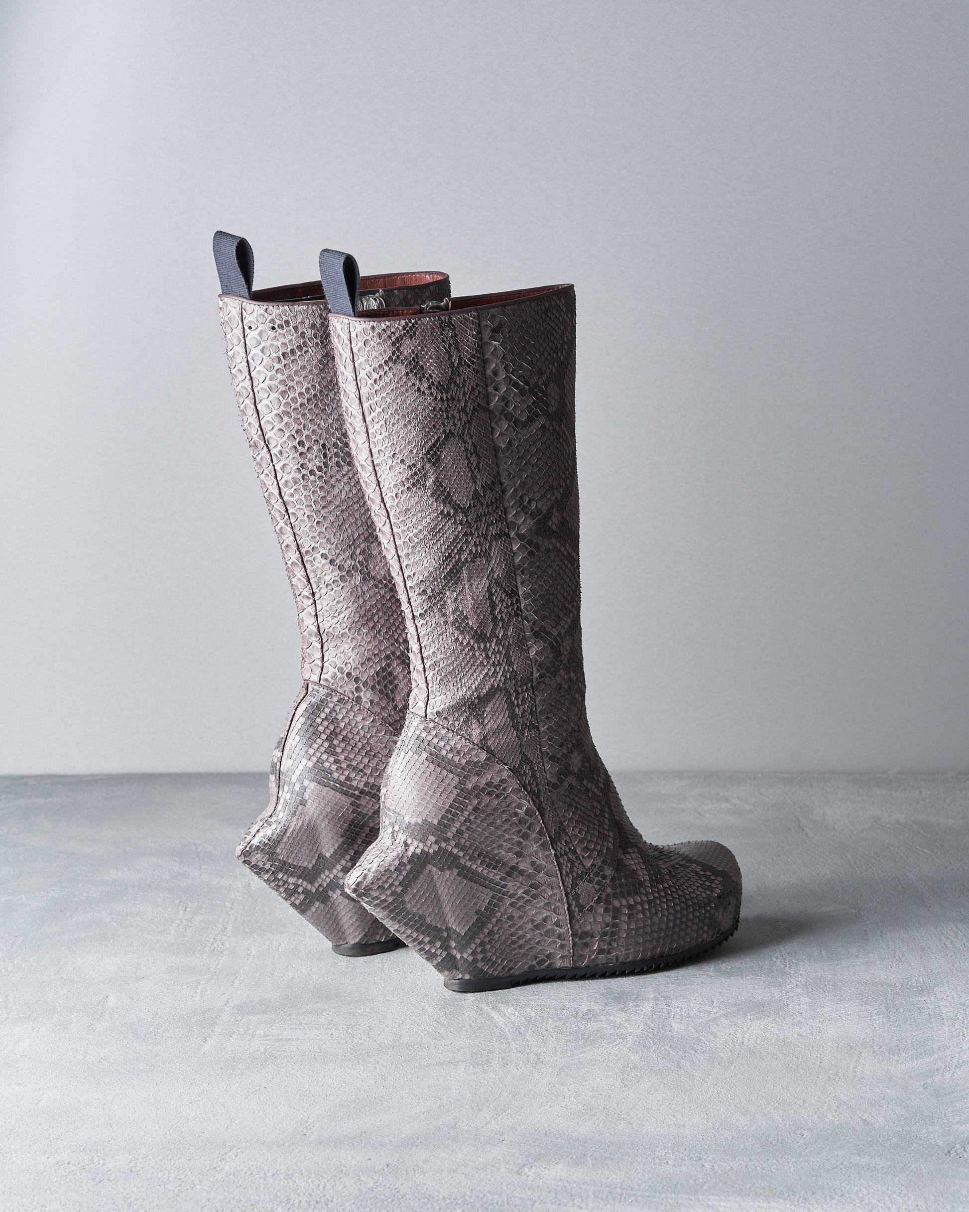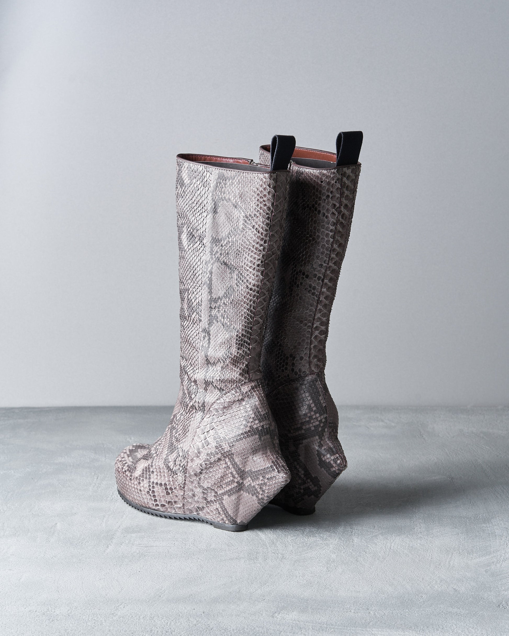 Tall platform wedge boot with a vicious silhouette. Scaled python leather wraps down the entirety of the shoe. Features a leather-lined shaft with side zip and leather pulls, sculptural platform heel with back fin. An alchemic fusion of 70's glam and dystopian futurism.