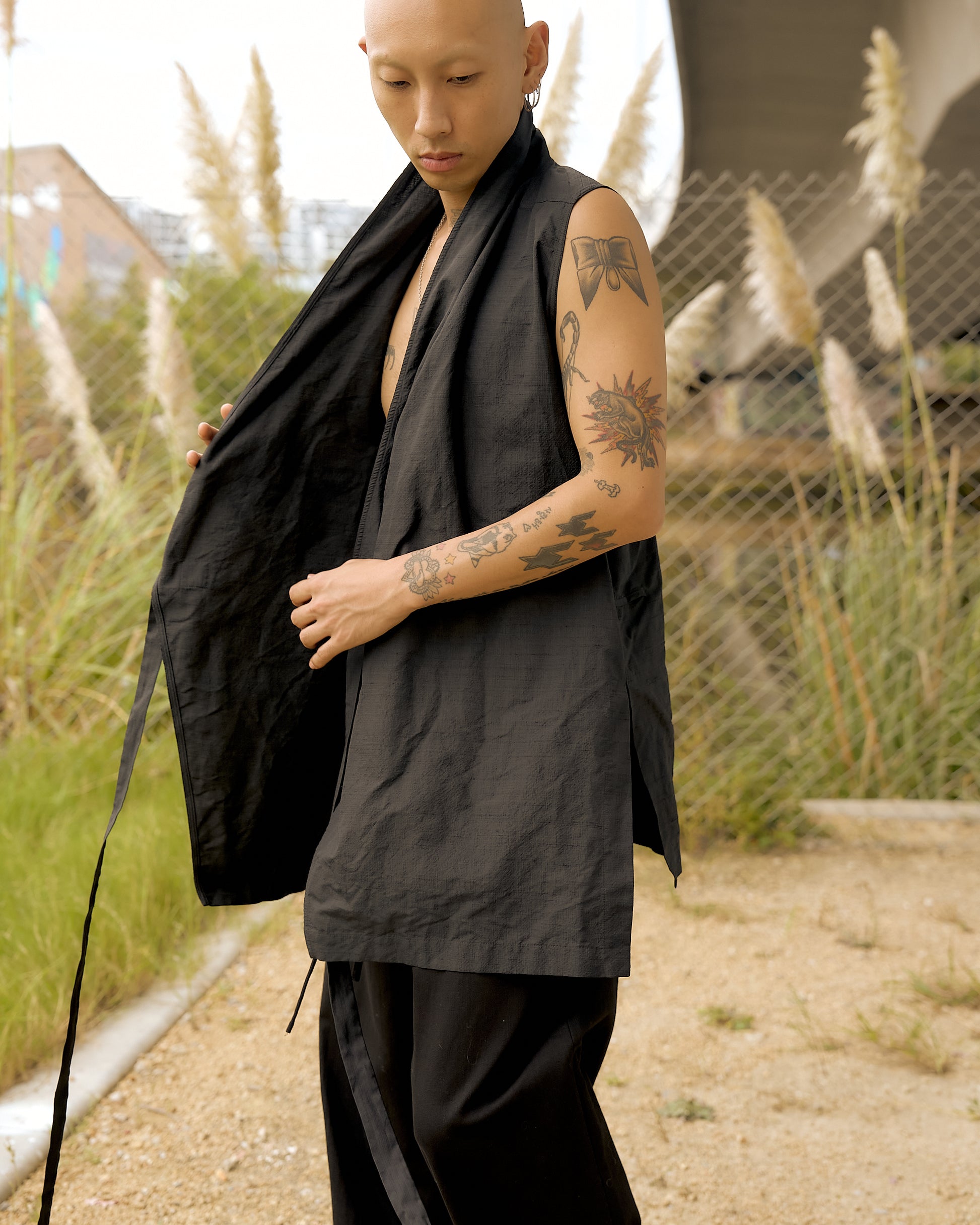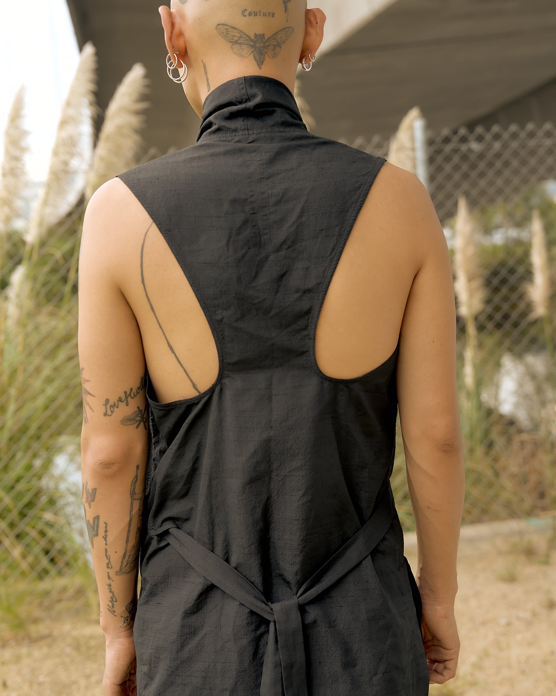 Wrap-around sleeveless top in textural woven polyester. An asymmetric tie closure sits level with two side vents, allowing the piece to be fastened visibly or invisibly in accordance to the wearer's intent. Features a deep neckline and an exposed shoulder blade back. Delicate wash