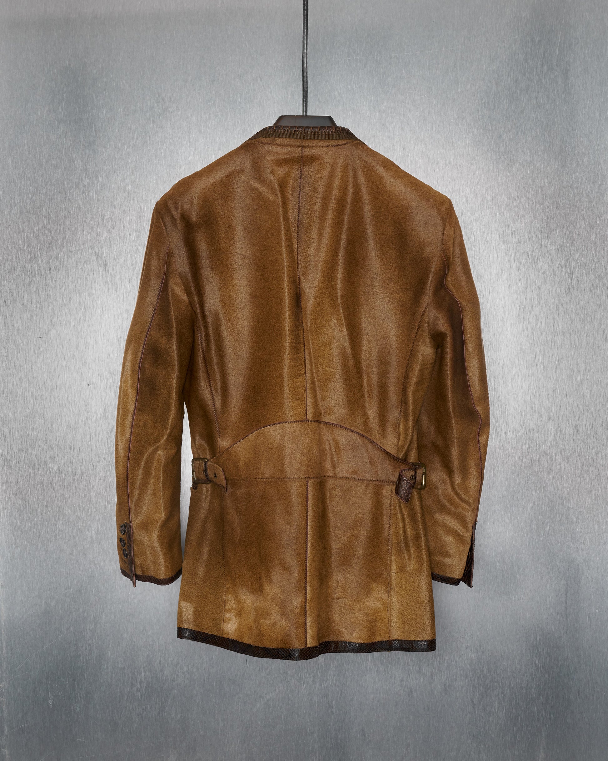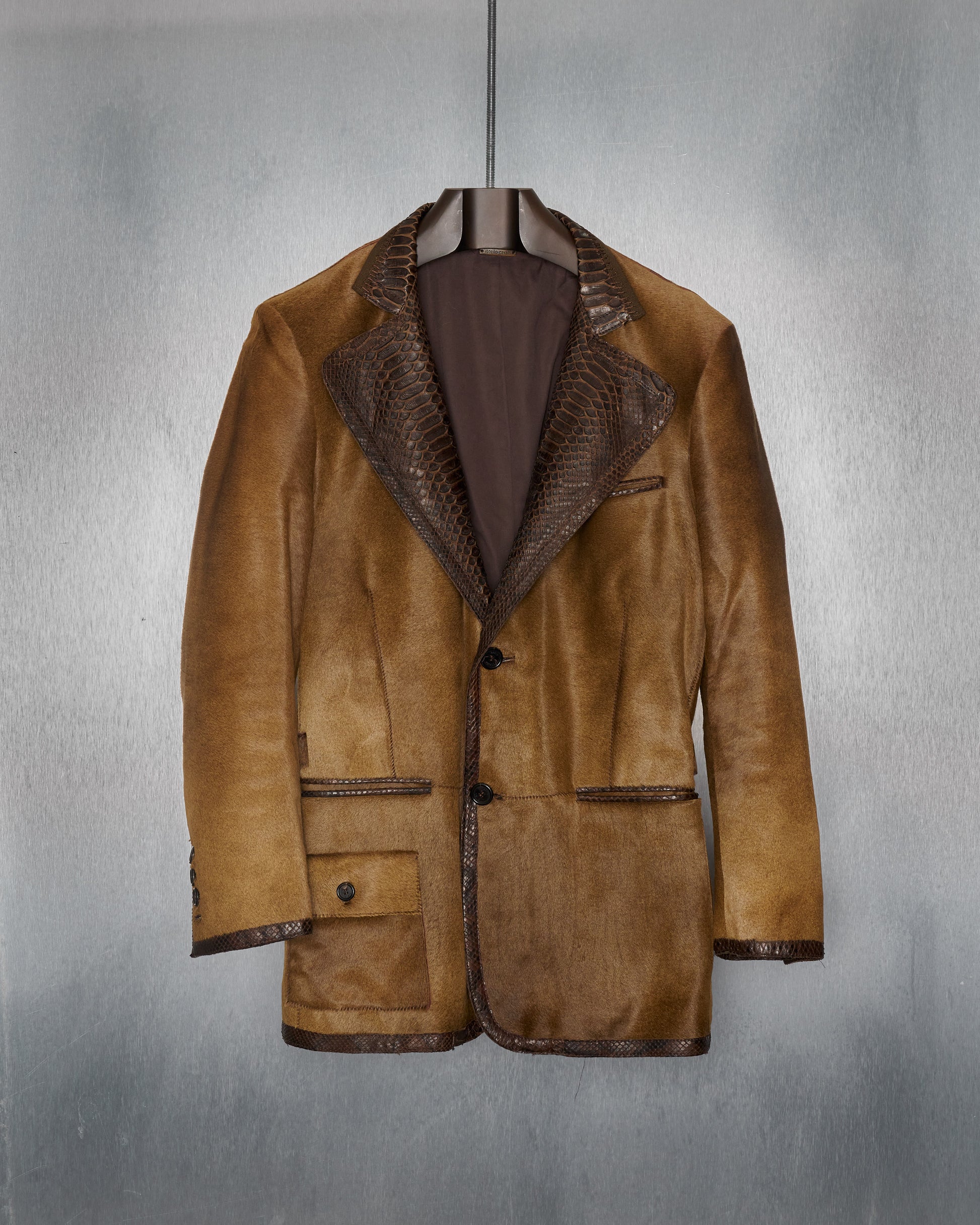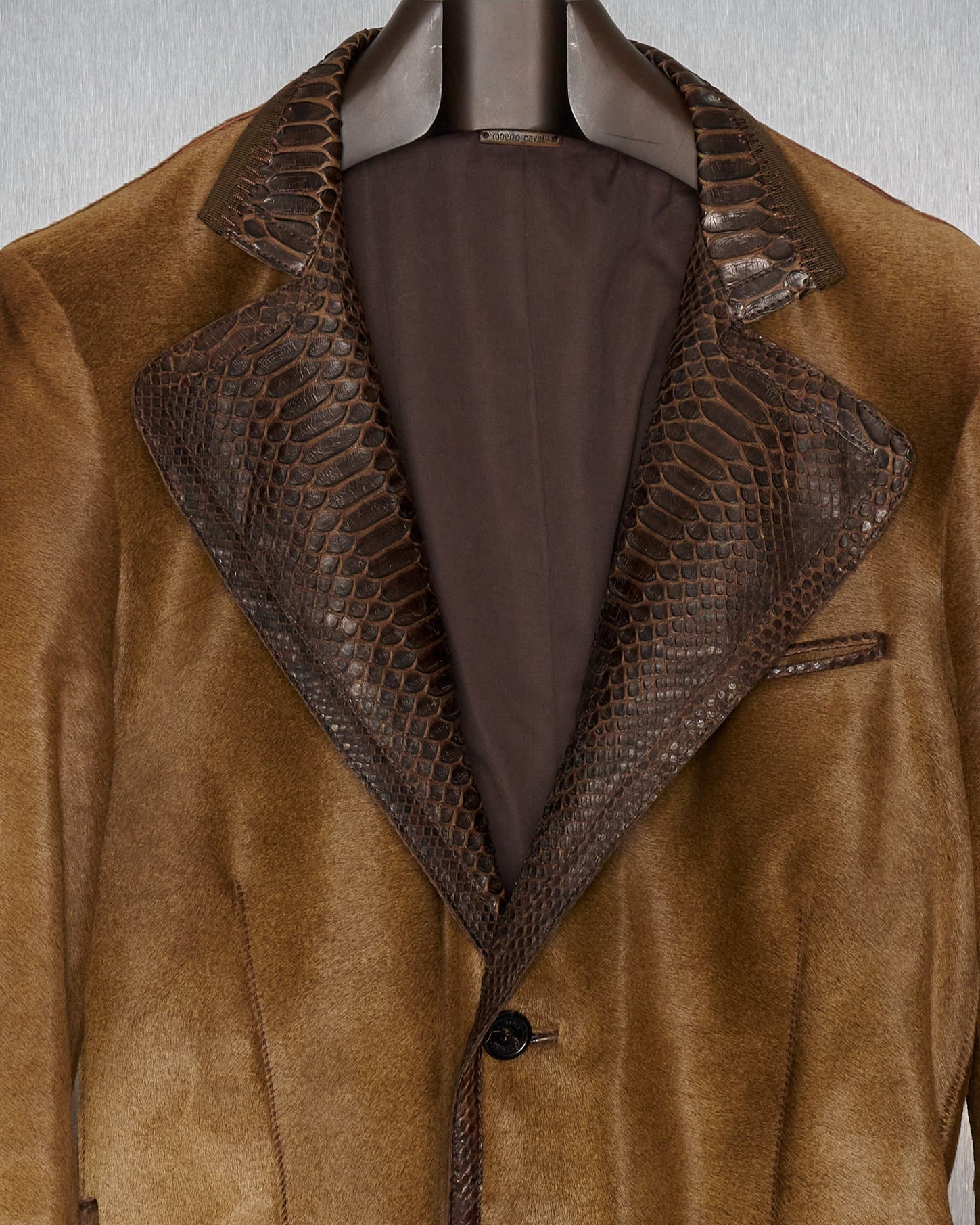 Heavyweight two-button blazer with a triangular, masculine silhouette. The pony fur body provides rigidity and structure, sculpting the wearer's form with sharp angles. Features tanned python skin lapels and trimming, single breast pocket, three hip pockets, three internal pockets, side adjustors. Cotton lining throughout. Specialist clean only
