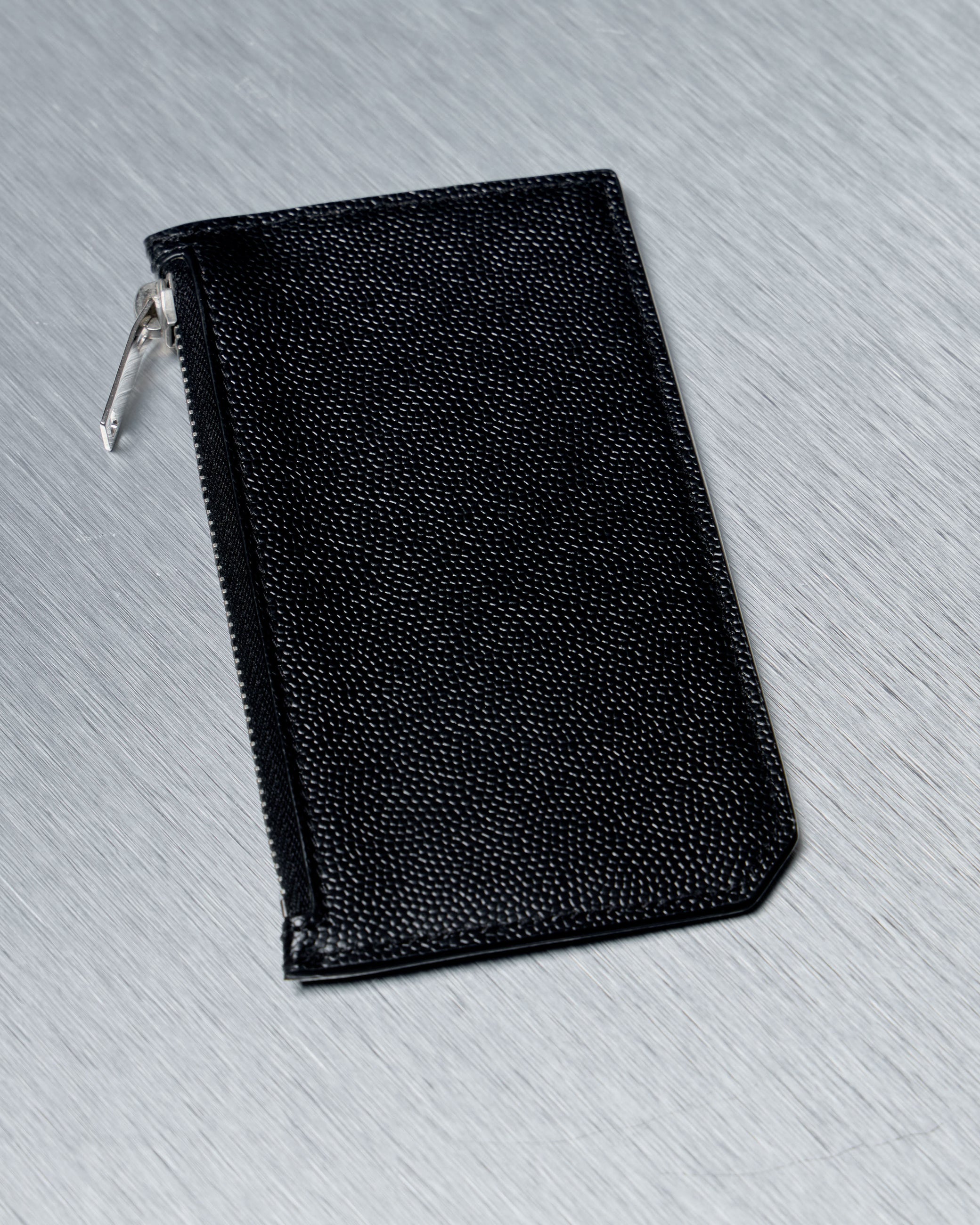 Zipped card case in textured grain de poudre calfskin leather, featuring metal-free and chrome-free tanning for a sustainable finish. Designed with five front card slots, a gusseted side, and an embossed Saint Laurent signature, this zip case combines refined craftsmanship with modern functionality.