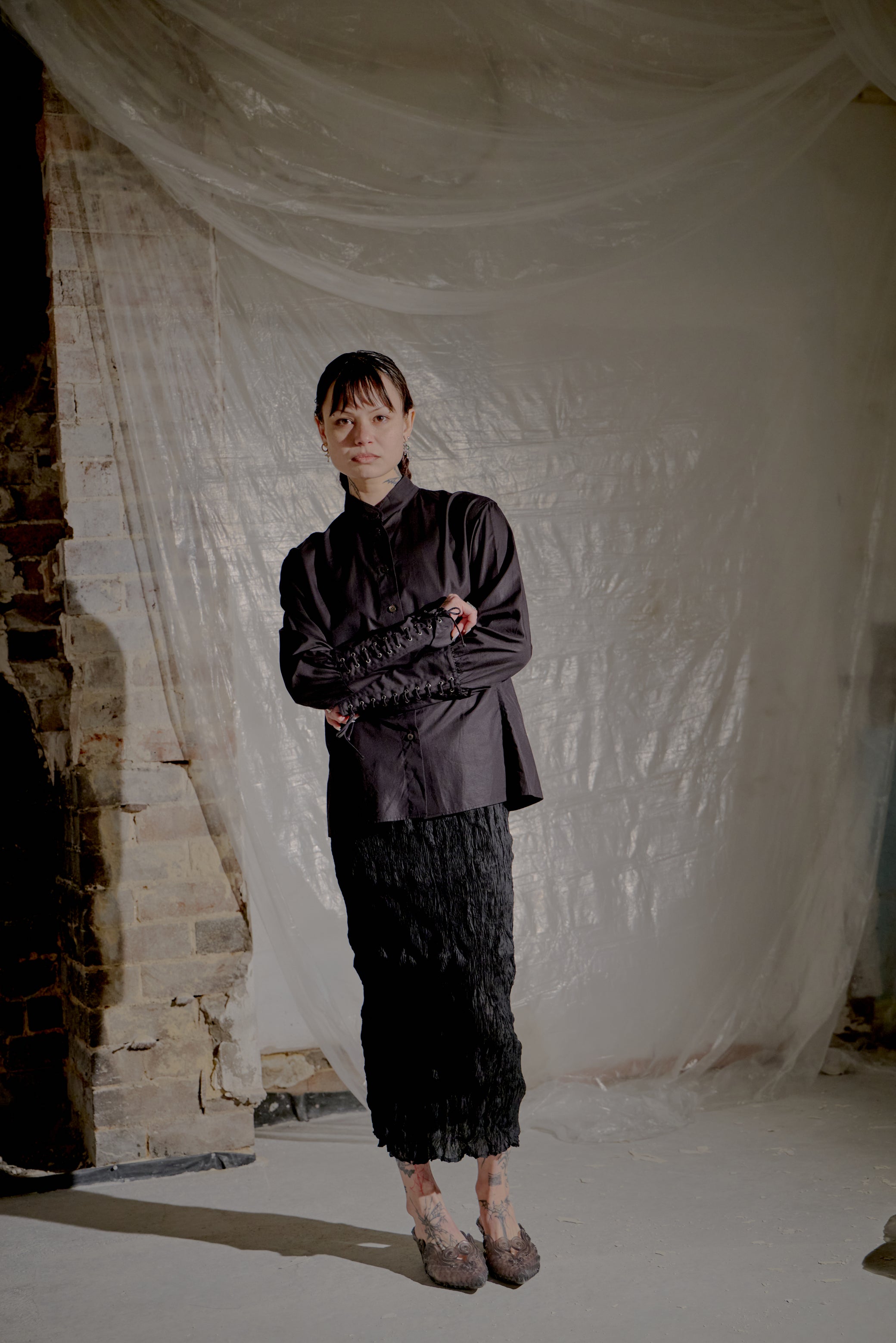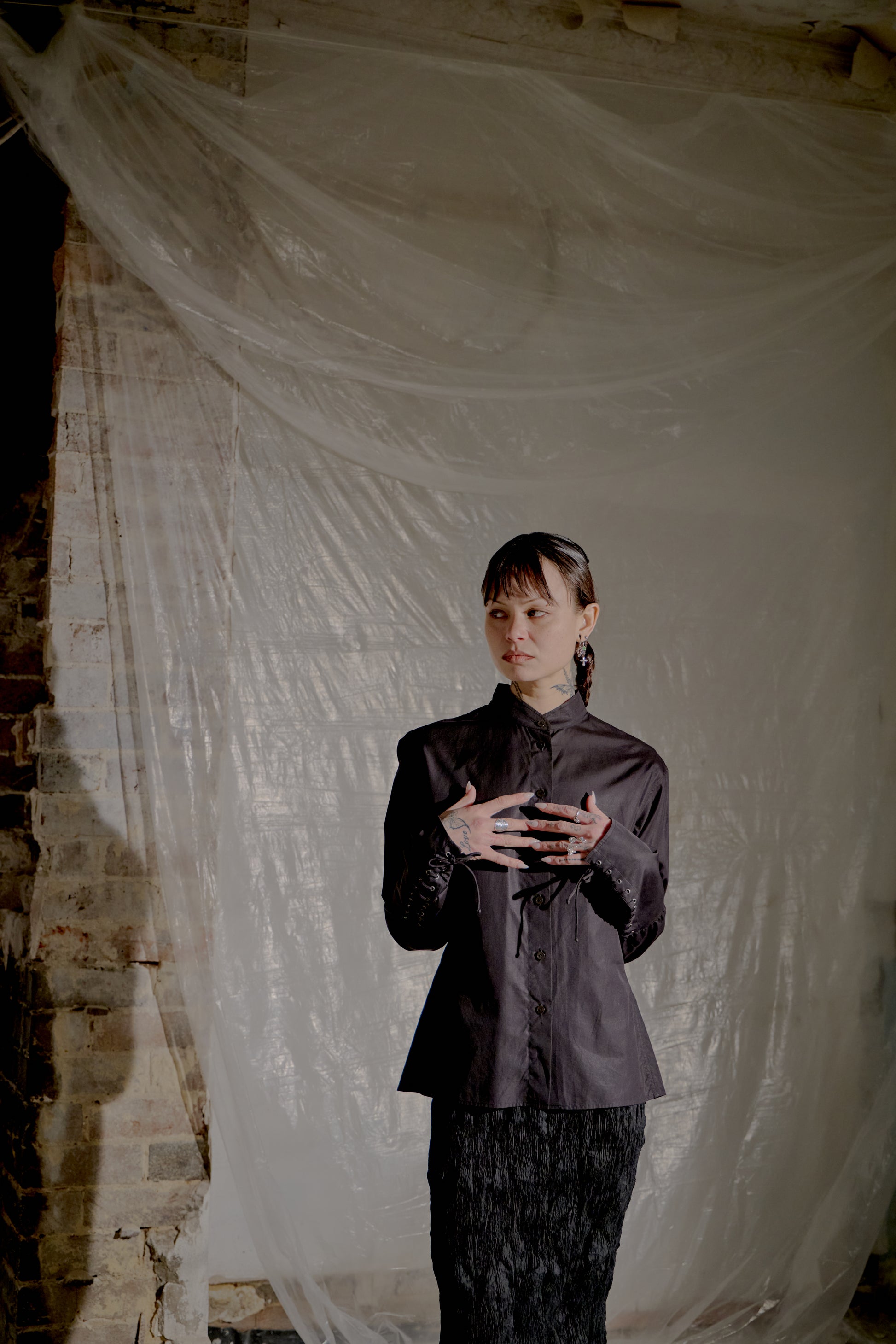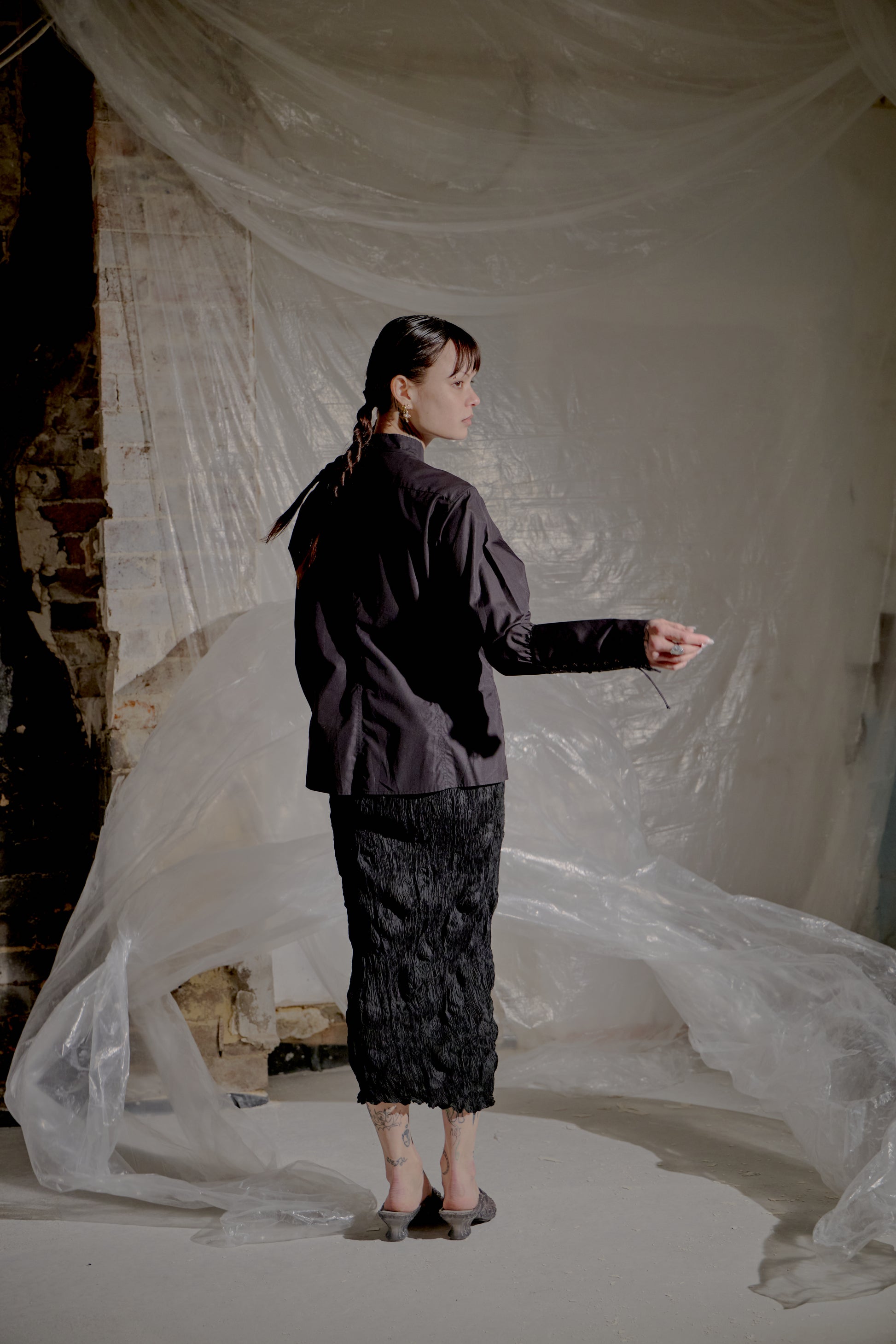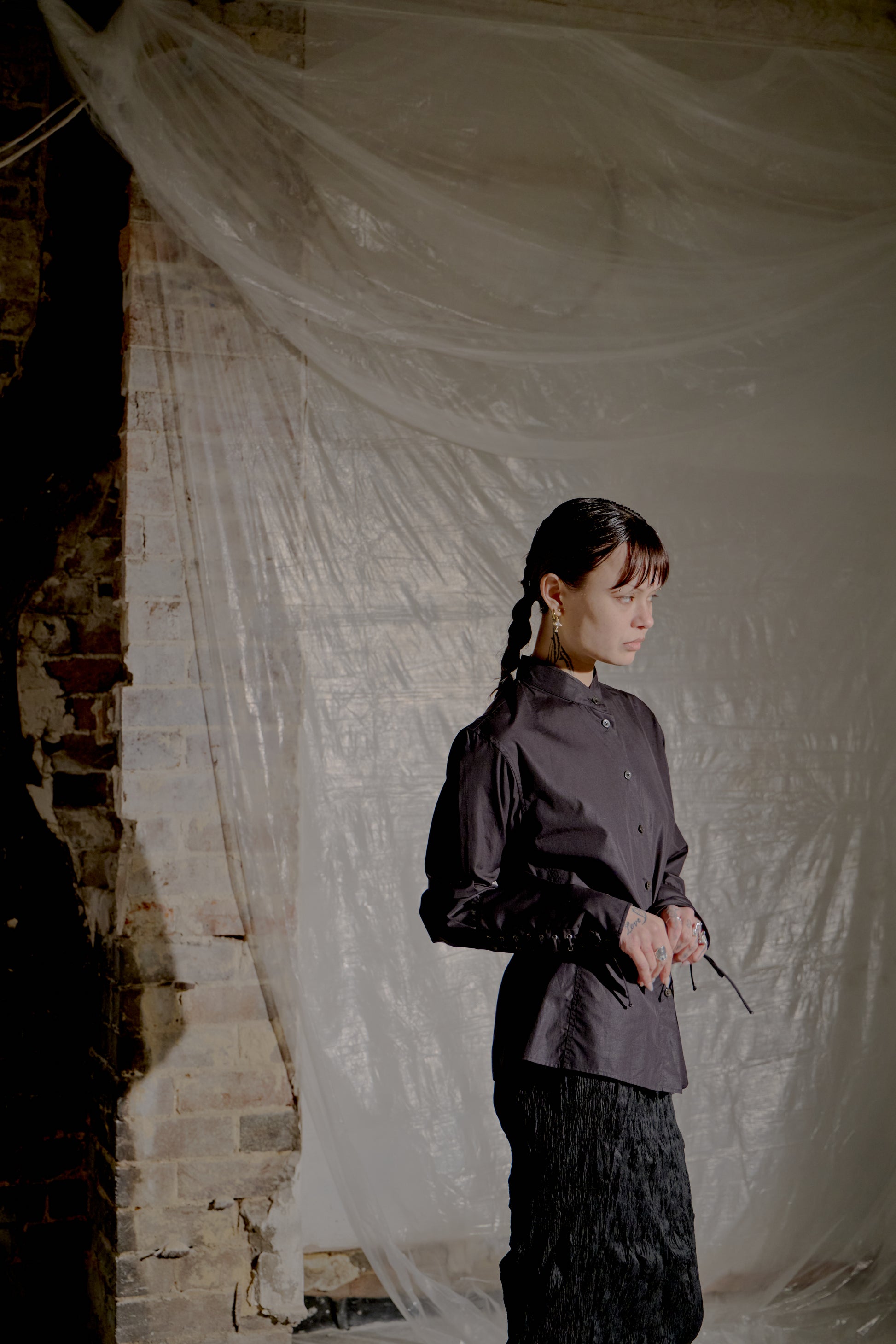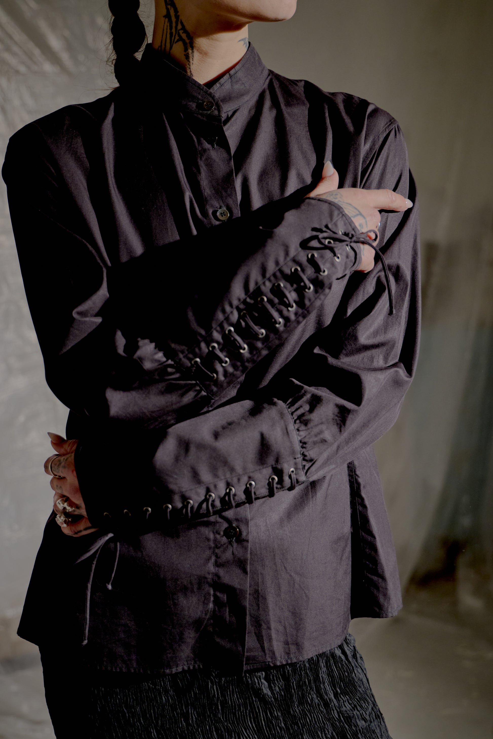A sexy and alluring shirt silhouette by Tom Ford during his tenure as creative director for Saint Laurent concluding in 2004. This Fall/Winter 2001 style features a dramatic cinched silhouette, mandarin collar, button placket closure and corset laced cuffs.