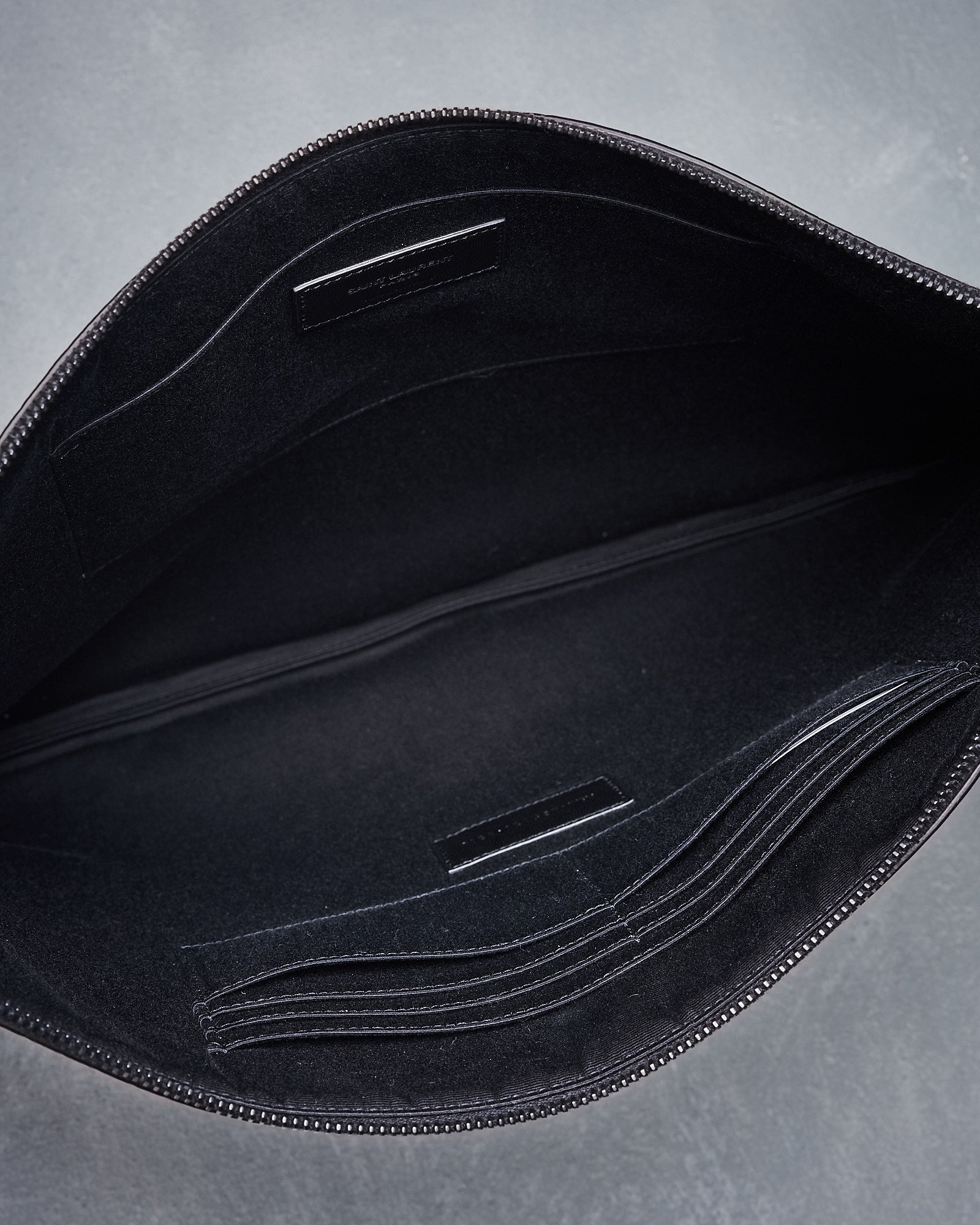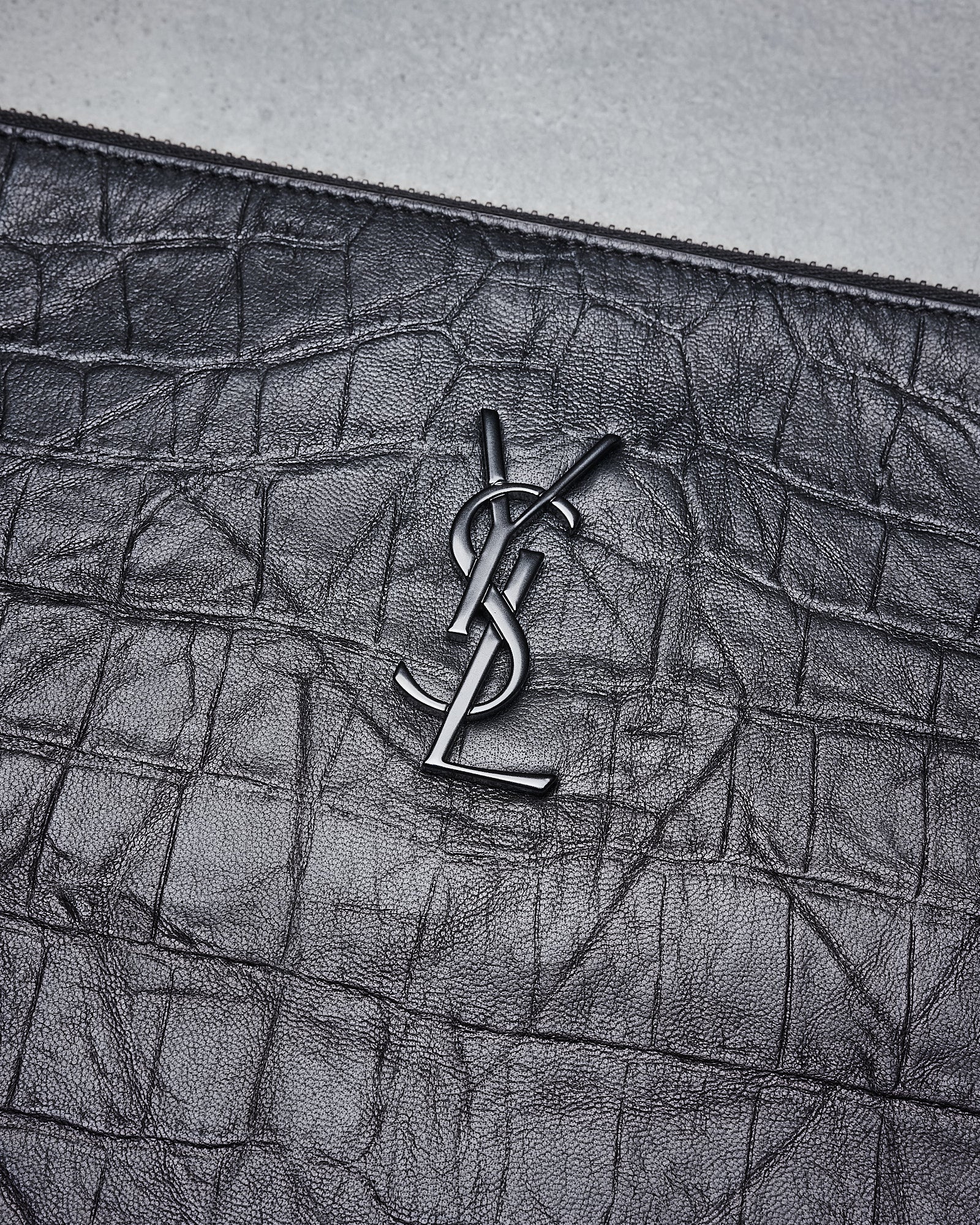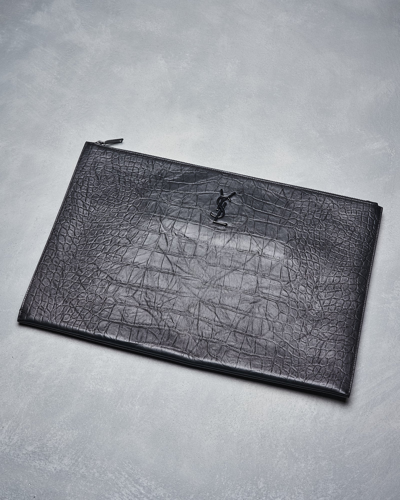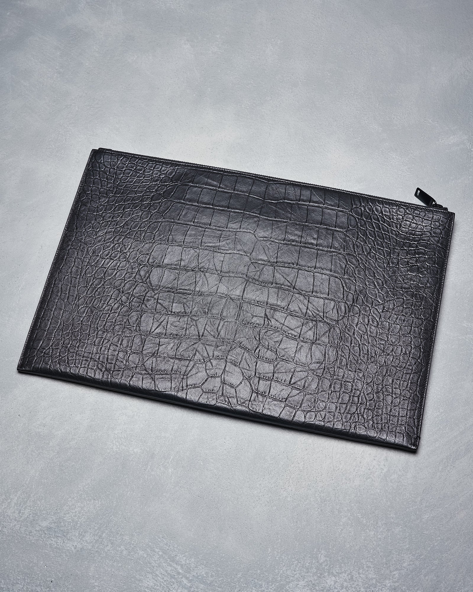 slim crocodile-embossed portfolio clutch in grained leather adorned with a black metal house monogram and corresponding hardware. Features two internal open pockets, eight card holders, and fabric lining. Room to fit a laptop; or tablet, wallet, and phone.