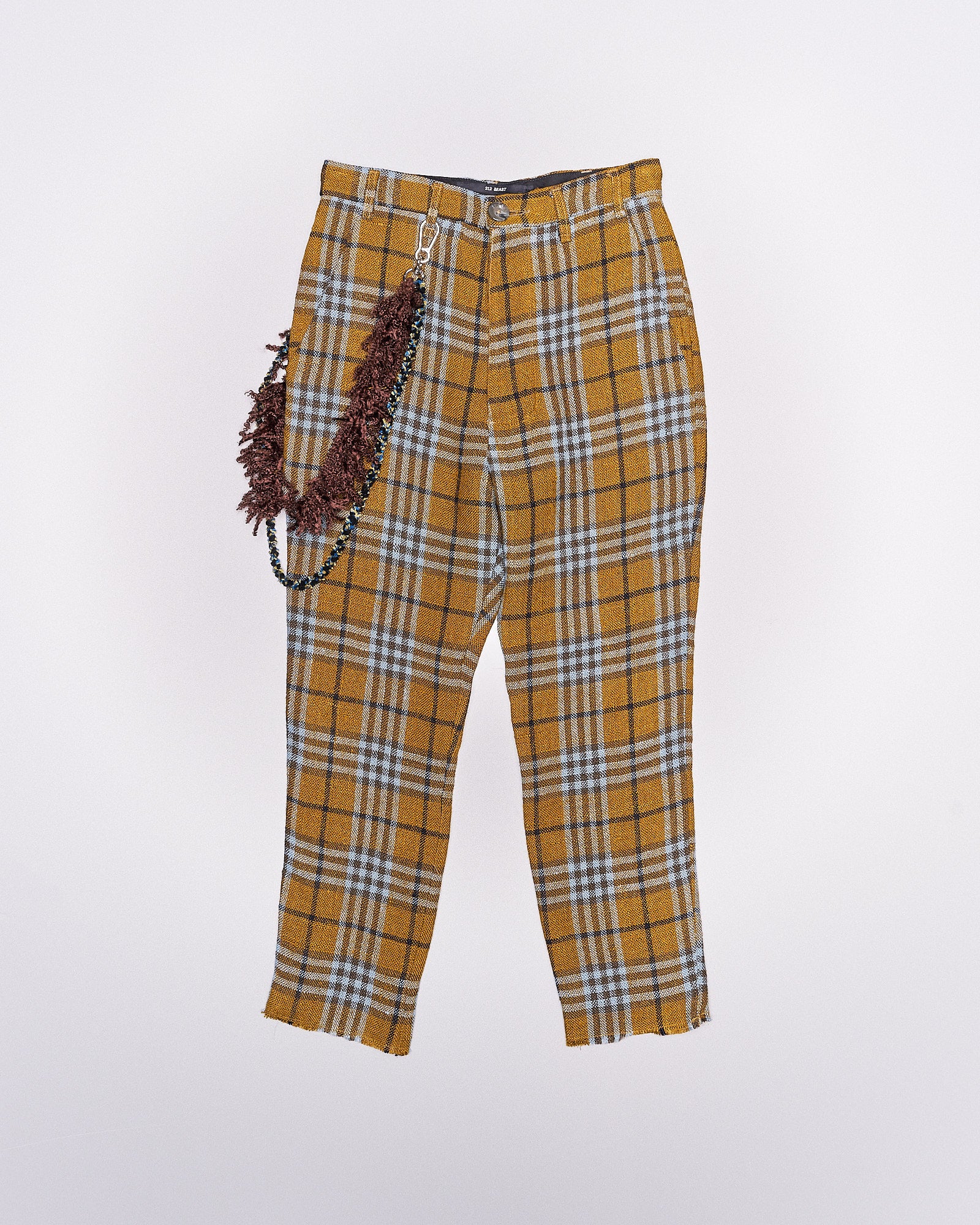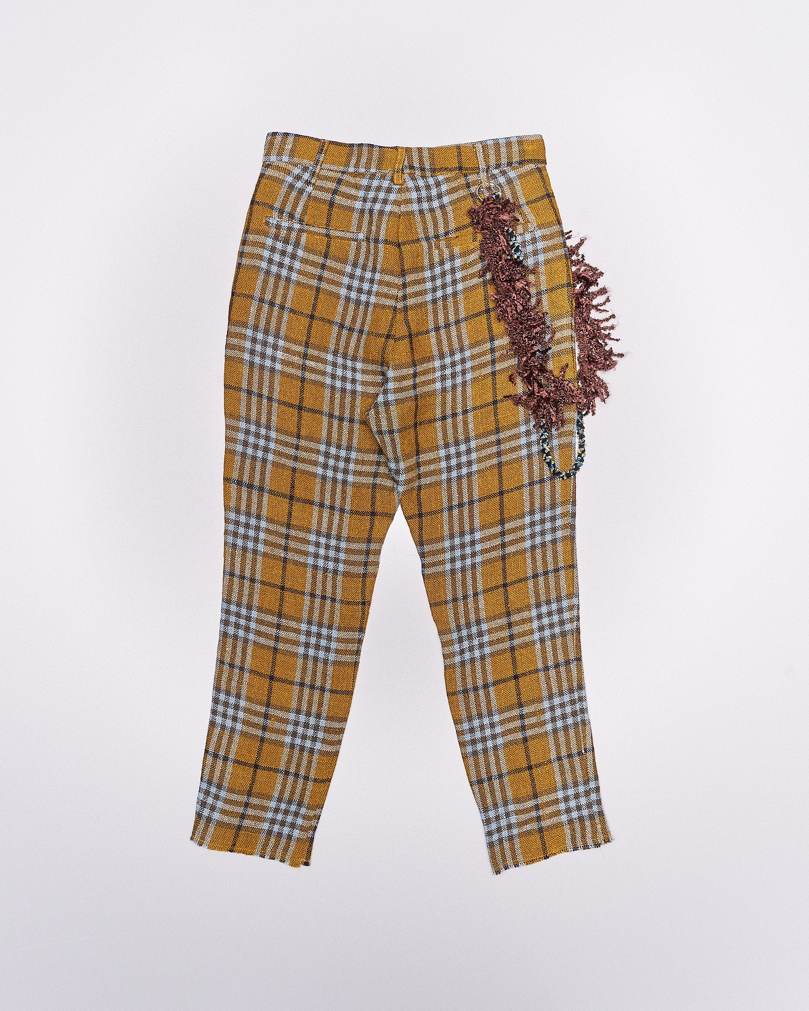 AW 2021 Femme collection Mid-rise trousers in loose weave checked jute. Tapered silhouette with a cropped length. Features a button-fly closure, four pockets, and textural shag lanyard. Dry clean only