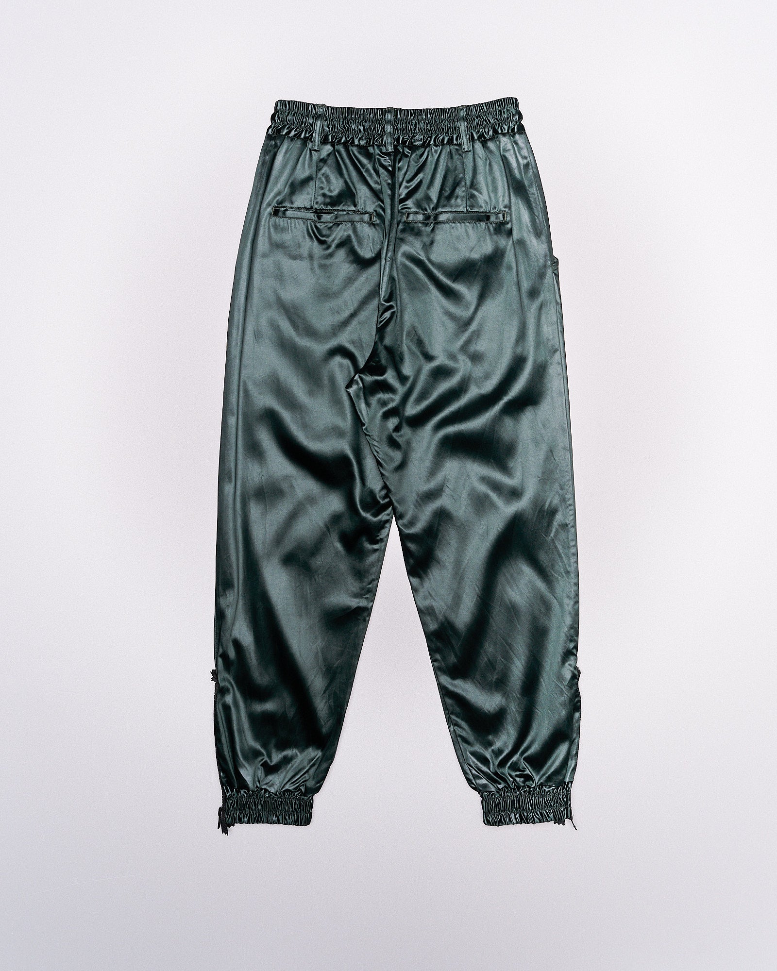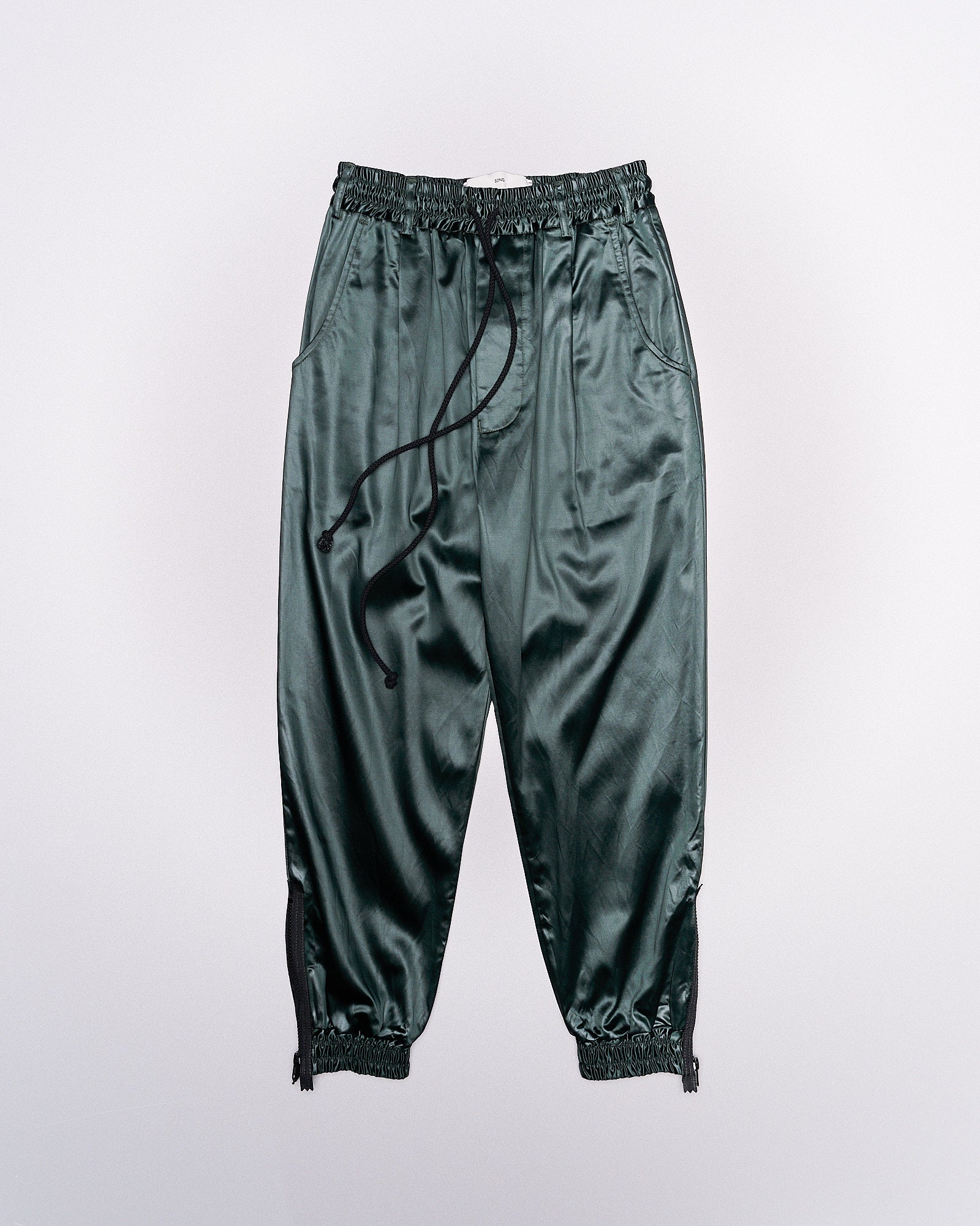Pleated track pant in flowing mid-weight gloss fabric. Tapered legs and zip cuffs for an athletic silhouette. Features an elasticised waistband with exaggerated cord, four pockets. Dry clean recommended.