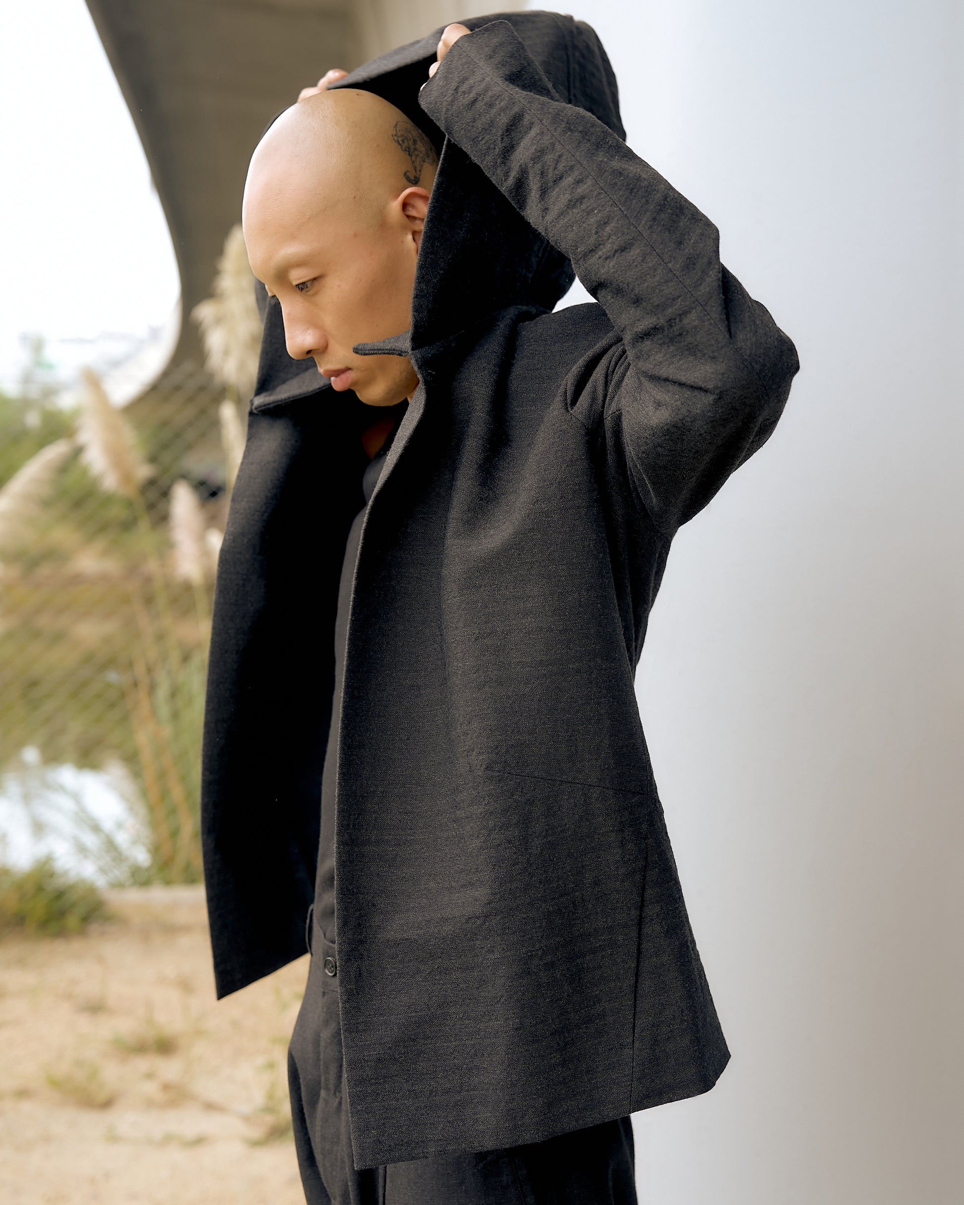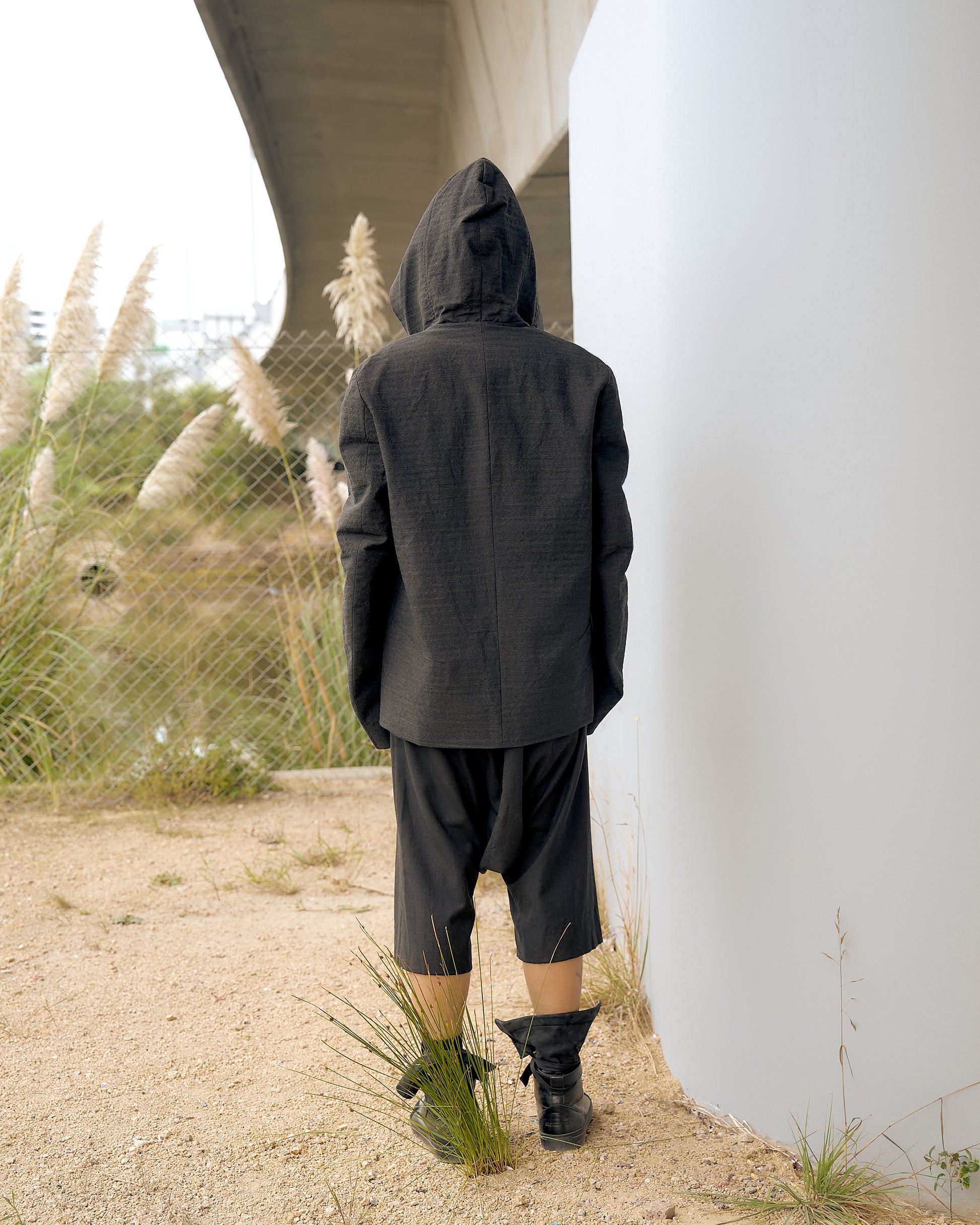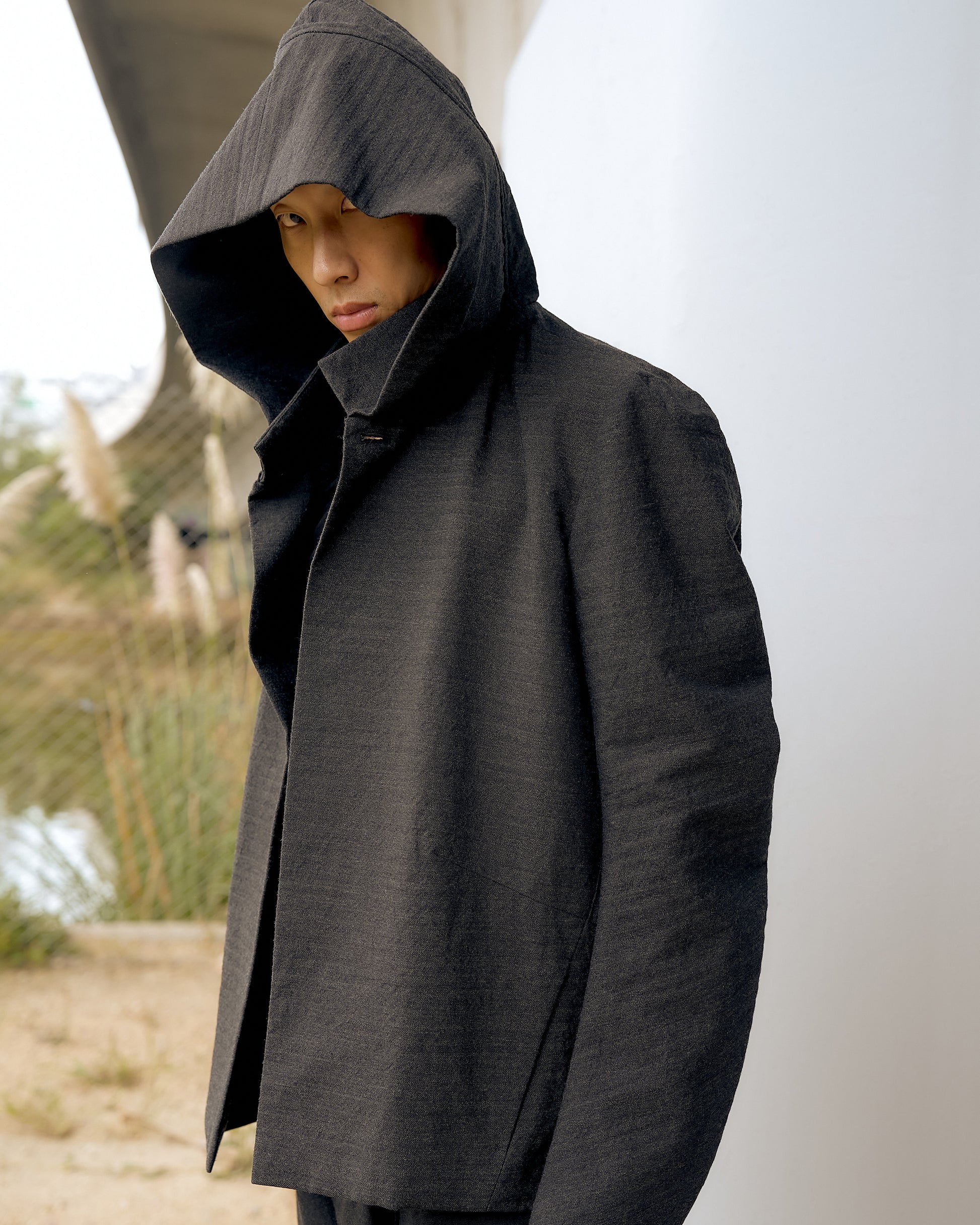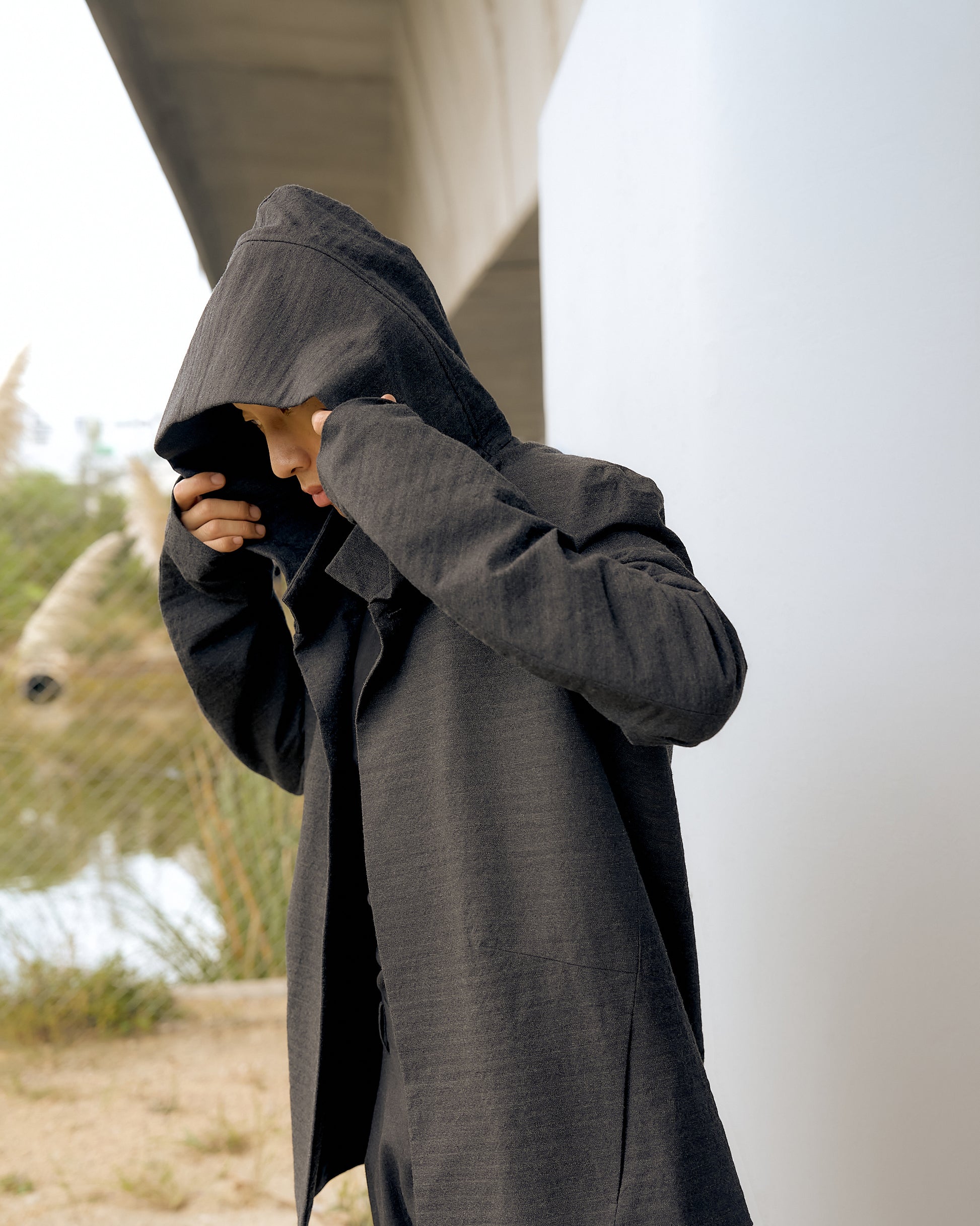Song For The Mute Archive piece, presented in one of the earliest formative collections for the cult Australian label. Open-style hooded jacket in horizontal wool twill. Curved geometric panels cocoon the form around the body. Features a button-closure on the neck, two hip pockets, two internal pockets. Lined throughout. Dry clean only