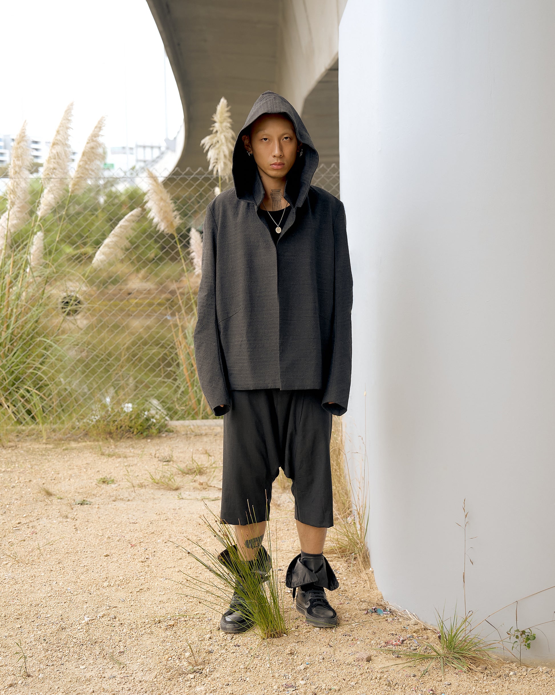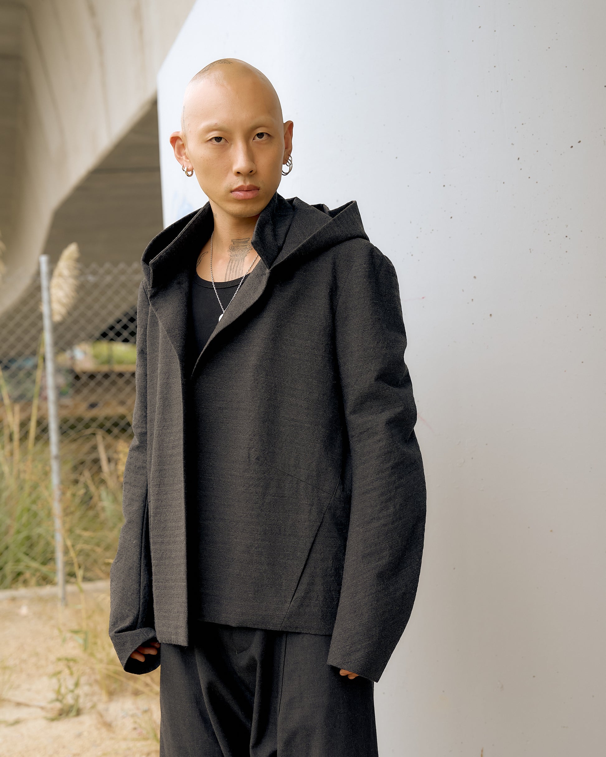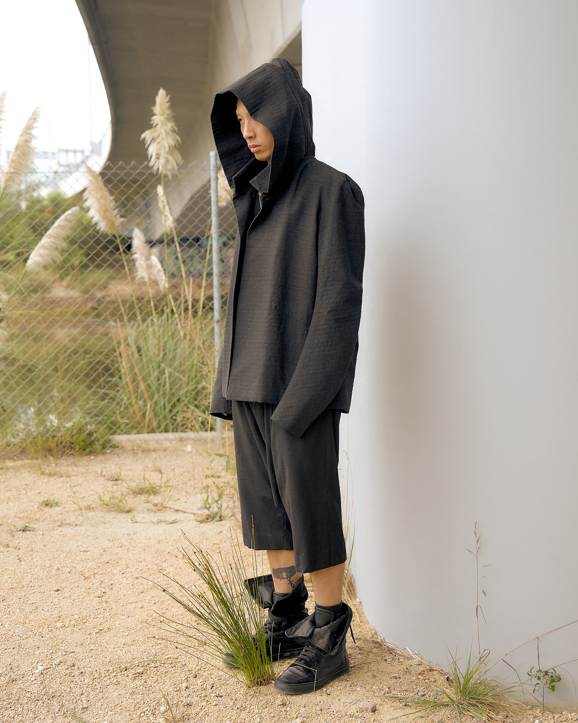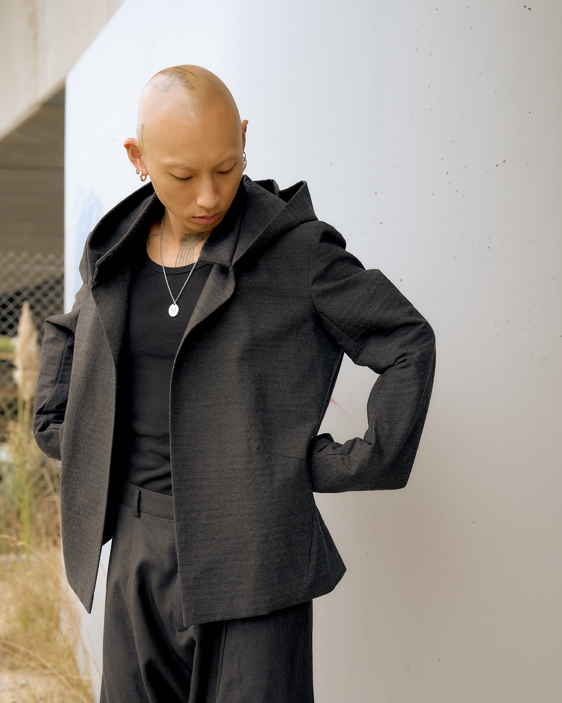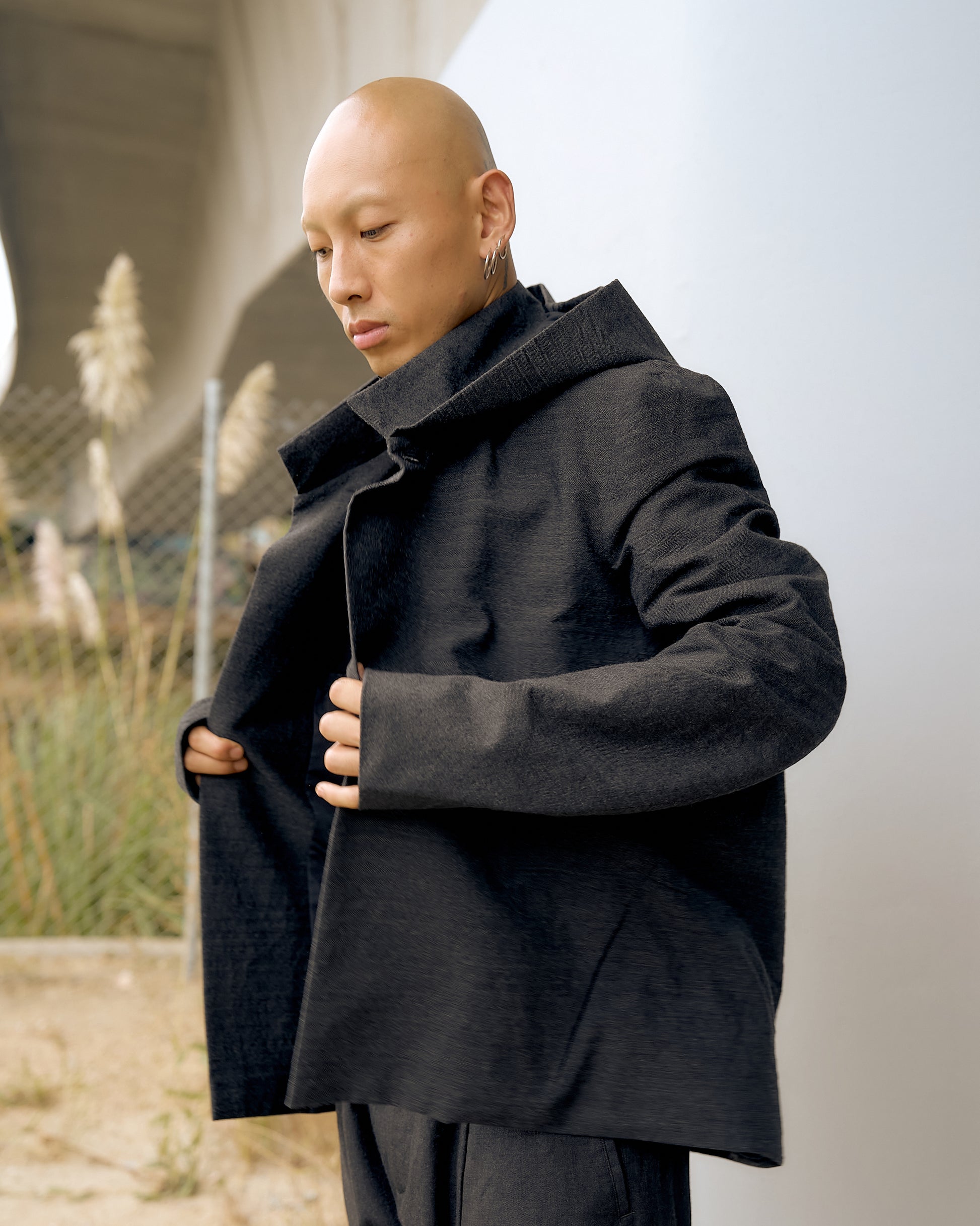 Song For The Mute Archive piece, presented in one of the earliest formative collections for the cult Australian label. Open-style hooded jacket in horizontal wool twill. Curved geometric panels cocoon the form around the body. Features a button-closure on the neck, two hip pockets, two internal pockets. Lined throughout. Dry clean only
