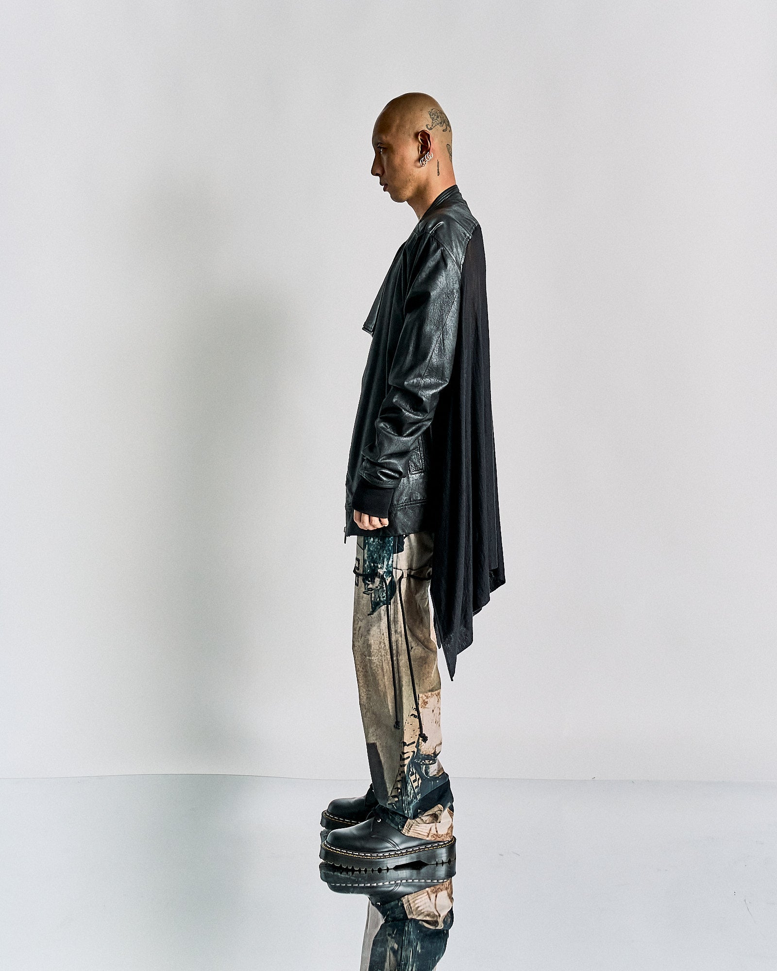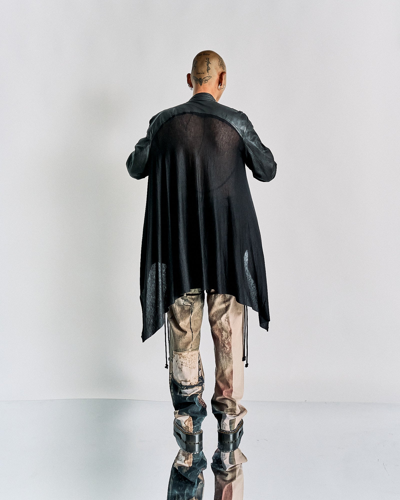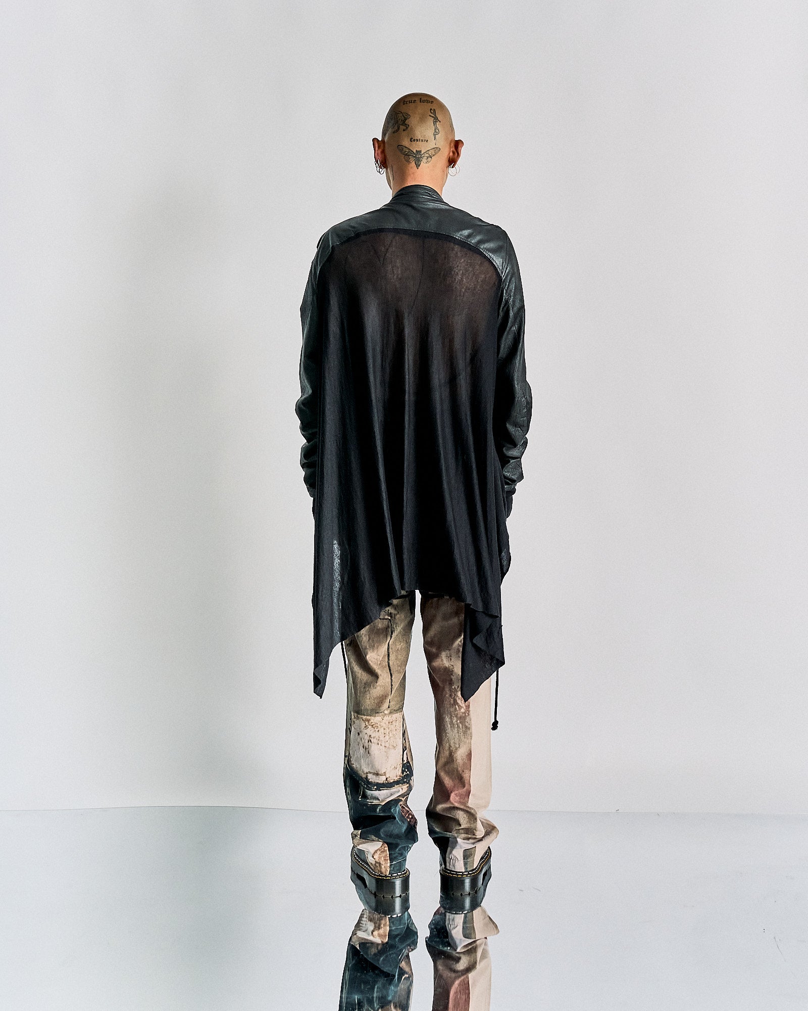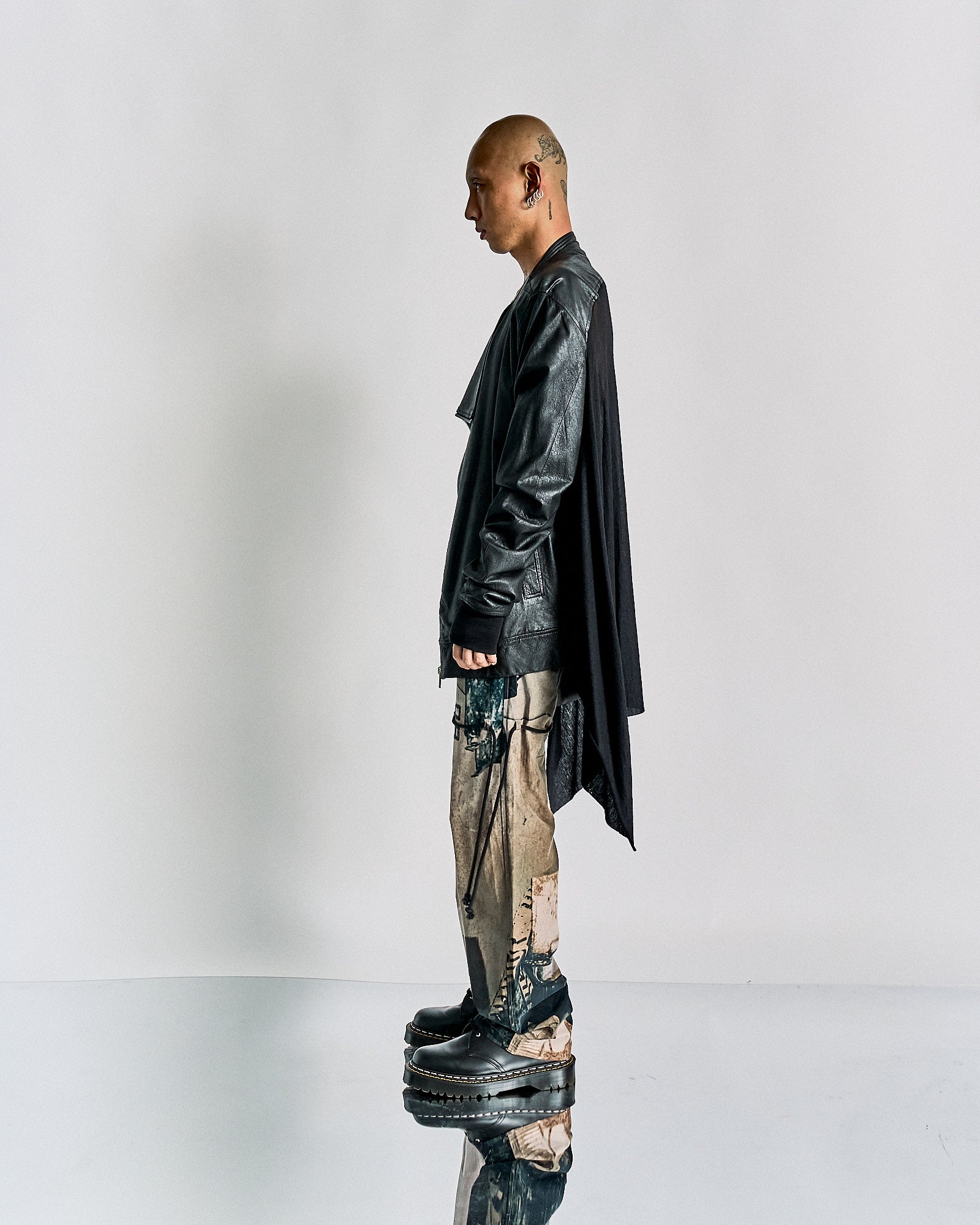 Sculptural lamb leather jacket with flowing sheer silk cape. The soft leather front features bomber-inspired ribbing on cuffs and base, with a bold asymmetric front zip creating a wave-like collar. The lightweight silk back creates a dramatic flowing silhouette with the sheer marl revealing the wearer beneath. Features zip hardware and press stud closures, belt detail at waist. Specialist dry clean only