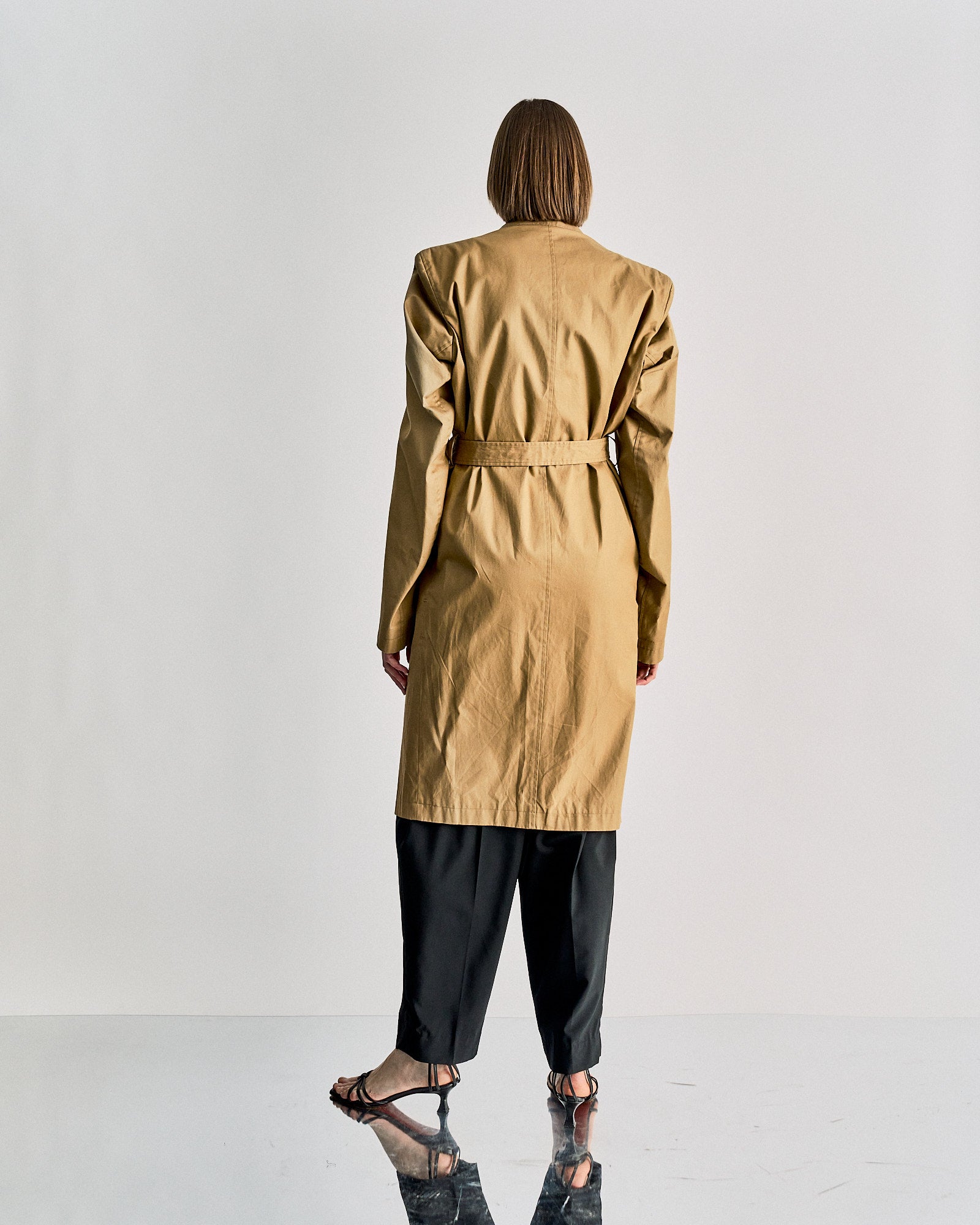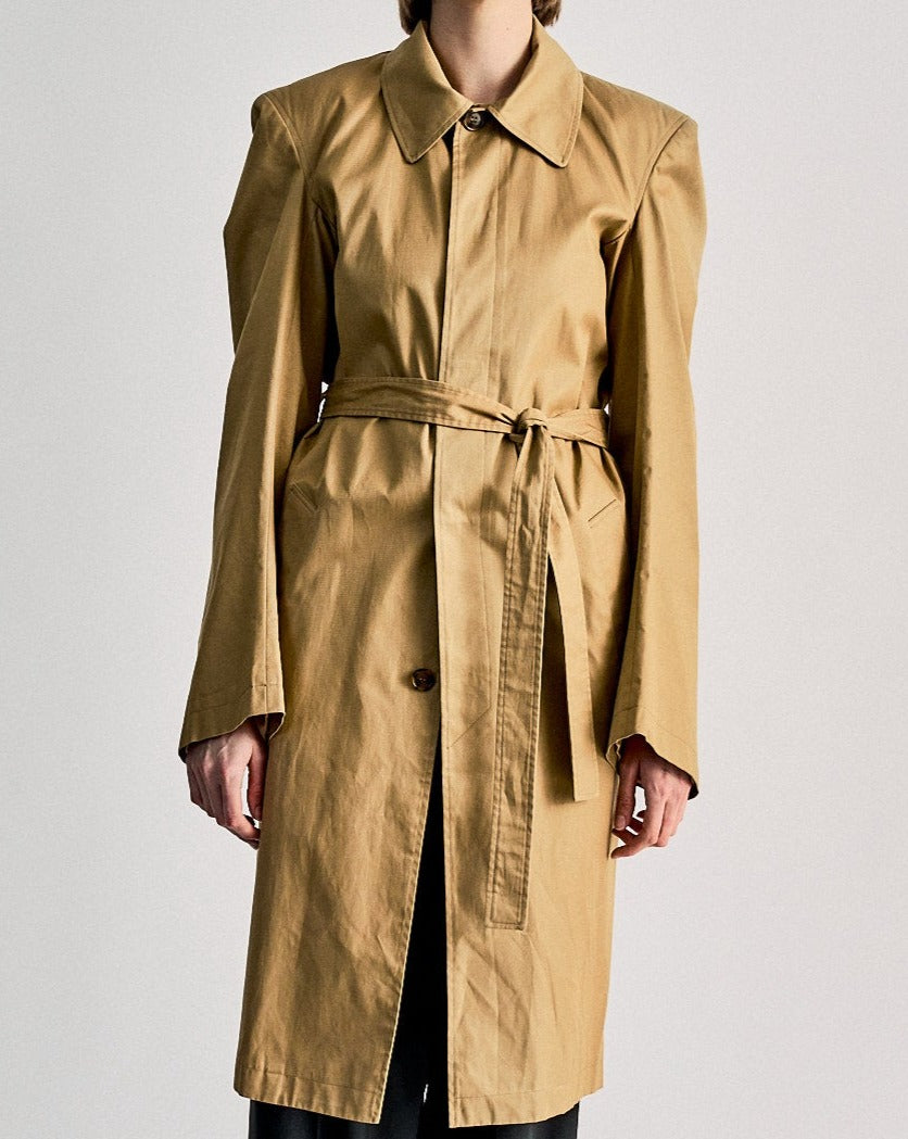 Knee-length Macintosh coat constructed from stiff cotton canvas with wide spread collar and hidden front-button closures. Features exaggerated shoulder padding, tonal belt, two front pockets. Dry clean only