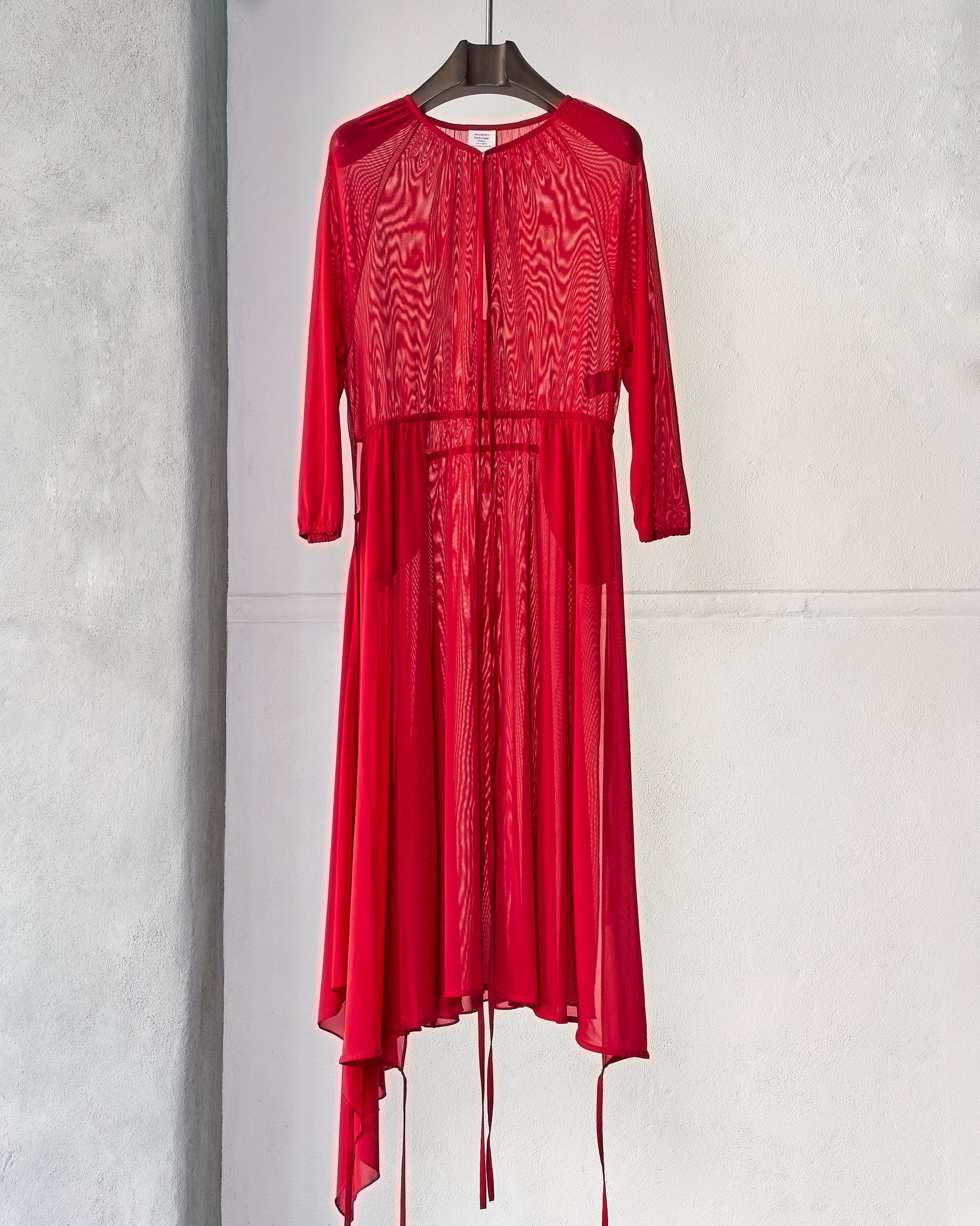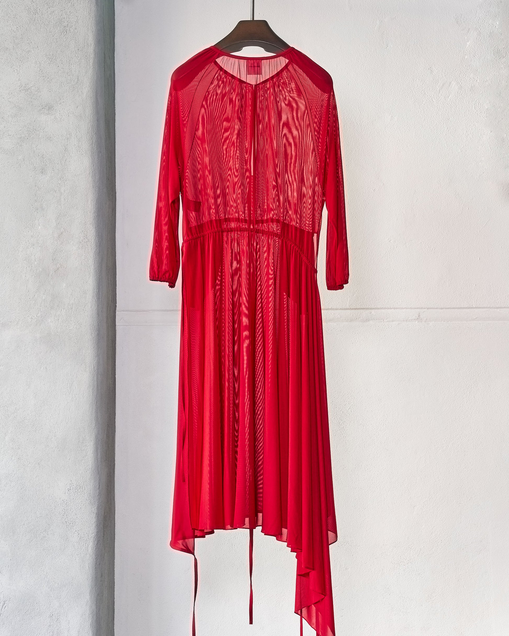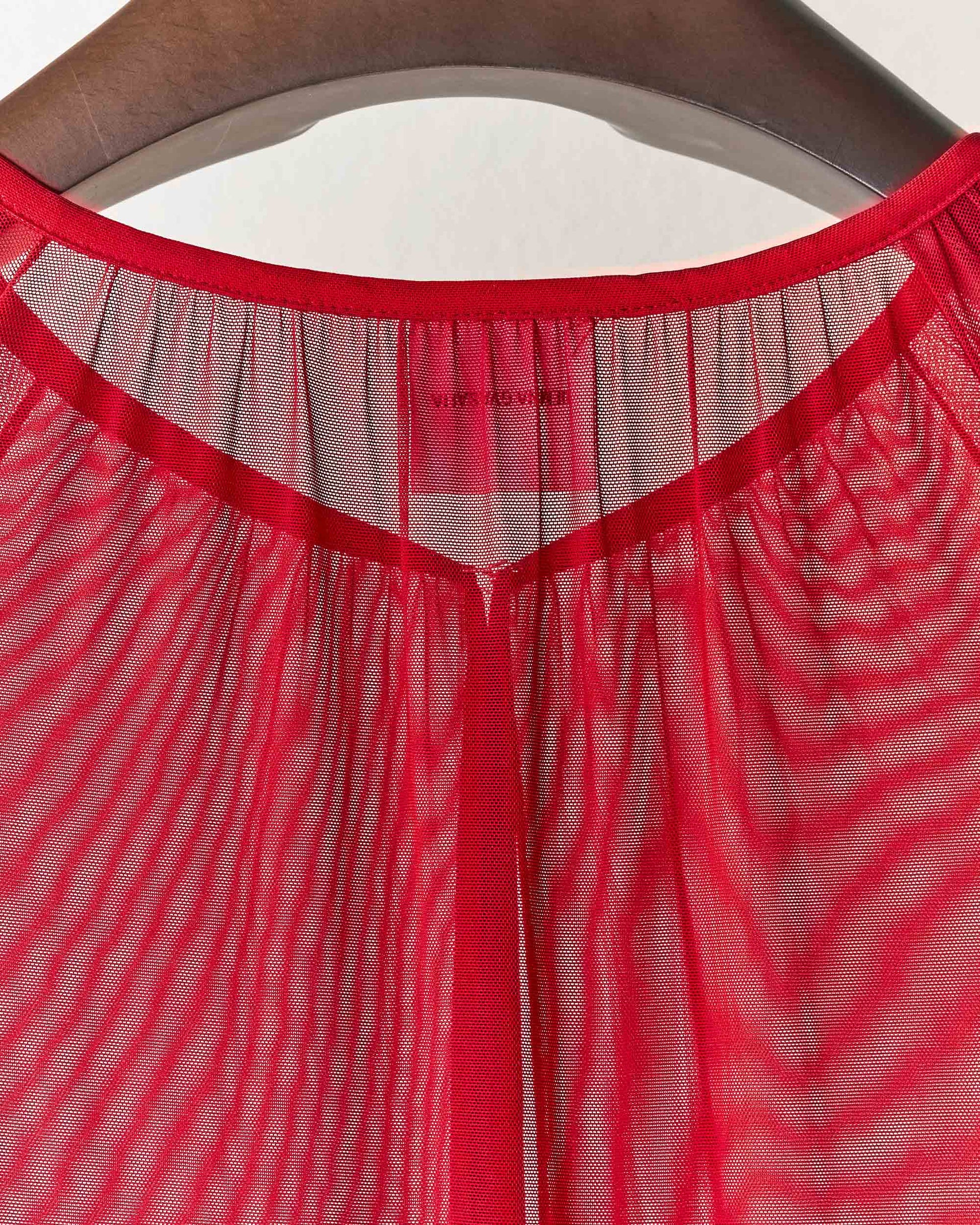 Tulle mesh stretch dress with sheer outer layers revealing internal construction. Hook and eye closure at chest, elasticated cuffs, asymmetric hem with string detail for adjustable drapery. Two hip pockets. Dry clean only.