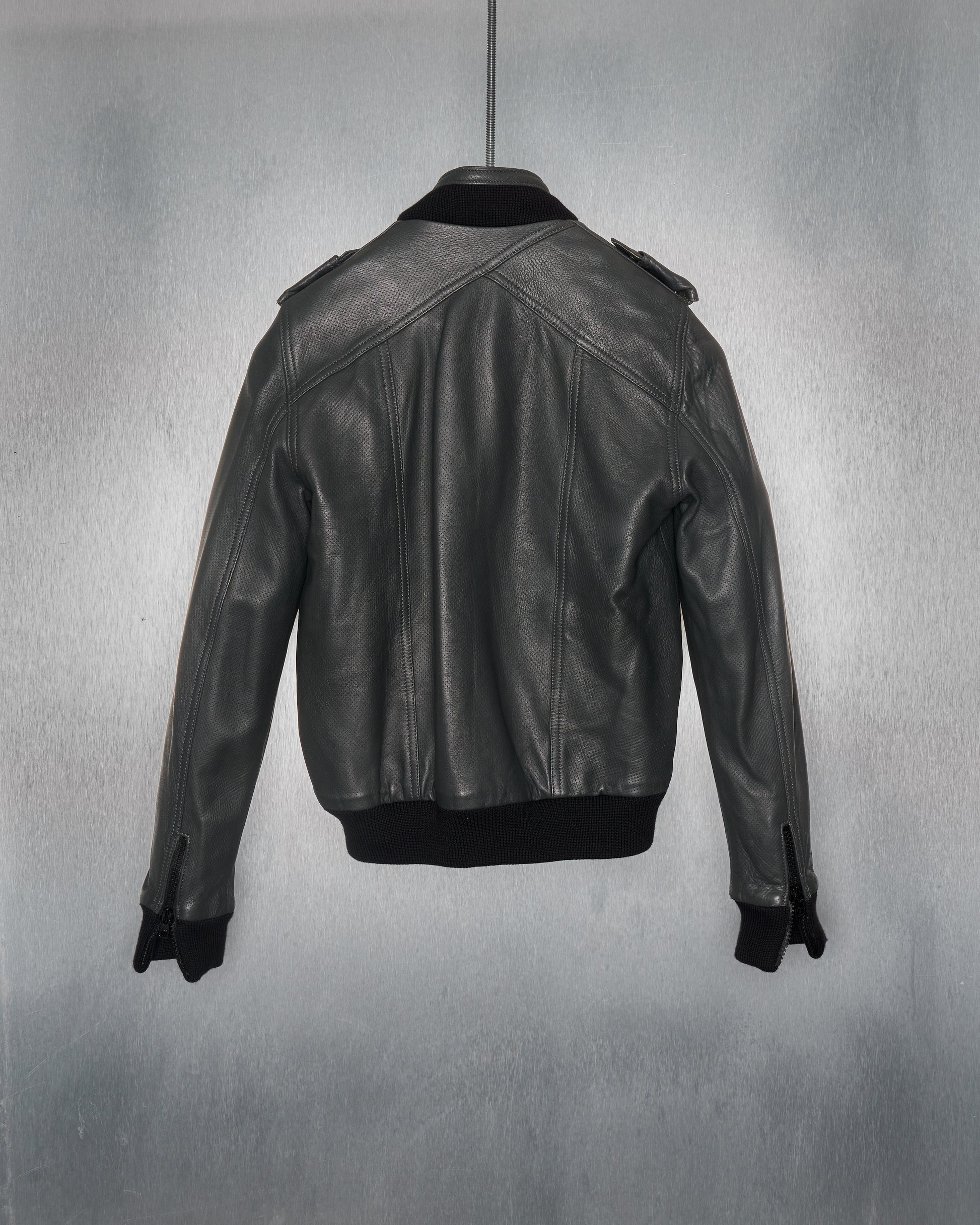 Slim moto jacket in perforated Napa lambskin. The front zip closures include additional fold-over press stud closures for a skinnier, unkempt silhouette. Features six external pockets with wound-like blood red lambskin lining, quilted interior, internal pocket, ribbed cuffs and base. Specialist clean only.