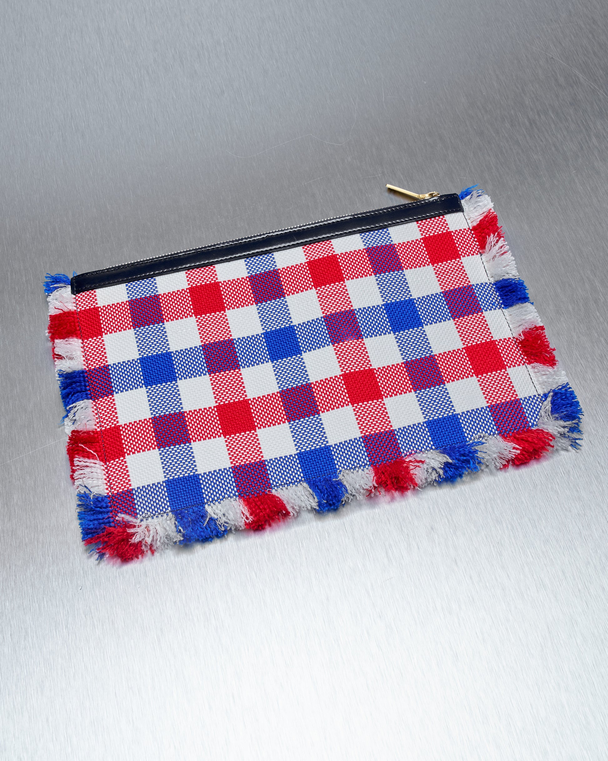 slim-line zip clutch constructed fromwoven jacquard with frayed edge detailing. Features leather detailing and Browne's tri-stripe finishes. The perfect amount of space for a phone and tablet.