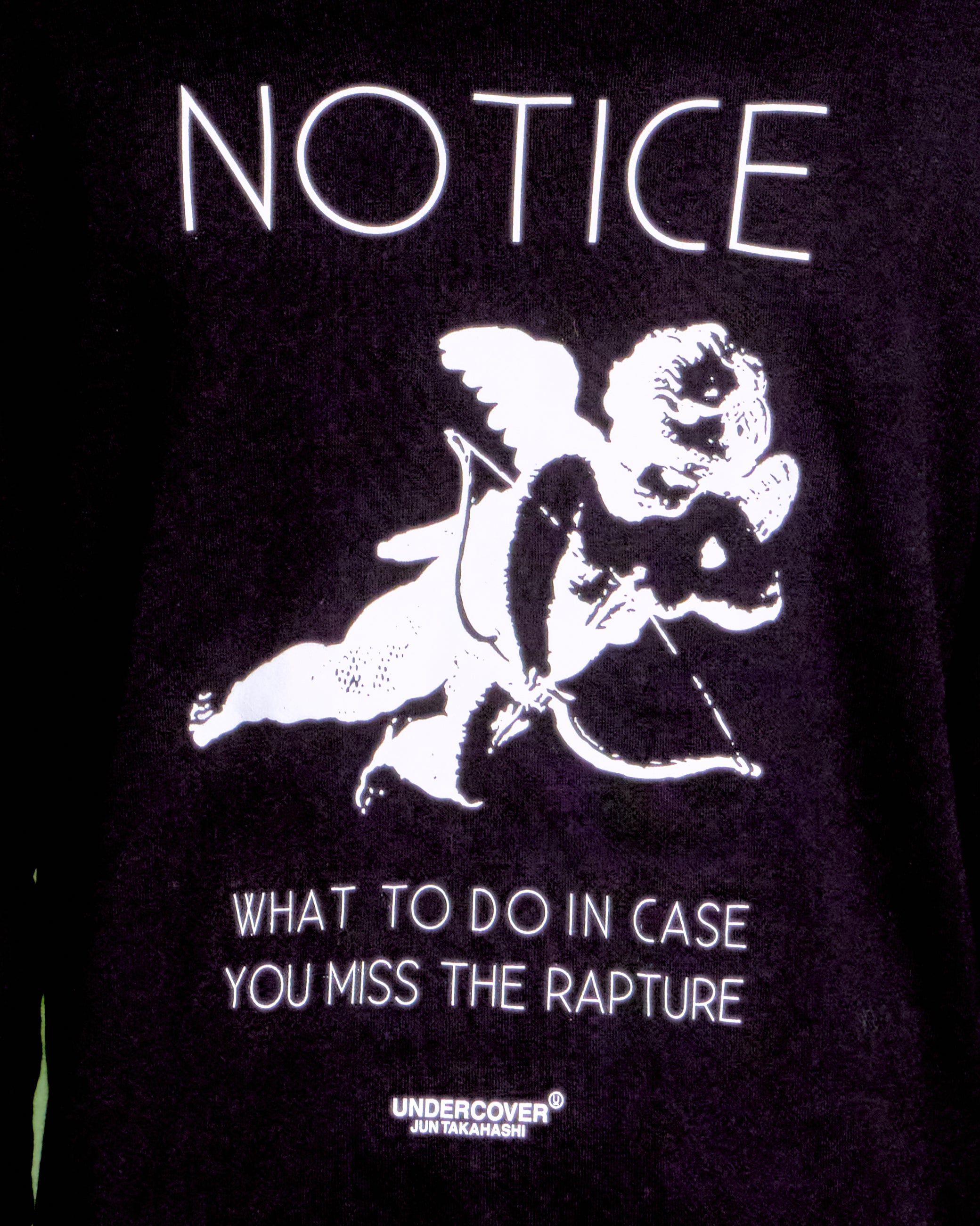 A darkly playful twist on classic iconography, this crewneck from the Japanese brand features a bold cherub graphic and tongue-in-cheek “NOTICE” text. Clean, minimal, and unmistakably Undercover.