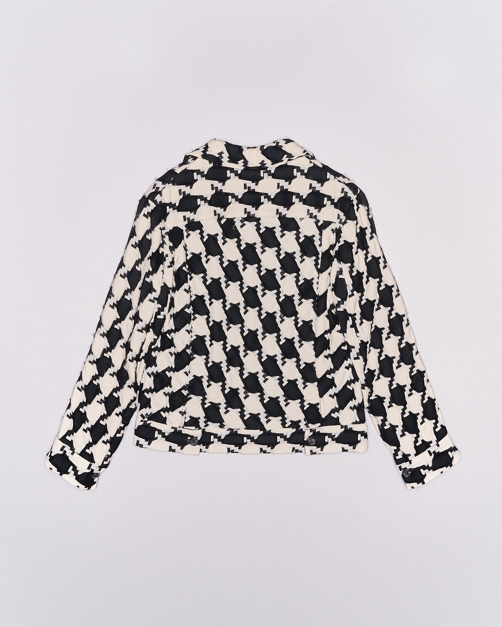 Mid-weight worker jacket in intricately woven houndstooth. Boxy unisex silhouette with spread collar and two flap pockets. Features hidden button-front closures, barrel cuffs, full internal lining. Dry clean only
