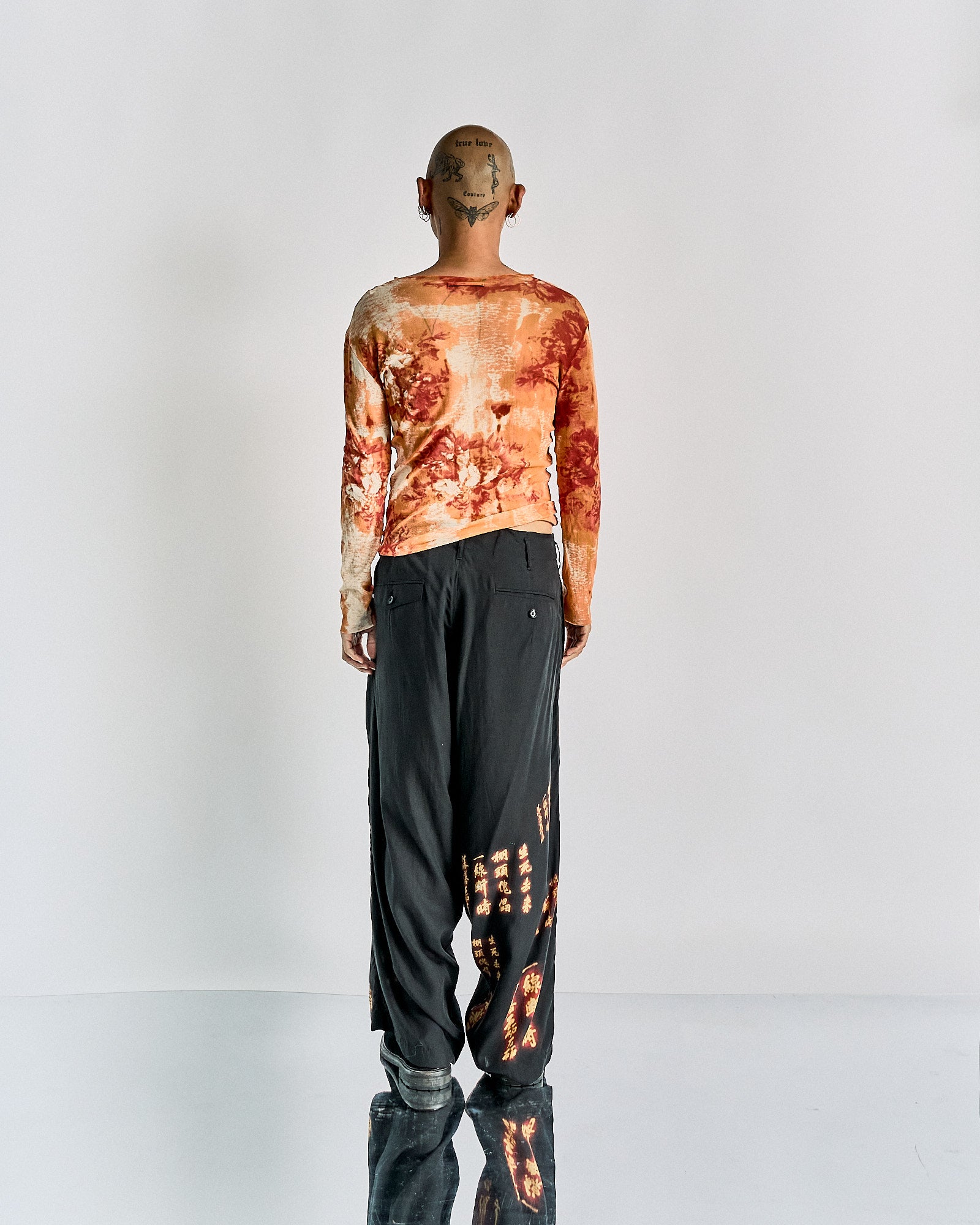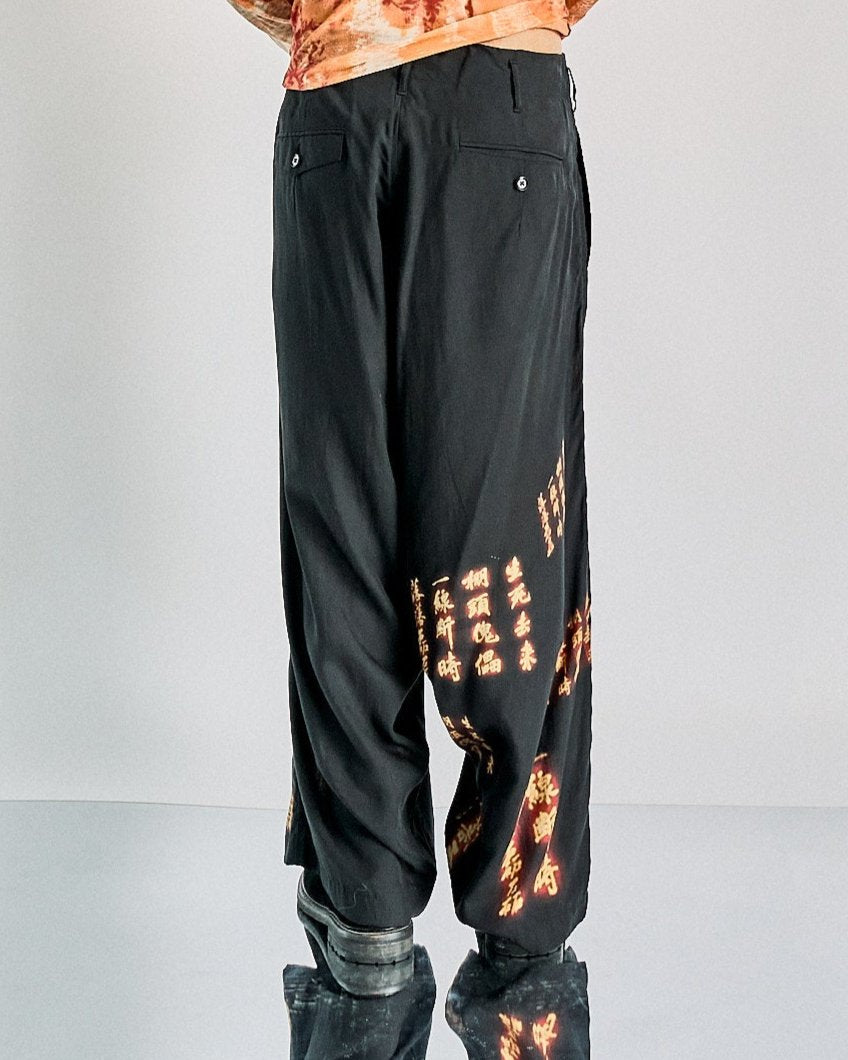 Loose-fit low-rise trousers in Rexcell: a silky lightweight fabric woven from Japanese eucalyptus fibres. A sublimation print of Japanese kanji from Ghost in the Shell 2: Innocence adorns the entirety of the pants. Features belt loops, two hip and rear pockets. Dry clean only