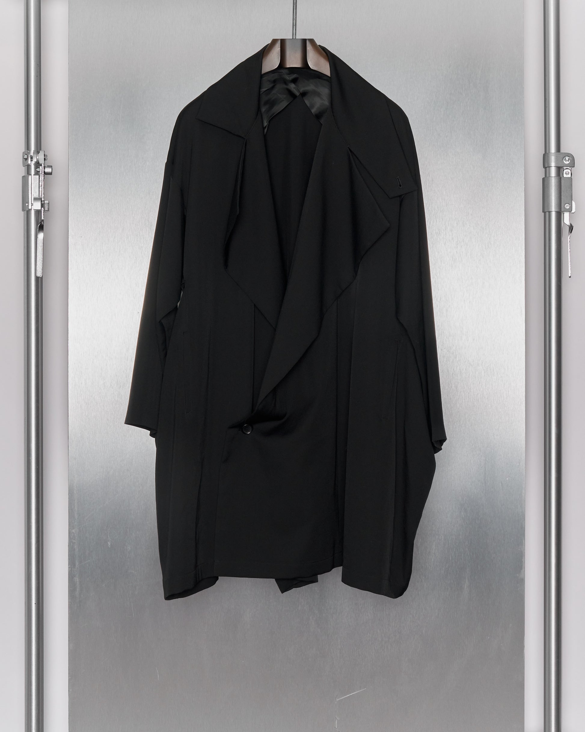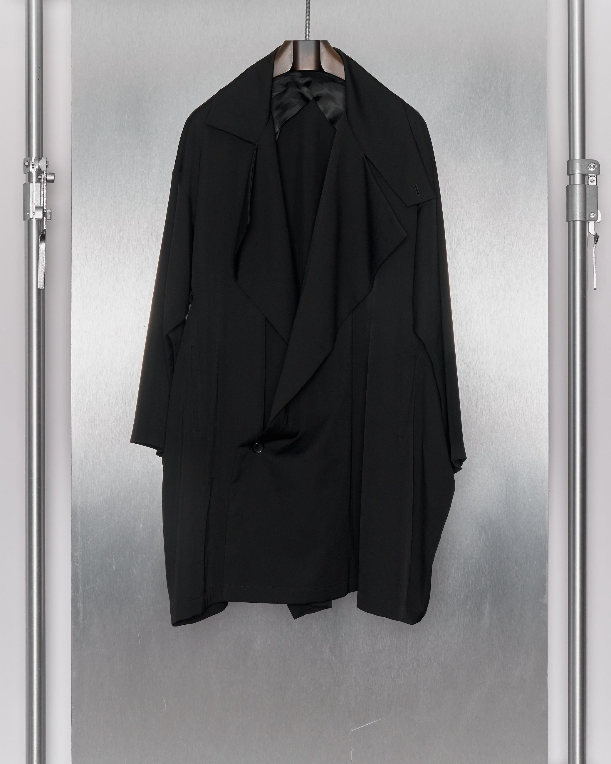 Boxy topcoat in flowing mid-weight wool with a soft drape. An oversized, drop shoulder silhouette which drapes the wearer like a blanket. Features a broad sculptural lapel with collar closure, low slung double-breast closure, two external and internal pockets, underarm vents, butterfly lining.